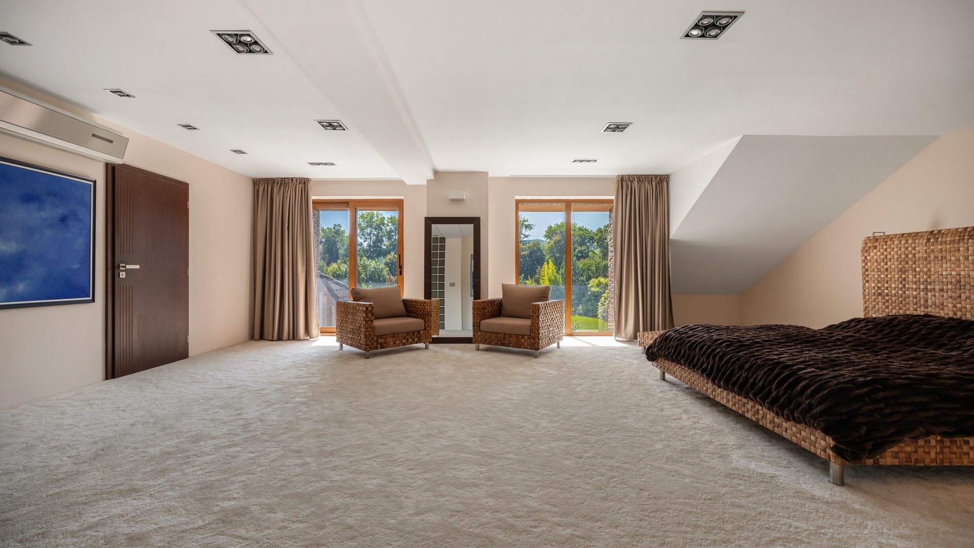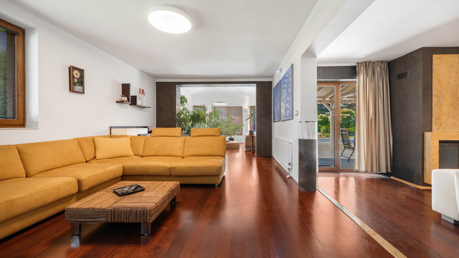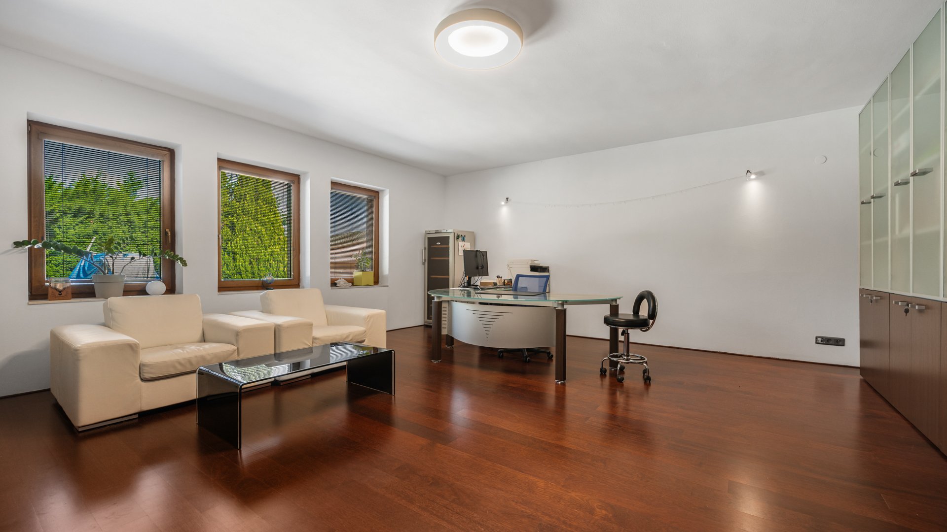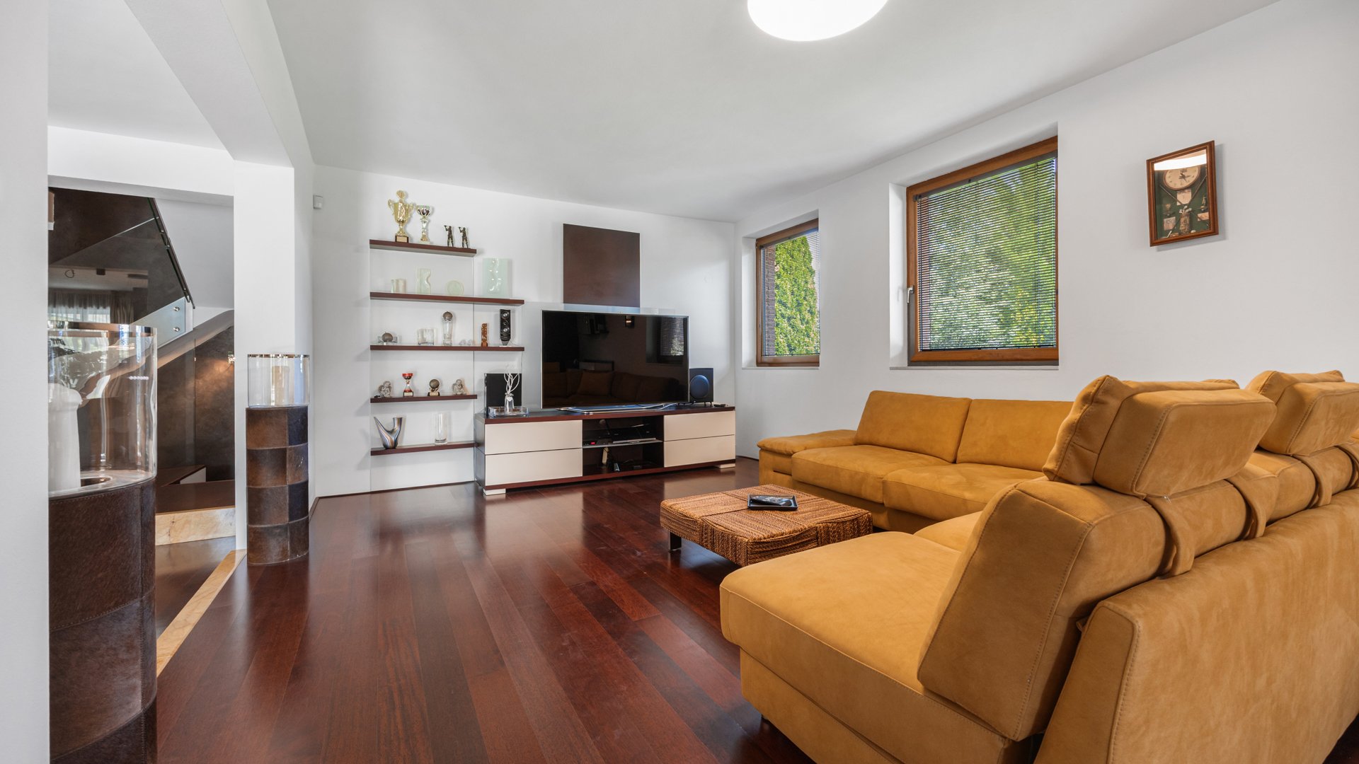 Nehnuteľnosť disponuje šiestimi izbami, z toho štyrmi spálňami a tromi kúpeľňami. Dispozícia domu spája praktickosť s komfortom a vytvára funkčne oddelené obytné, spoločenské aj oddychové zóny. Prízemie plynulo nadväzuje na exteriér a ponúka priestrannú obývaciu časť, lounge posedenie s krbom, zimnú záhradu a kompletne vybavenú kuchyňu so zabudovanými spotrebičmi. Suterén (80 m²) bol rozšírený o wellness zónu s fitness a saunou, technické priestory a sklad.