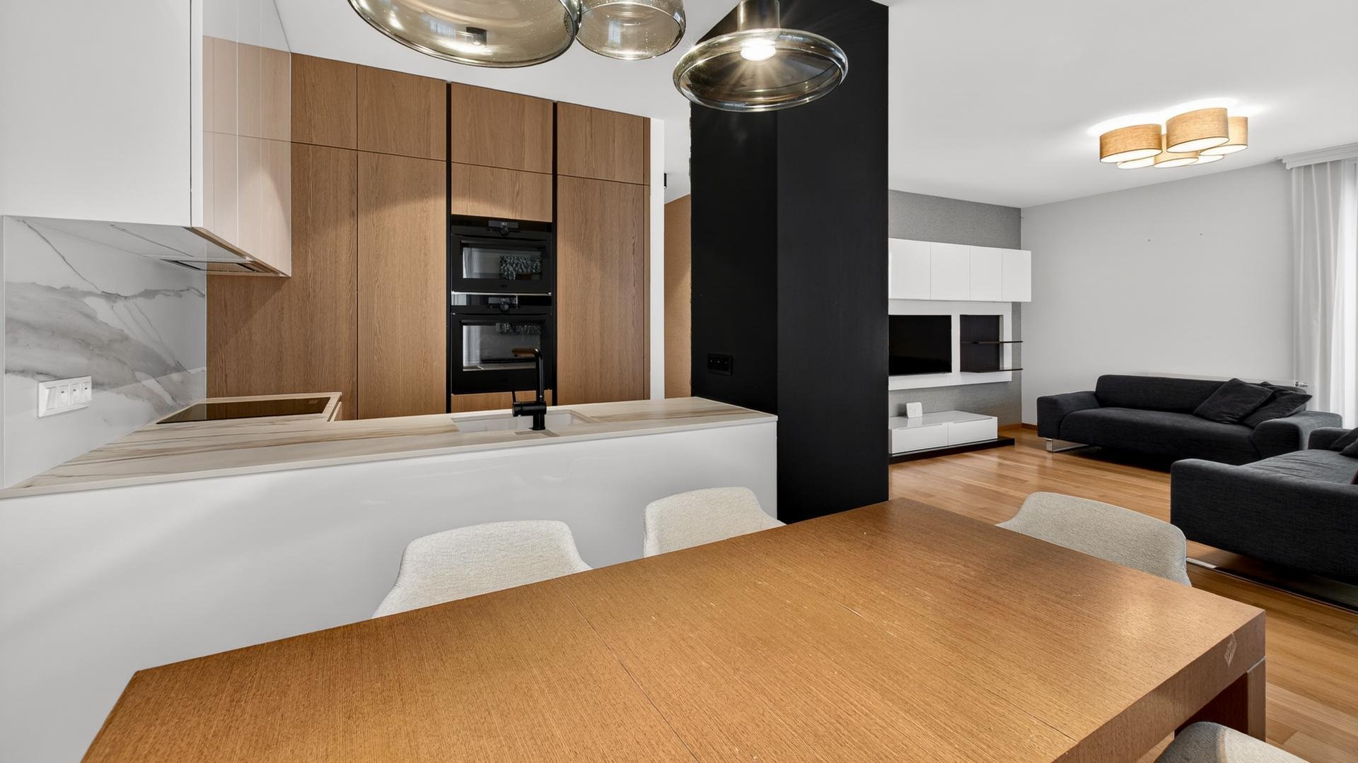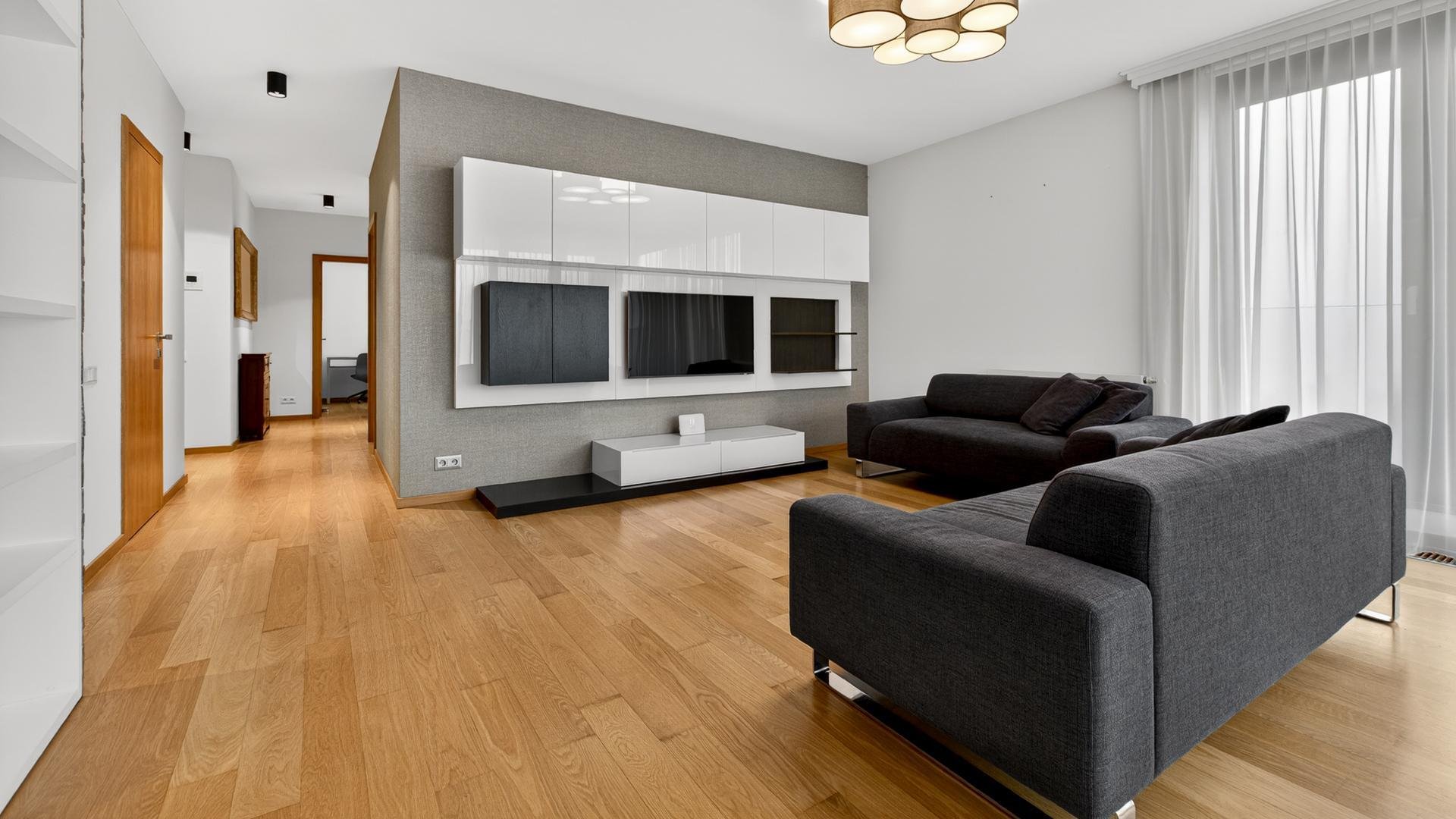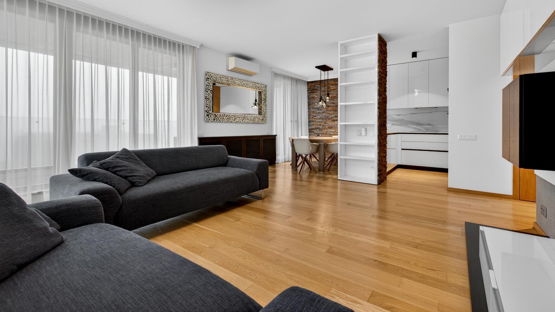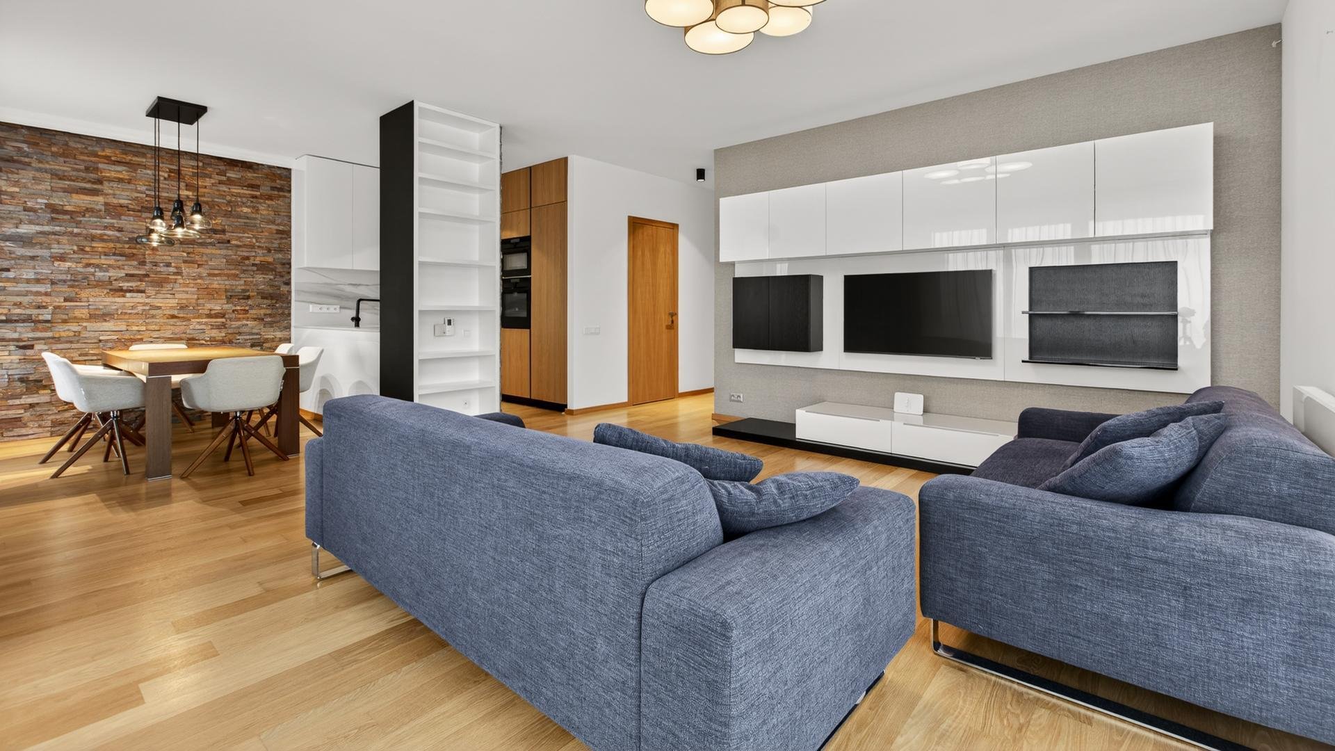 Dispozične byt pozostáva z otvoreného konceptu obývacej zóny, na ktorú plynule nadväzuje kompletne vybavená kuchynská linka so zabudovanými AEG spotrebičmi. Nočná časť ponúka dve spálne so vstavanými šatníkovými zostavami. Samozrejmosťou je kúpeľňa a samostatná toaleta. Nový nájomca určite ocení aj technickú miestnosť s práčkou a sušičkou.