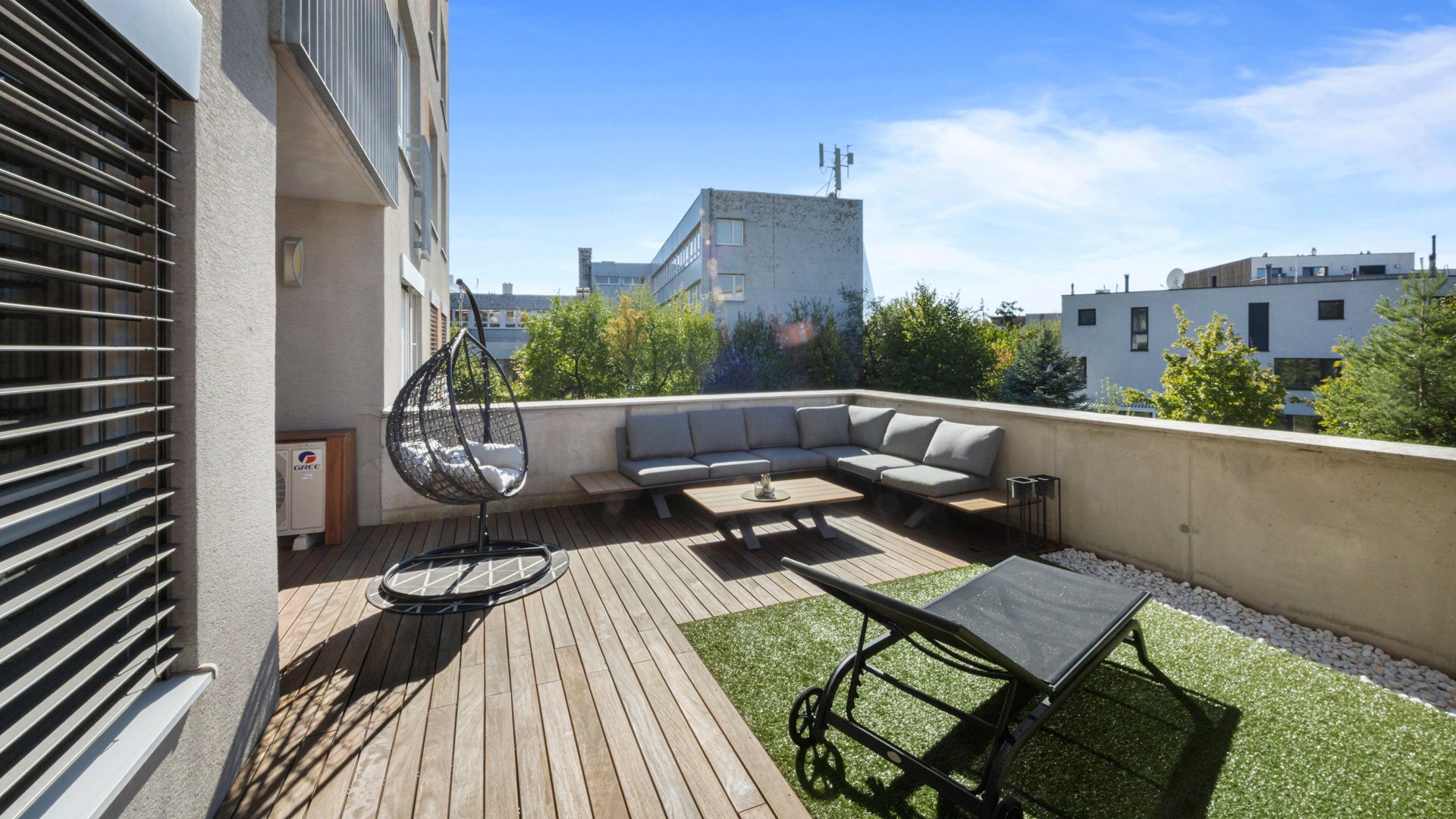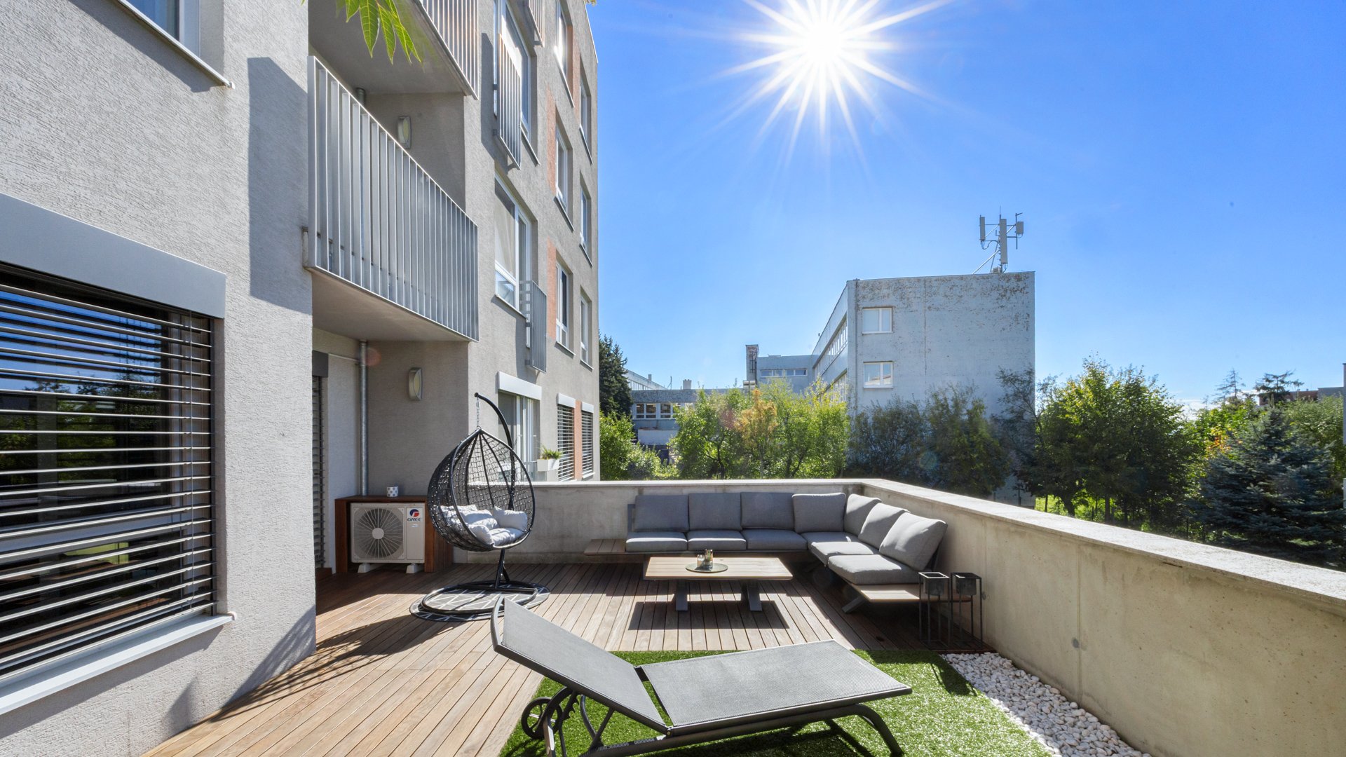Byt sa ponúka kompletne zariadený vrátane vstavaných šatníkových zostáv, práčky so sušičkou a záhradného nábytku. Štandard zahŕňa klimatizáciu, bio krb, k bytu prináleží pivničná kobka.