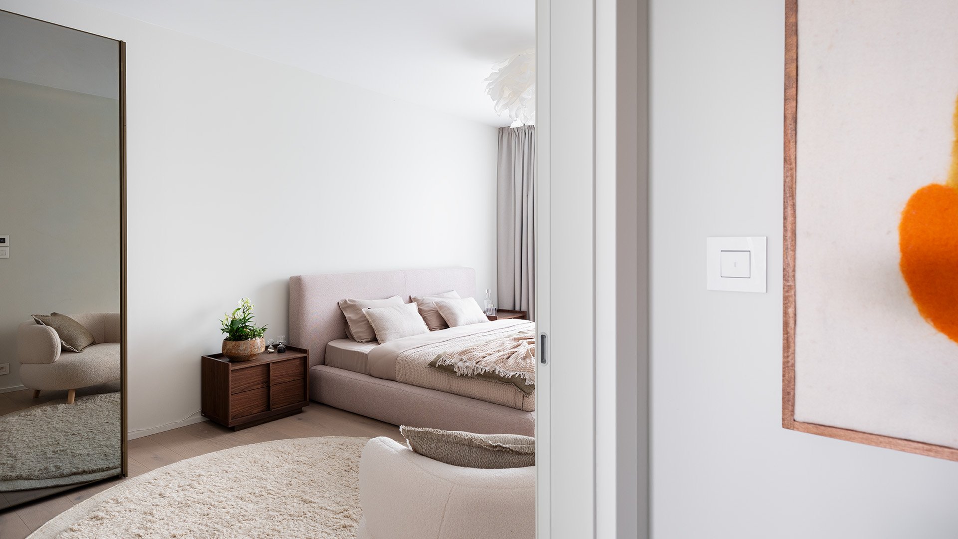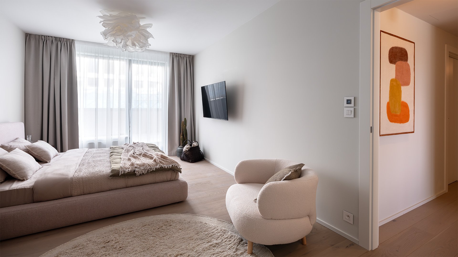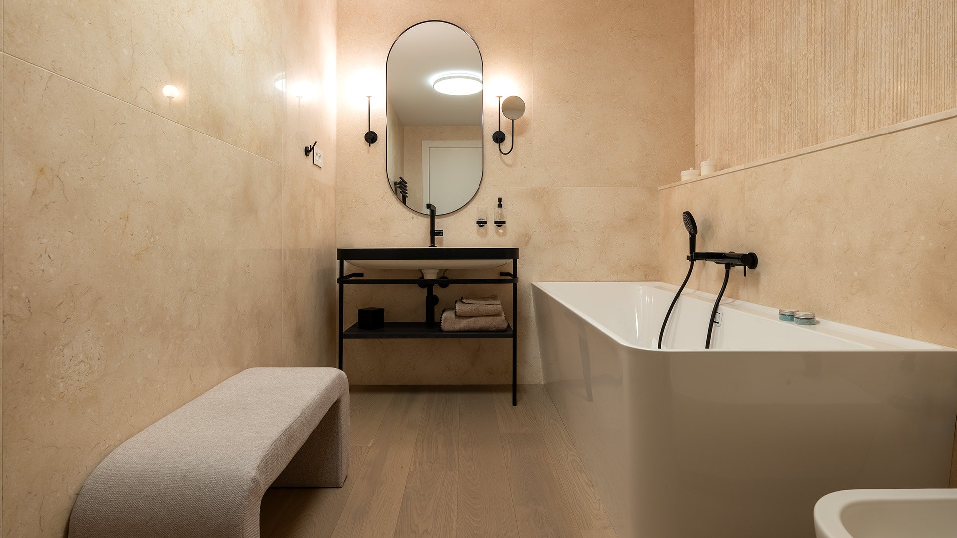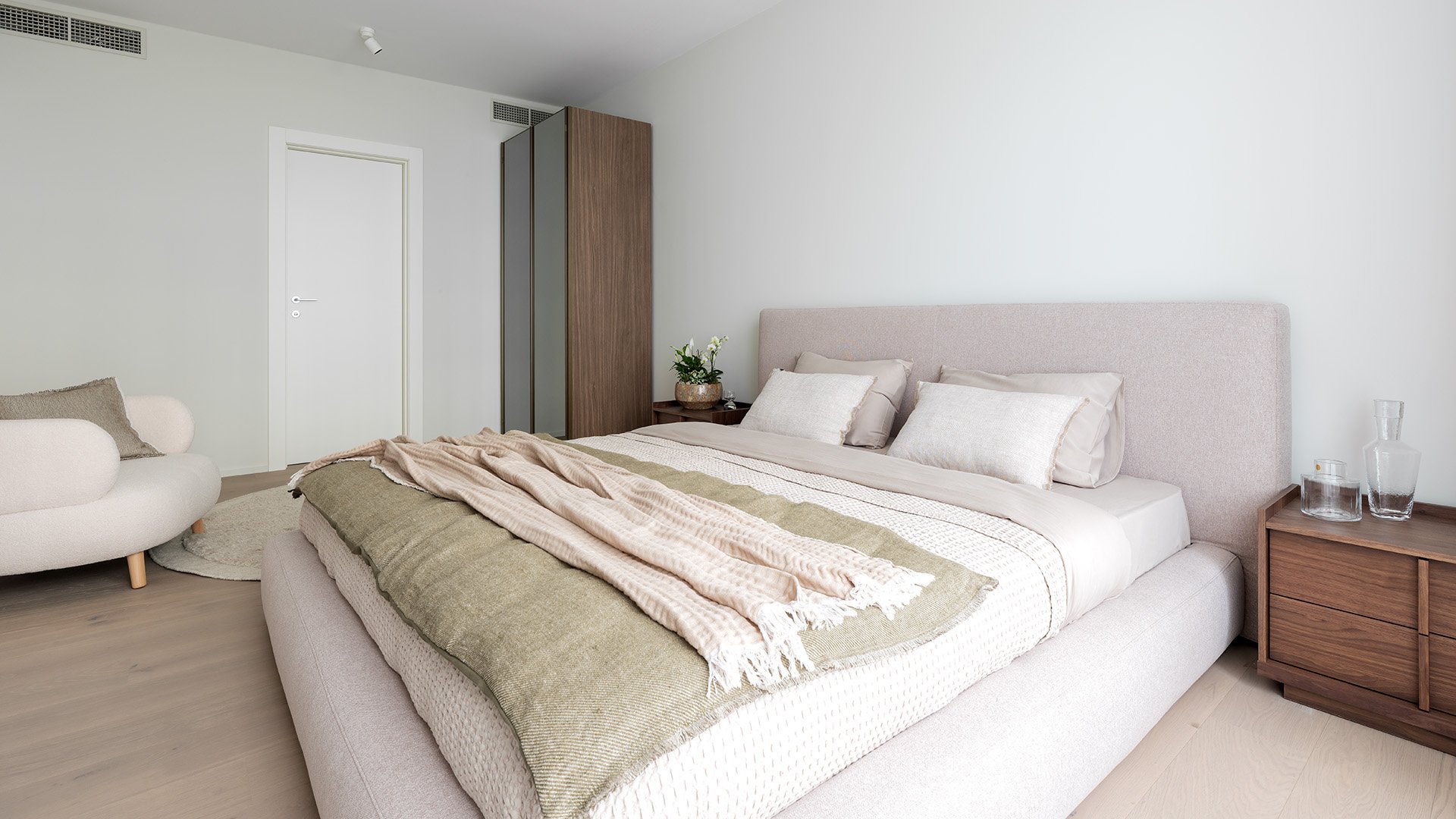 The night area consists of three bedrooms, with the master bedroom featuring an en-suite bathroom. Each room has direct access to a north-facing terrace with a peaceful courtyard atmosphere. Premium finishes continue in the bathrooms, featuring natural travertine, sanitary ware by Villeroy & Boch, Laufen, and Duravit, complemented by designer faucets from Grohe and Hansgrohe, smart toilets, and Haomy accessories.