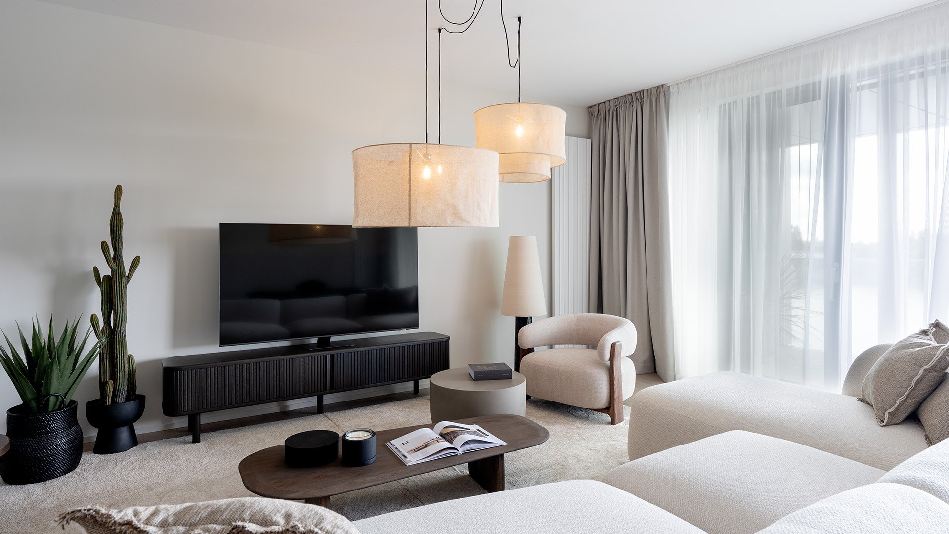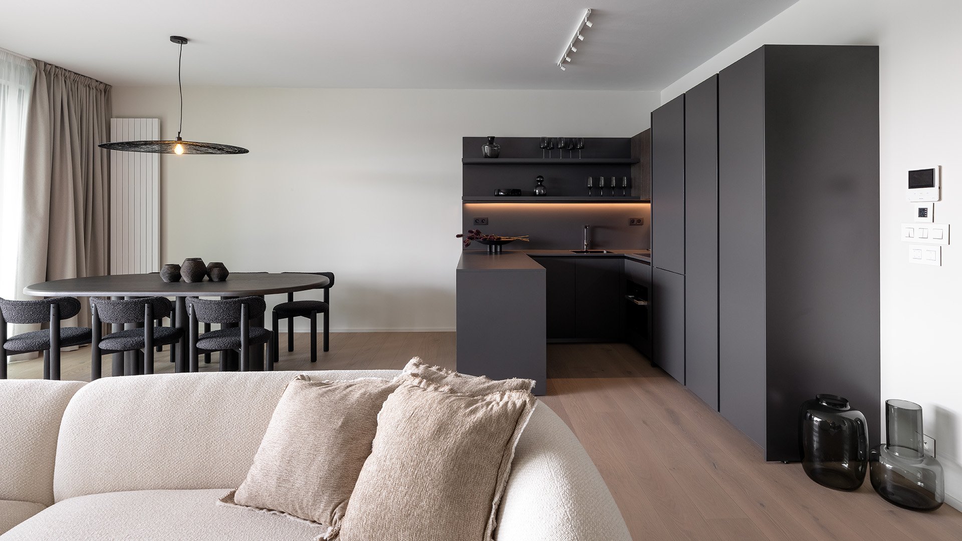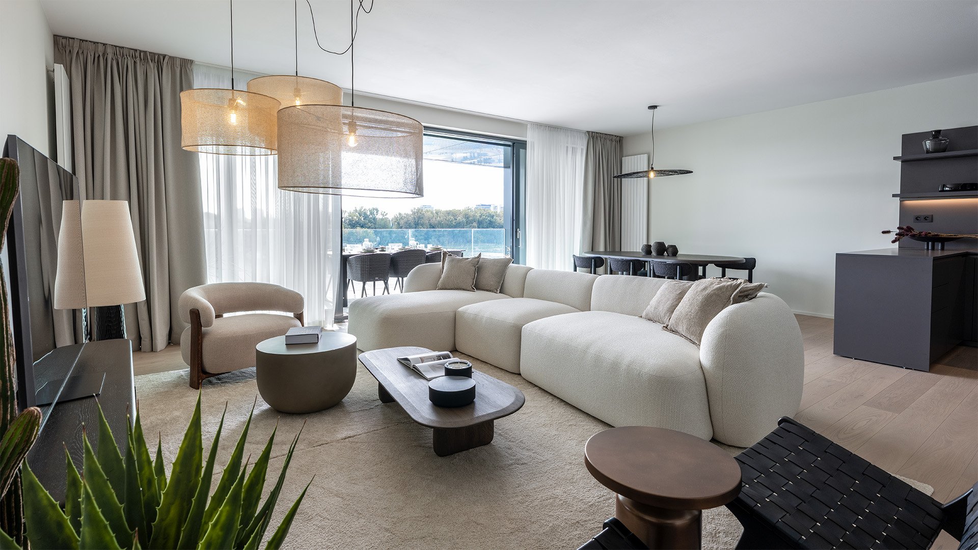 The living area spans a generous 48 sqm and is designed as an open concept with an elegant Molteni&C kitchen featuring built-in Miele appliances, seamlessly flowing into the living room furnished with stylish Kave Home pieces. The south-facing covered loggia with glass balustrades offers uninterrupted views of the Danube and the greenery of the promenade.