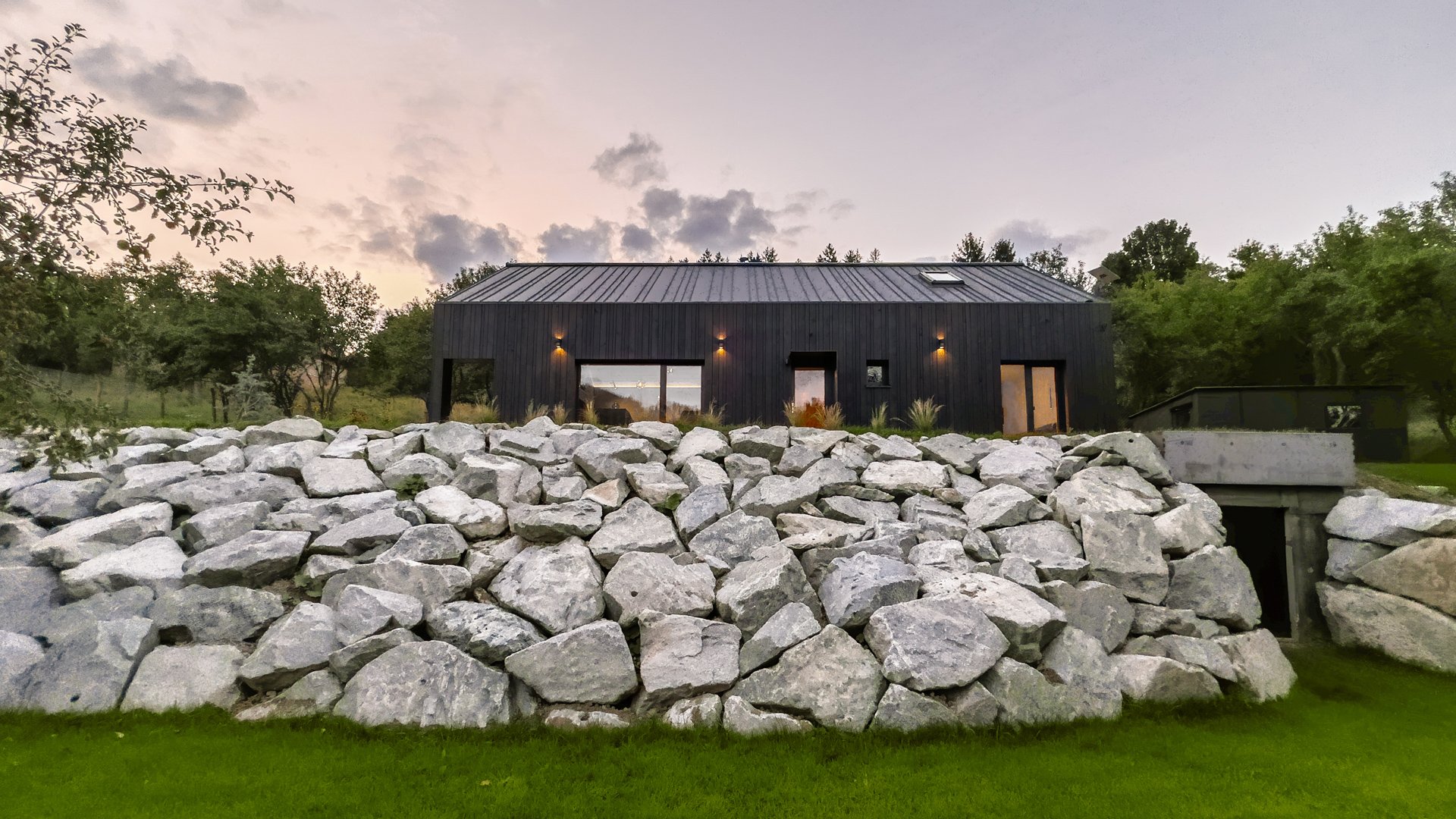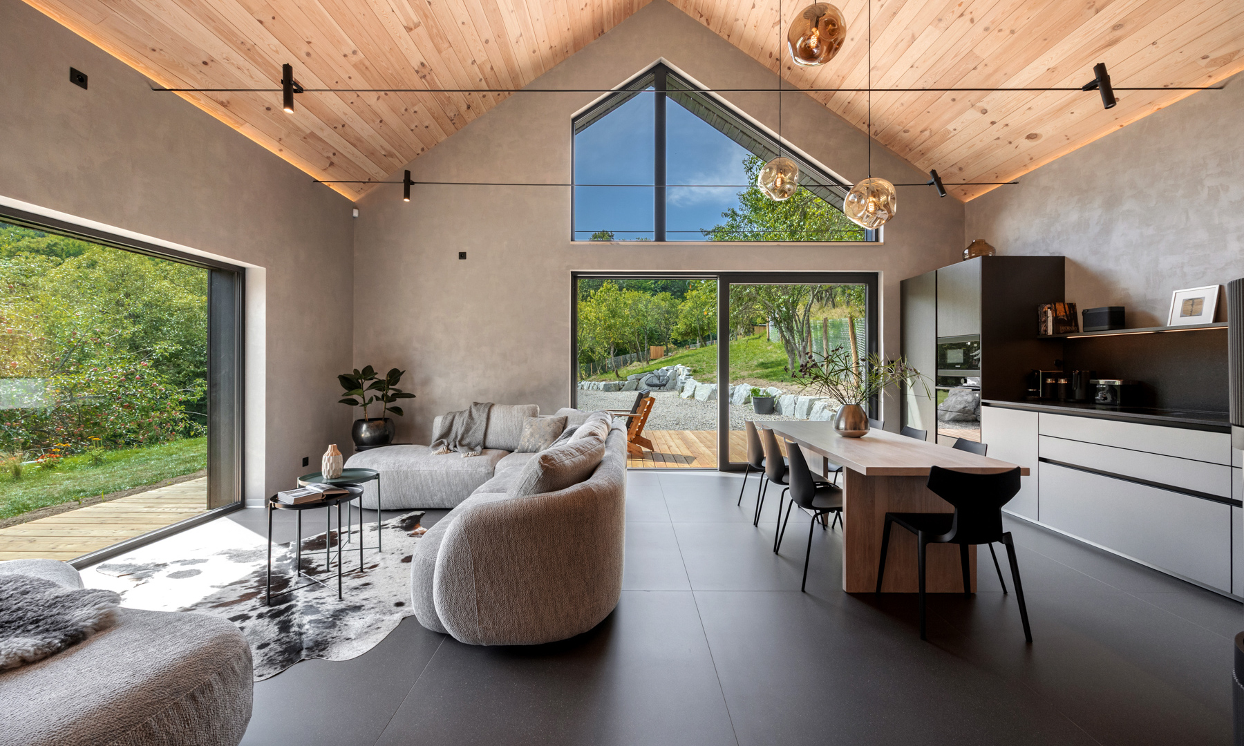 The interior has been conceived with a focus on clean lines, natural light, and high-quality materials. The combination of wood, concrete finishes, and a balanced colour palette creates a harmonious and timeless atmosphere. The property is technically above standard – equipped with electric underfloor heating supplemented by radiators, wood-burning stove, air conditioning, its own well with filtration, as well as an alarm and camera system.