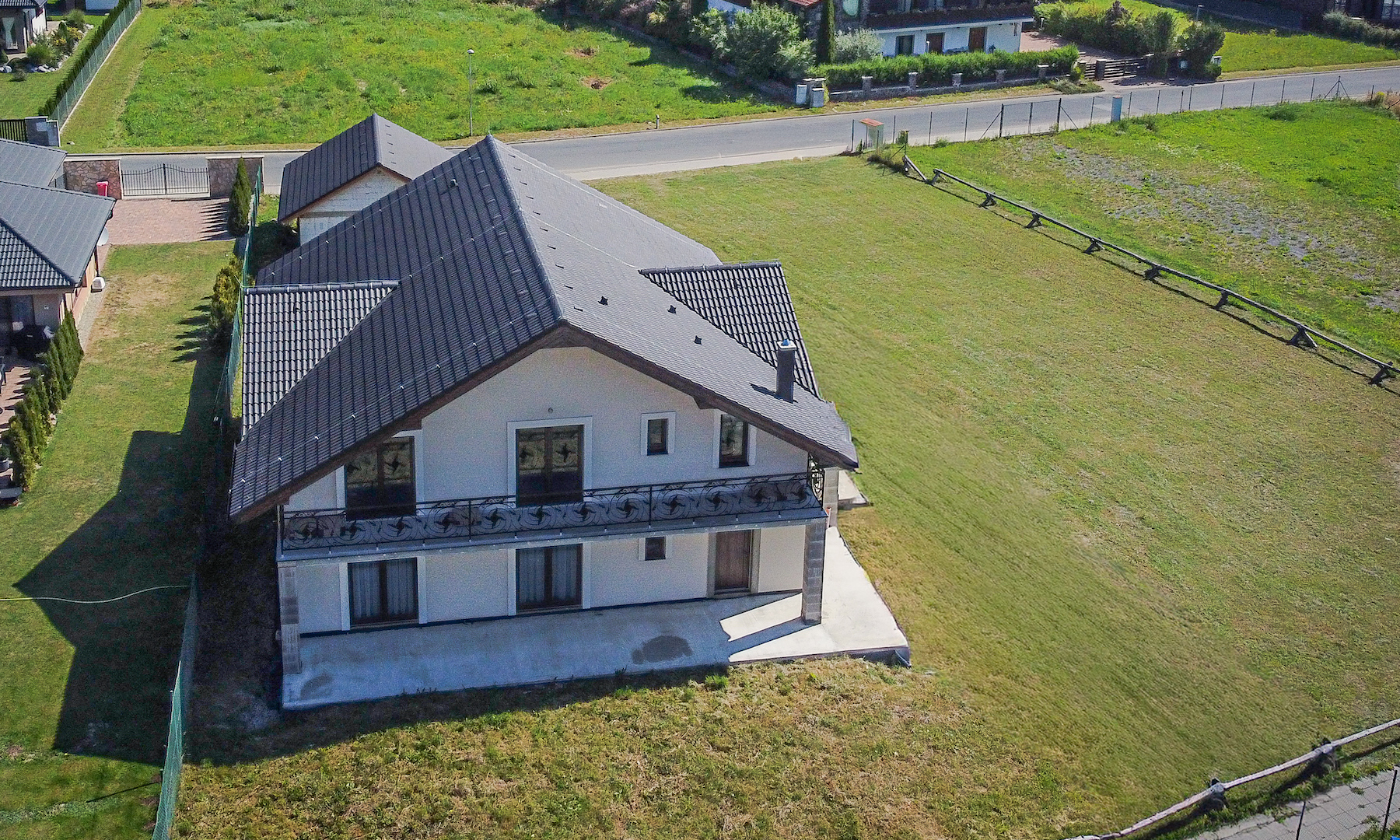 The sun-drenched, level 970 sqm plot offers ample space for creating a private relaxation zone with the possibility of adding a swimming pool or an outdoor kitchen. Parking is provided by two garage spaces and two additional exterior spaces on the property.