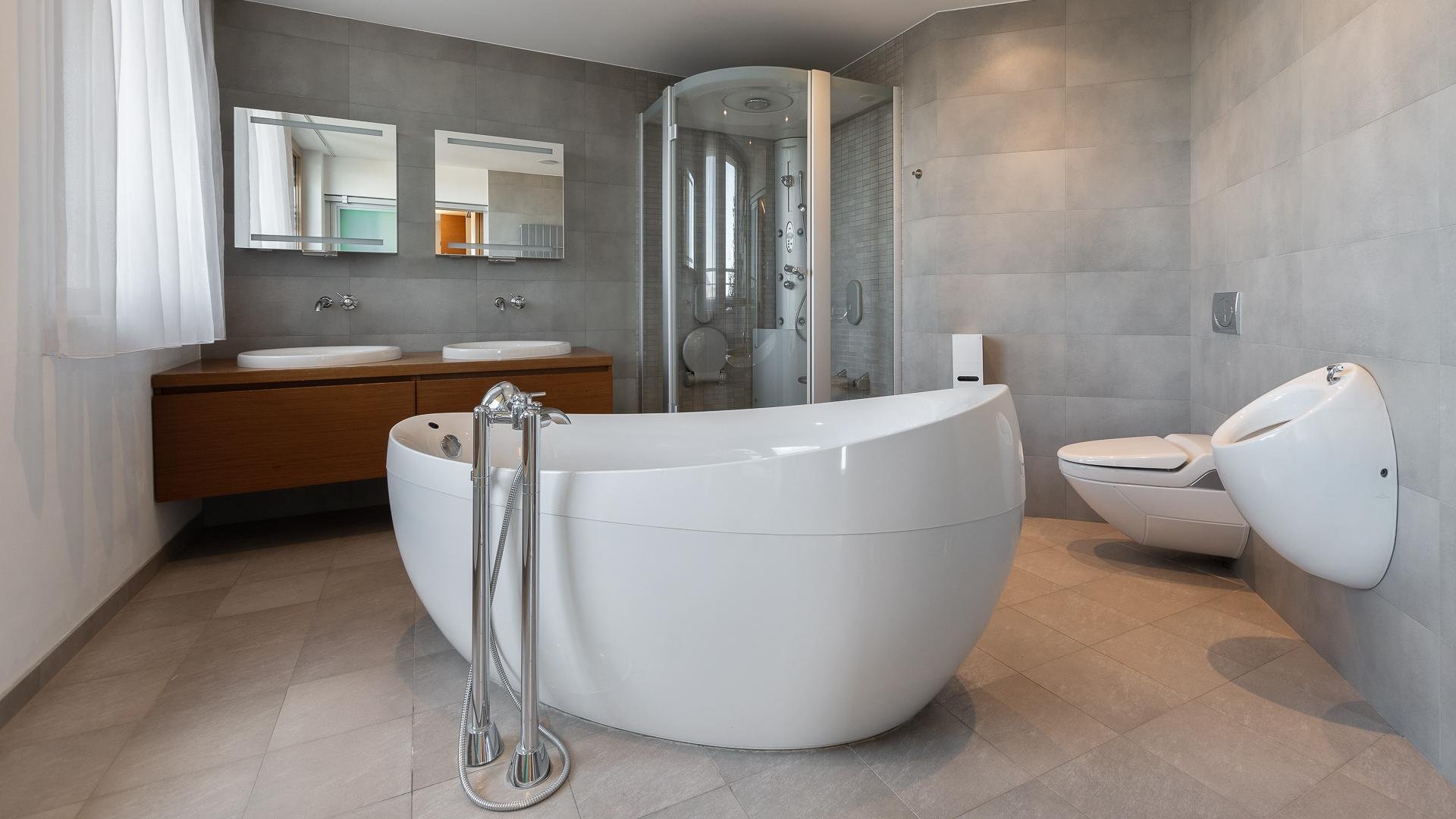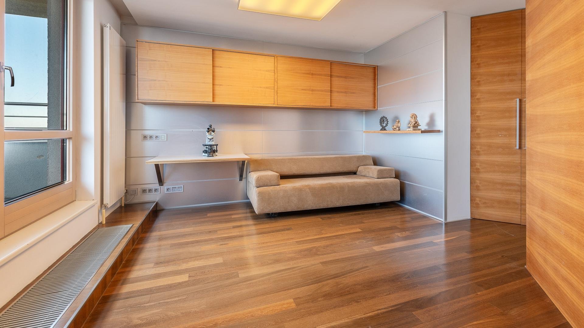 The upper floor (27th) forms the night zone with three bedrooms, each with its own access to a private terrace. The master bedroom impresses with its exceptional space, designer bathroom featuring a solitaire bathtub, hydromassage shower, and an elegant walk-in wardrobe with a glass entrance. The two additional bedrooms are perfect as children’s rooms or home offices and each has its own en-suite bathroom.