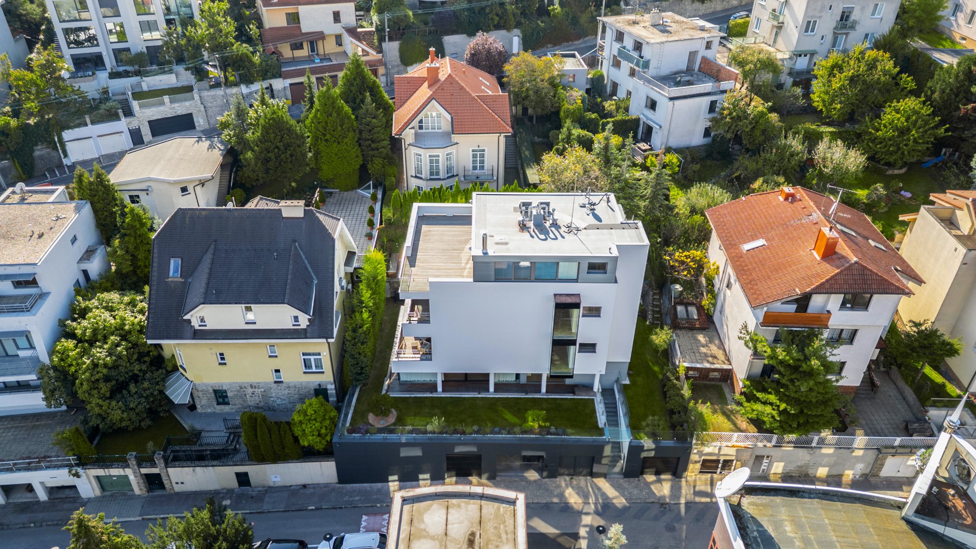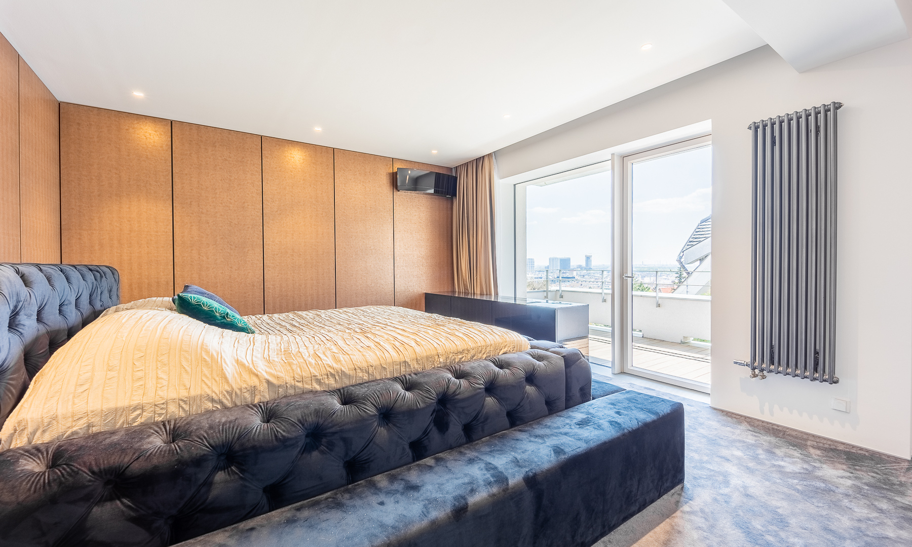 On the fourth floor there is a master bedroom with a generous wardrobe and a private bathroom. There are also two bedrooms, a bathroom, a storage room and a separate wardrobe. The top floor consist of a bright room with its own kitchen, wardrobe and toilet and can be ideal for teenagers in the necessary privacy or study for the owner. This recessed floor offers a spacious terrace with an area of 65 sqm with a magnificent view of the city and its dominant Bratislava Castle.