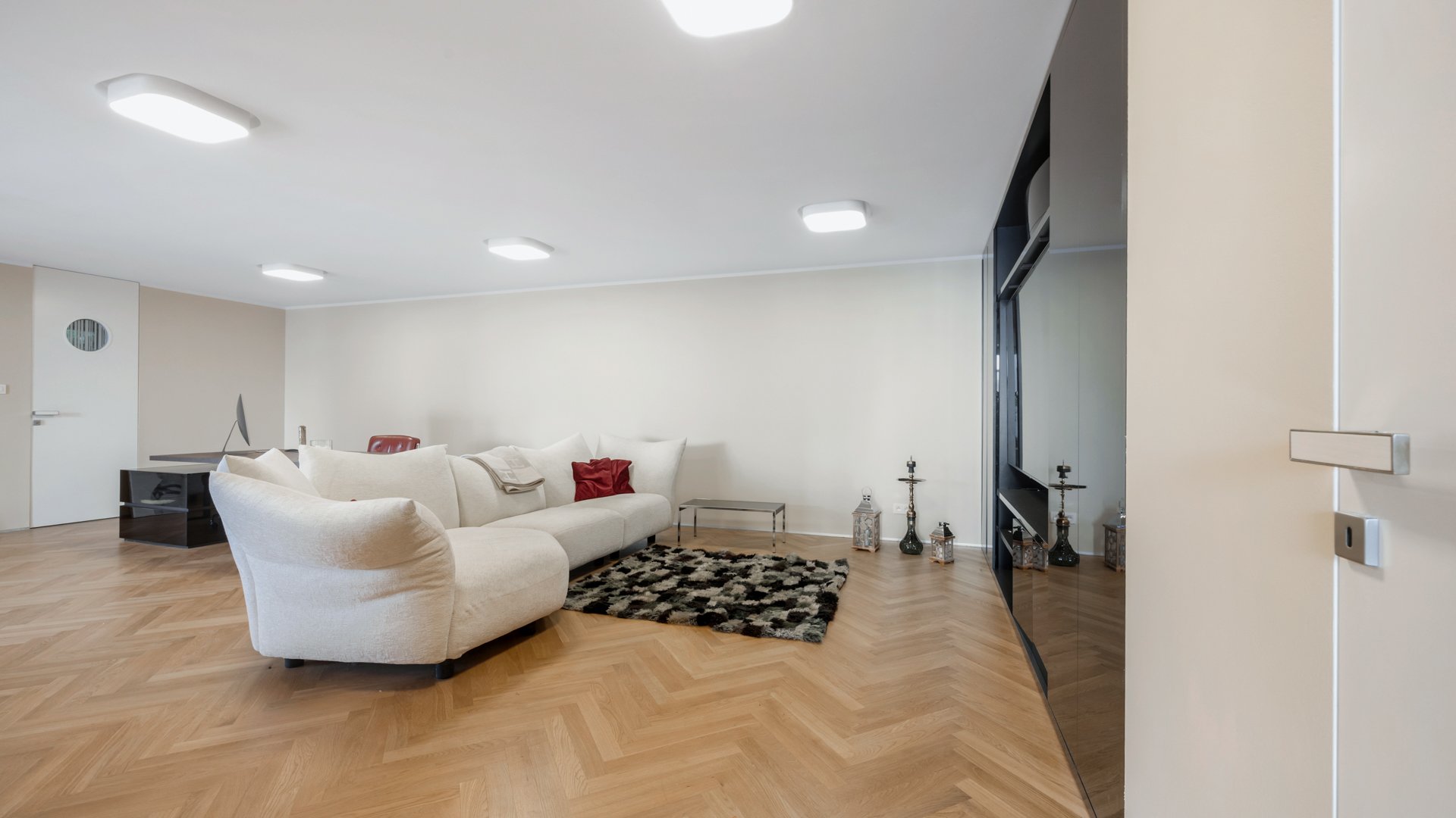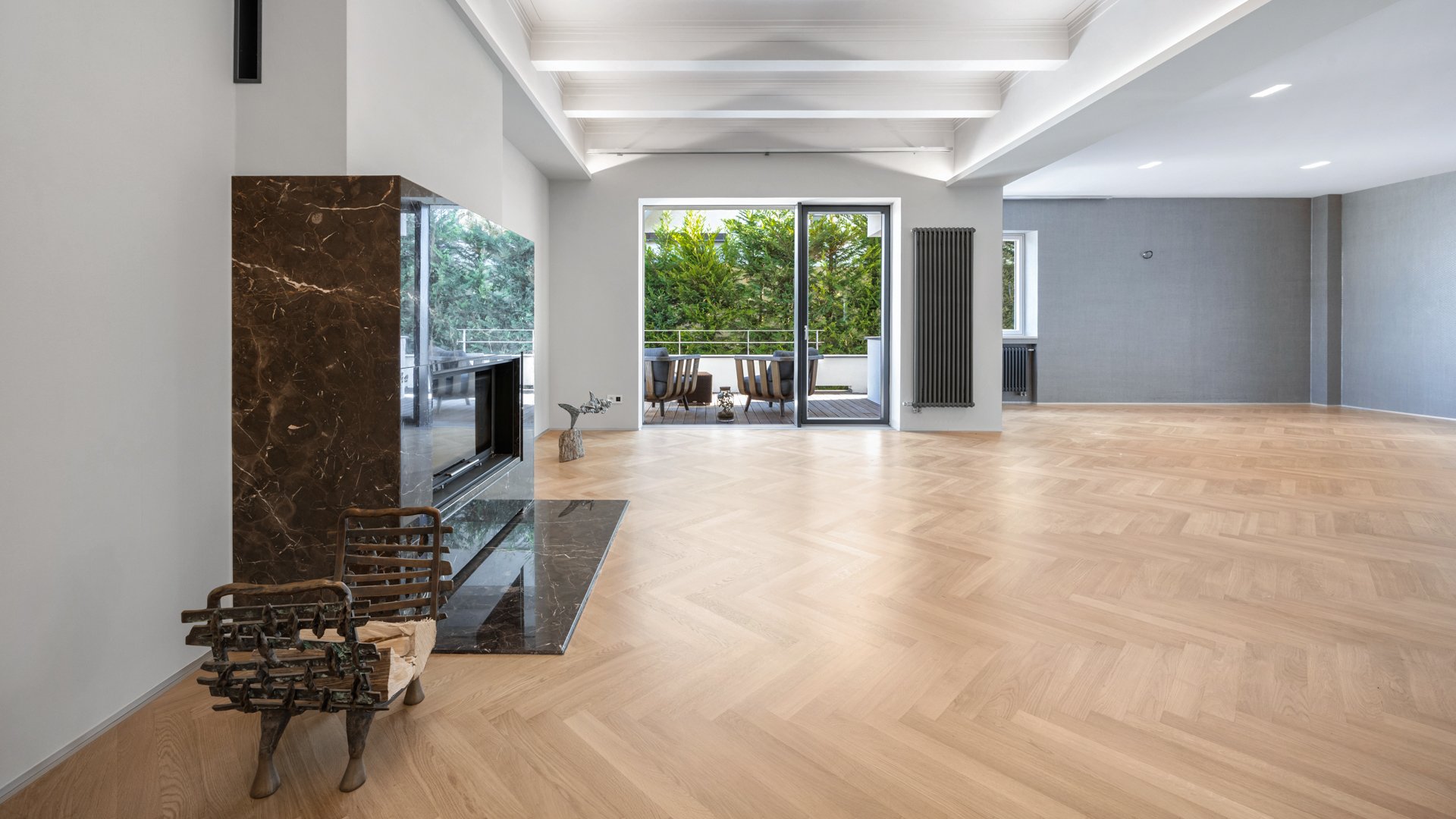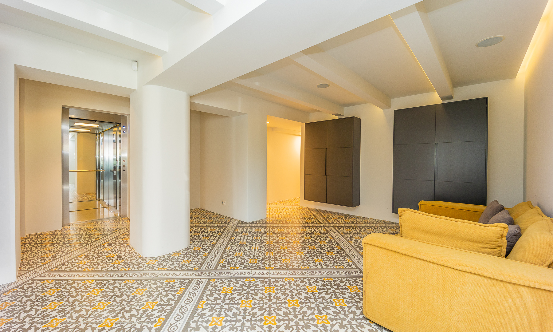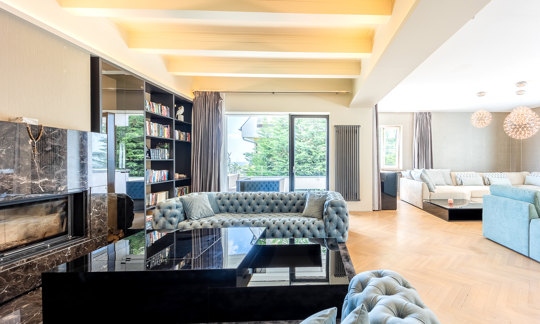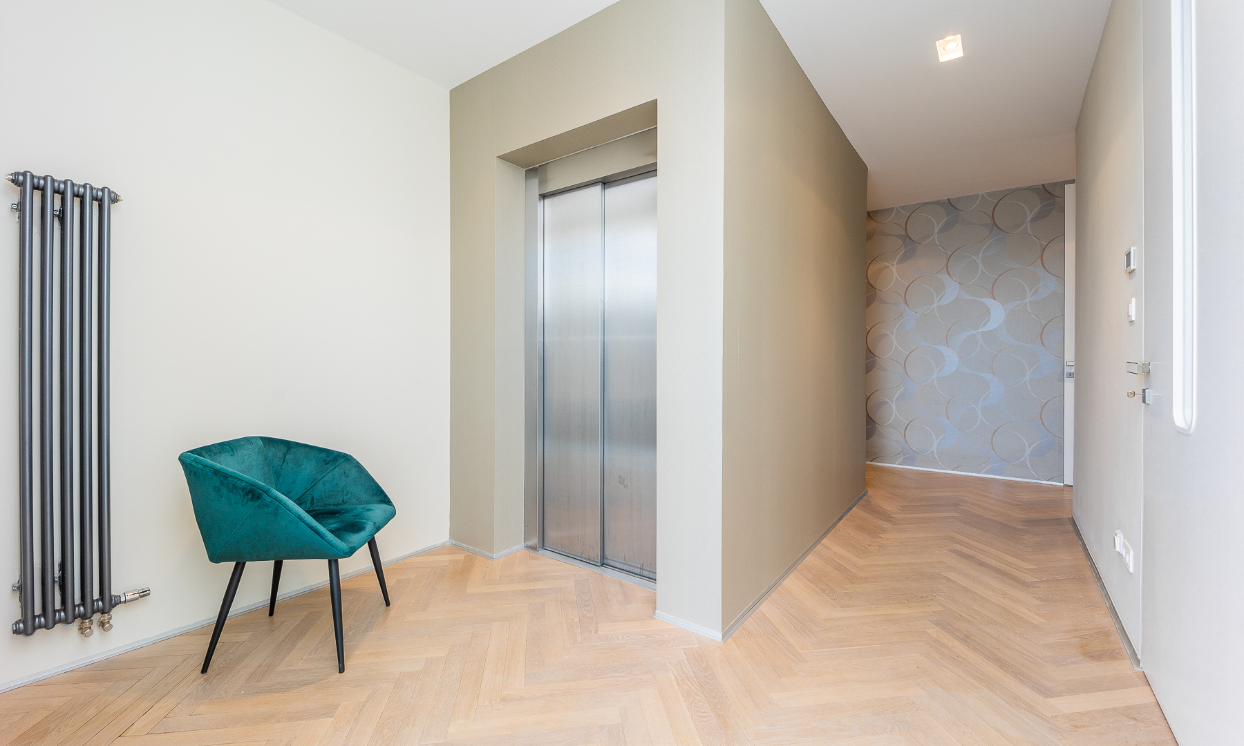 On the third floor there is a spacious living room which has a pleasant relaxation area with a fireplace, a library and comfortable seating in pastel tones. The social area also has a dining room with a passage to the kitchen with pantry. The kitchen is fully equipped with Miele appliances. It benefits with direct access to the sun terrace with swimming pool, which despite the fact that the property is located in the Old Town, offers plenty of privacy. The truly generous space of the social area with an area of 70 sqm offers a timeless combination of modern design in combination with a touch of old town housing underlined by for example wooden parquet in the shape of “herringbone”.