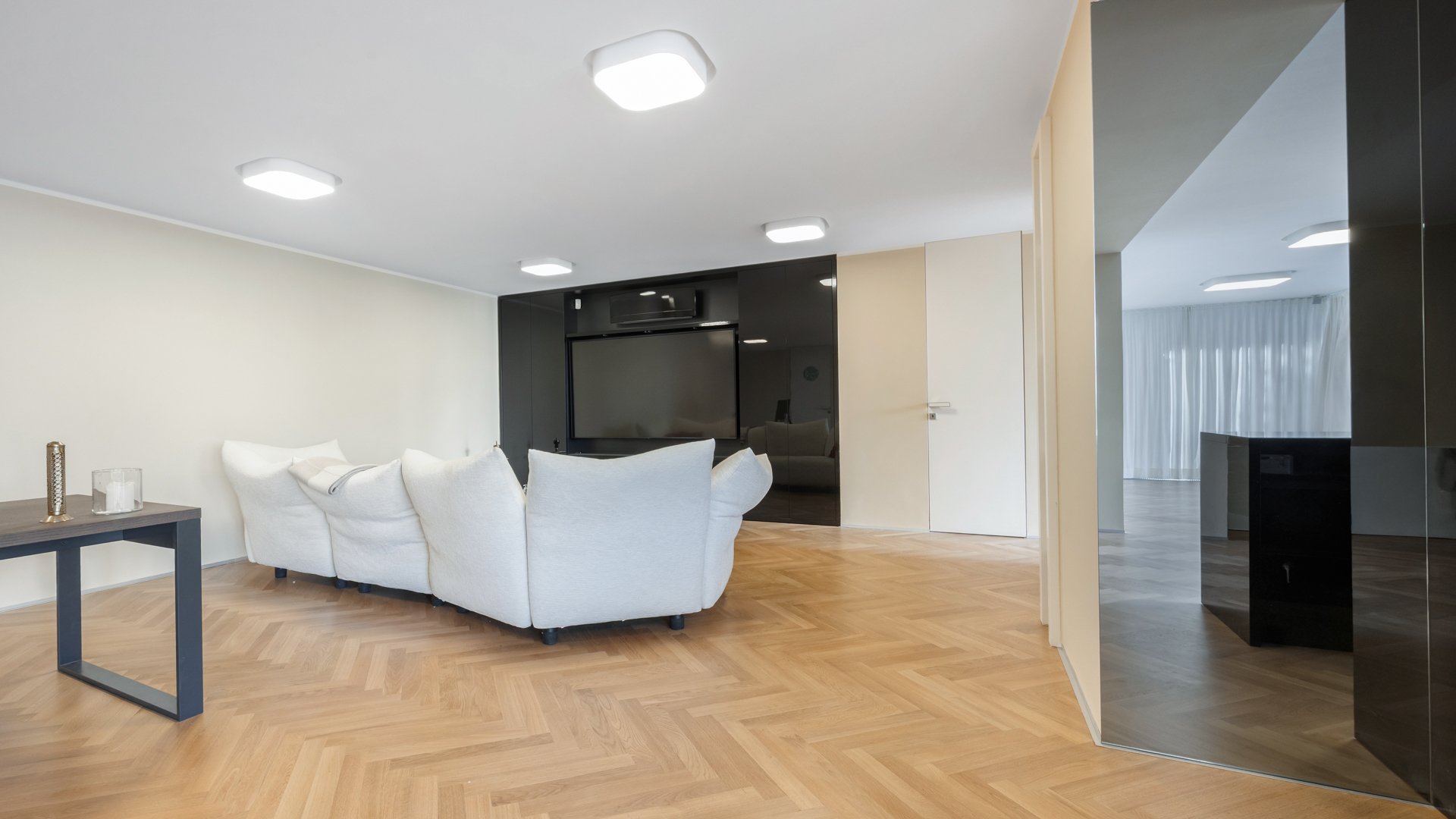 The interior corresponds to a renovated functionalist town villa. The main urban and architectural concept as well as the material solution is based on the use of similar quality materials such as wood, stone, Josko windows or the new insulated aluminium garage doors from Hörmann. For maximum safety and security, the villa is armed with a security system and an intelligent villa solution.