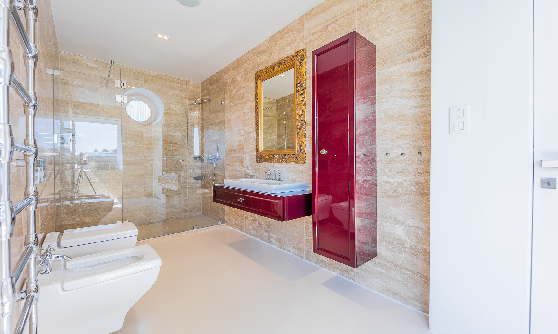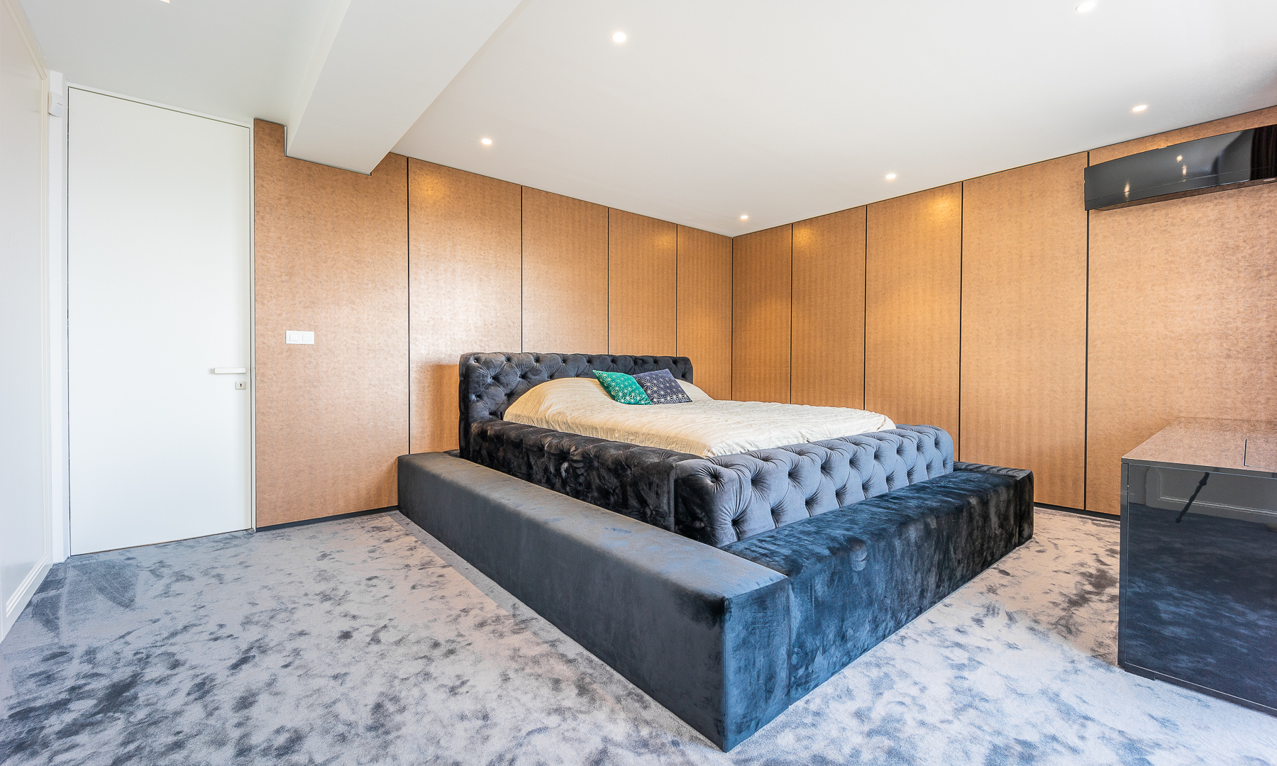 The second floor is dedicated to the relaxation and work area which includes a home cinema, a Finnish sauna with facilities, a bar area and a study with direct access to the terrace which seamlessly connects the interior with the exterior. There is also a technical background of the villa (technical room, laundry). The whole space is built with largewindows, thanks to them the whole space seems airy, with plenty of daylight.
