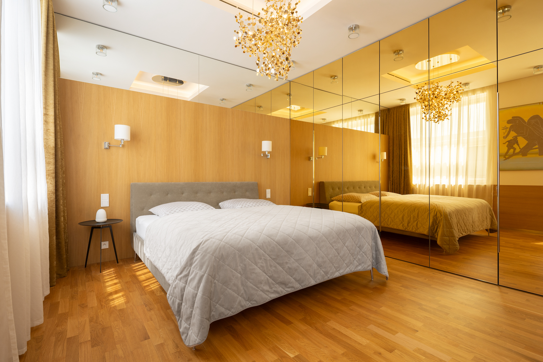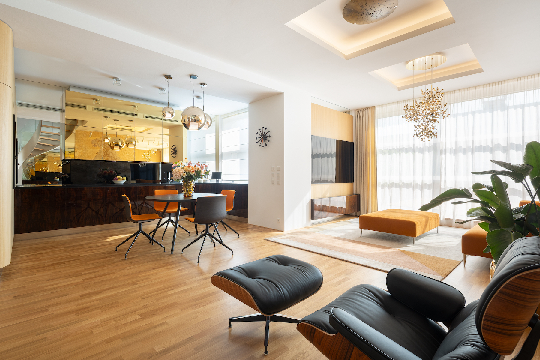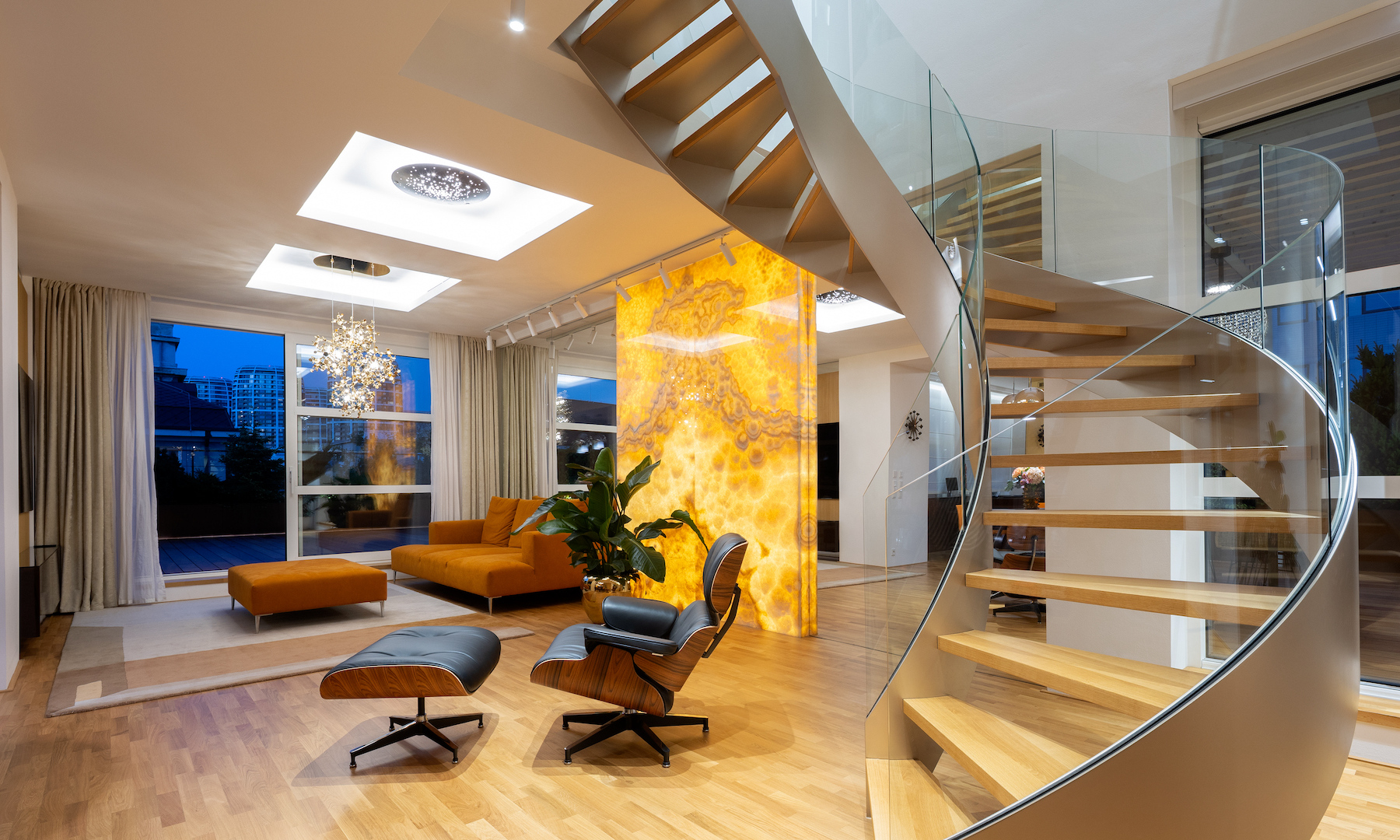 The interior was entirely custom-built with a strong emphasis on craftsmanship and premium materials such as natural oak, high-gloss walnut burl, black granite, onyx, bronze and polished stainless steel. Timeless design pieces include The Eames Lounge Chair and Ottoman, Orange Slice Chair and Footstool by Pierre Paulin, Vitra Eames DSR Chairs, The Arper Catifa Collection dining table by Lievore Altherr Molina, and T-Gong nightstands by Giuseppe Bavuso.