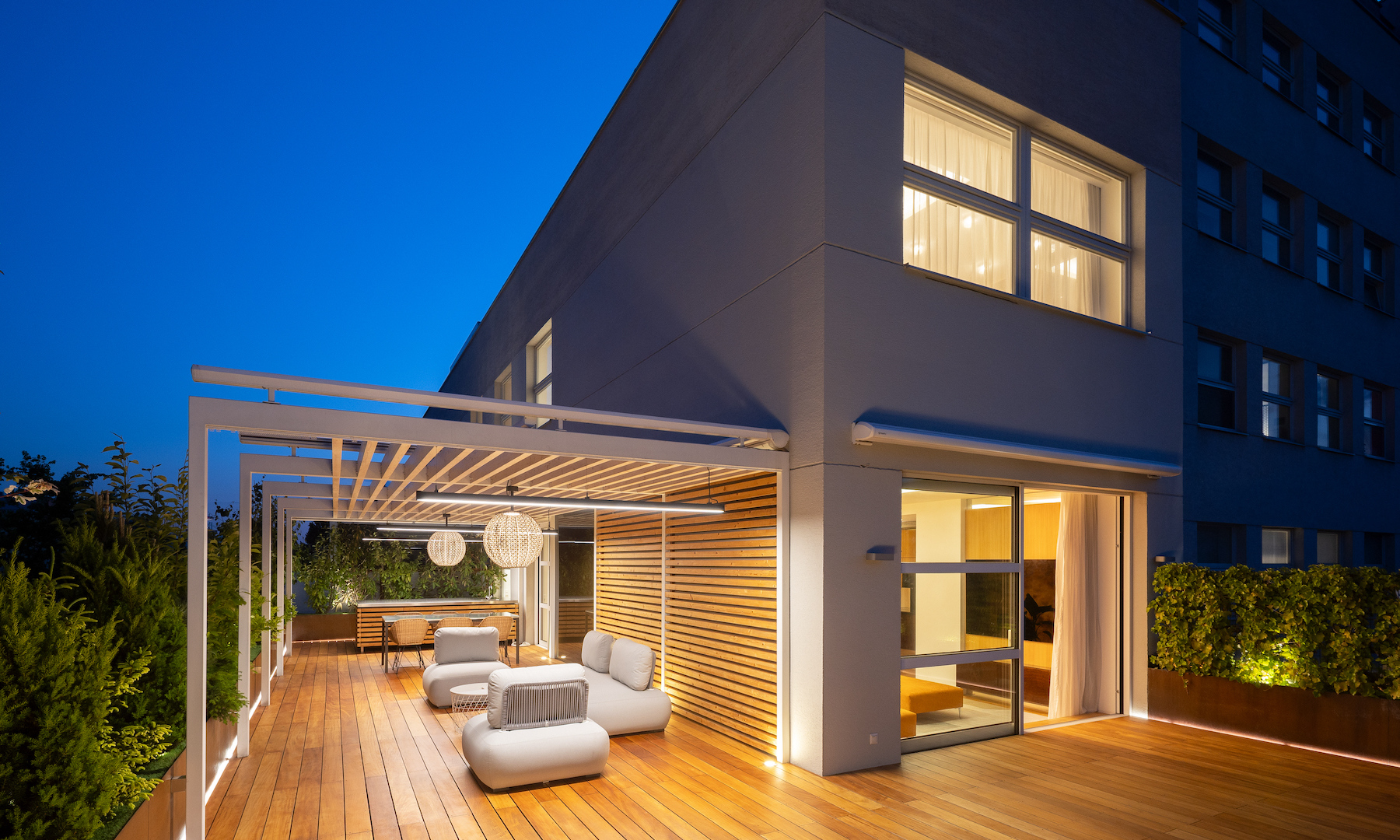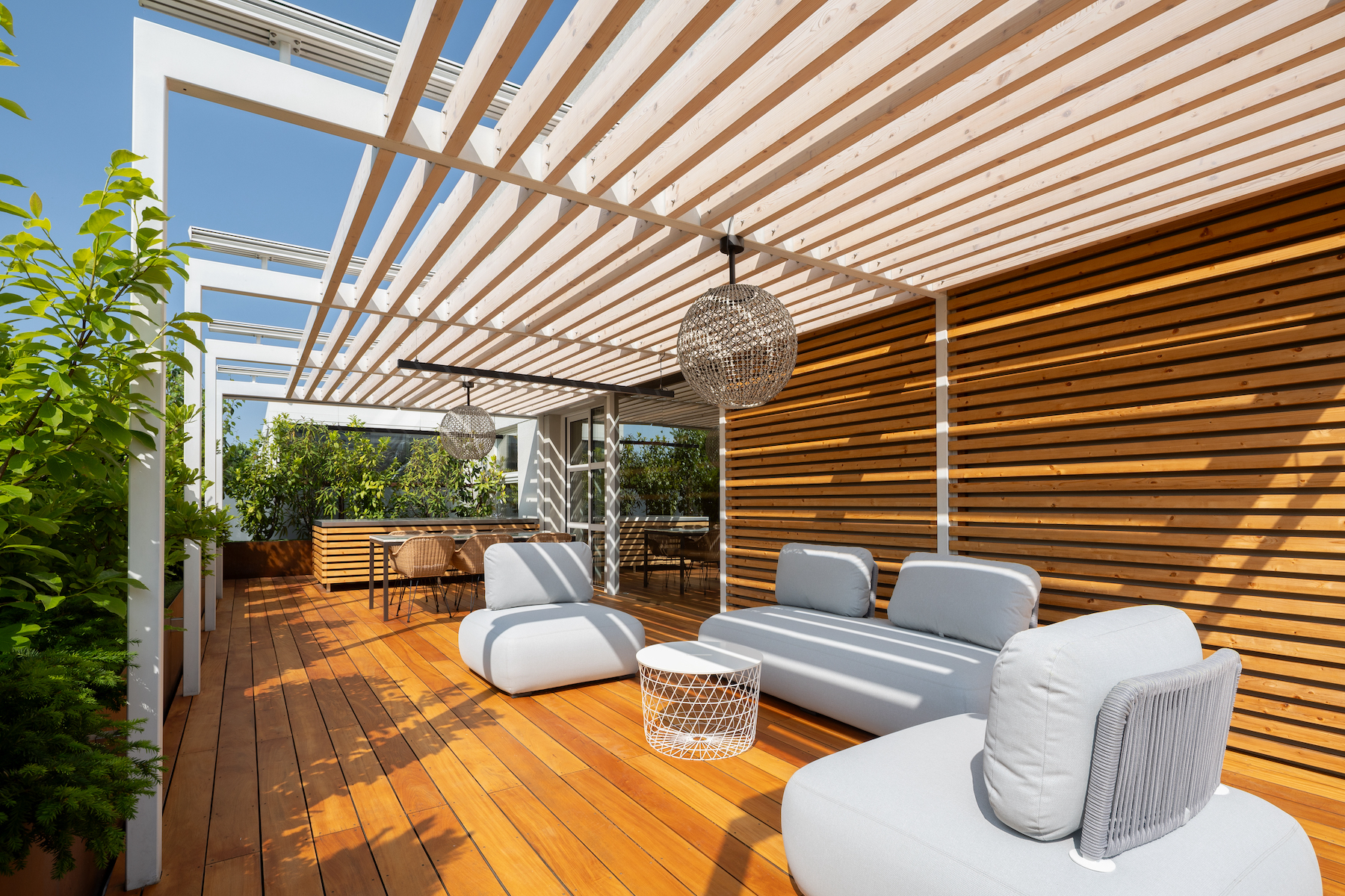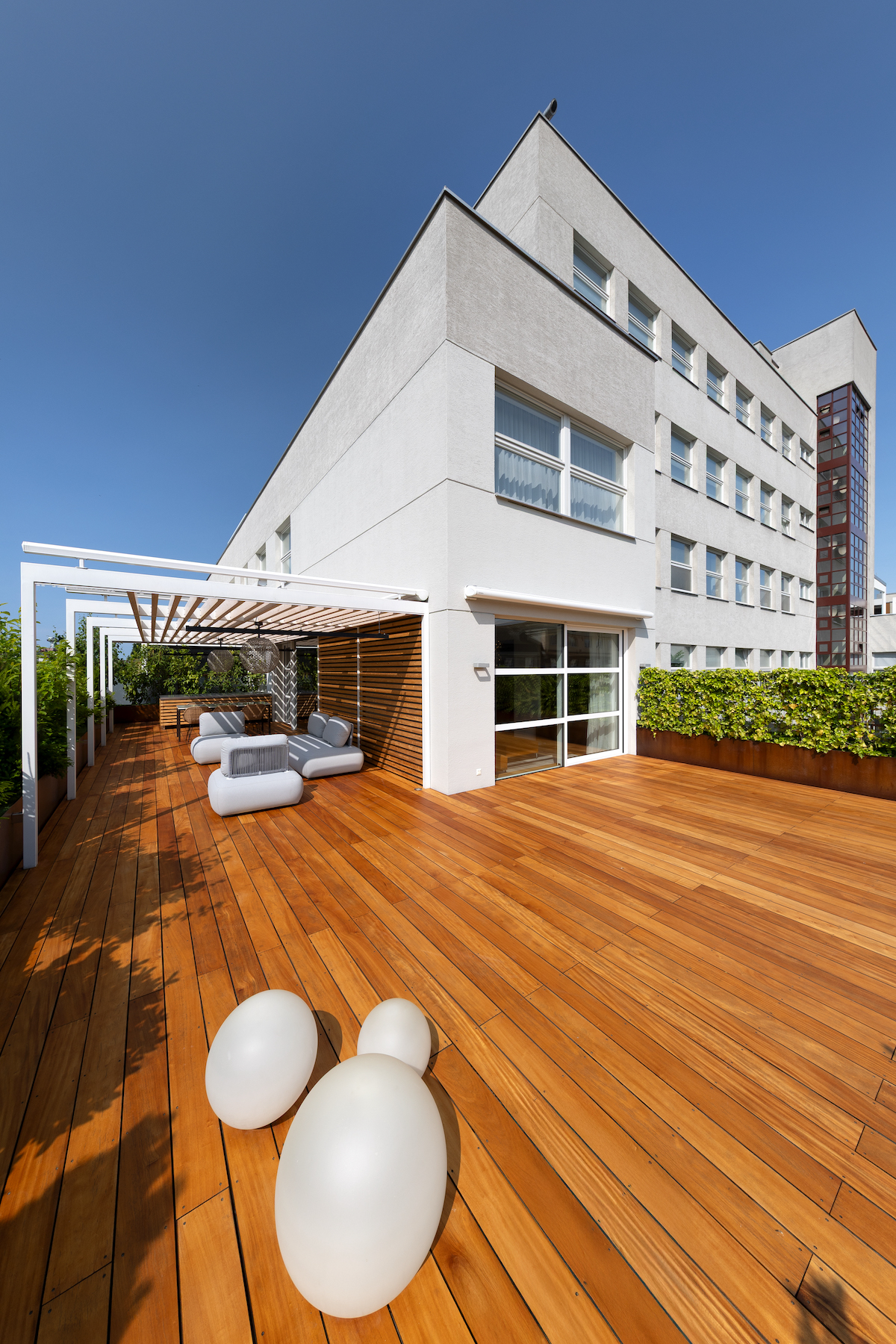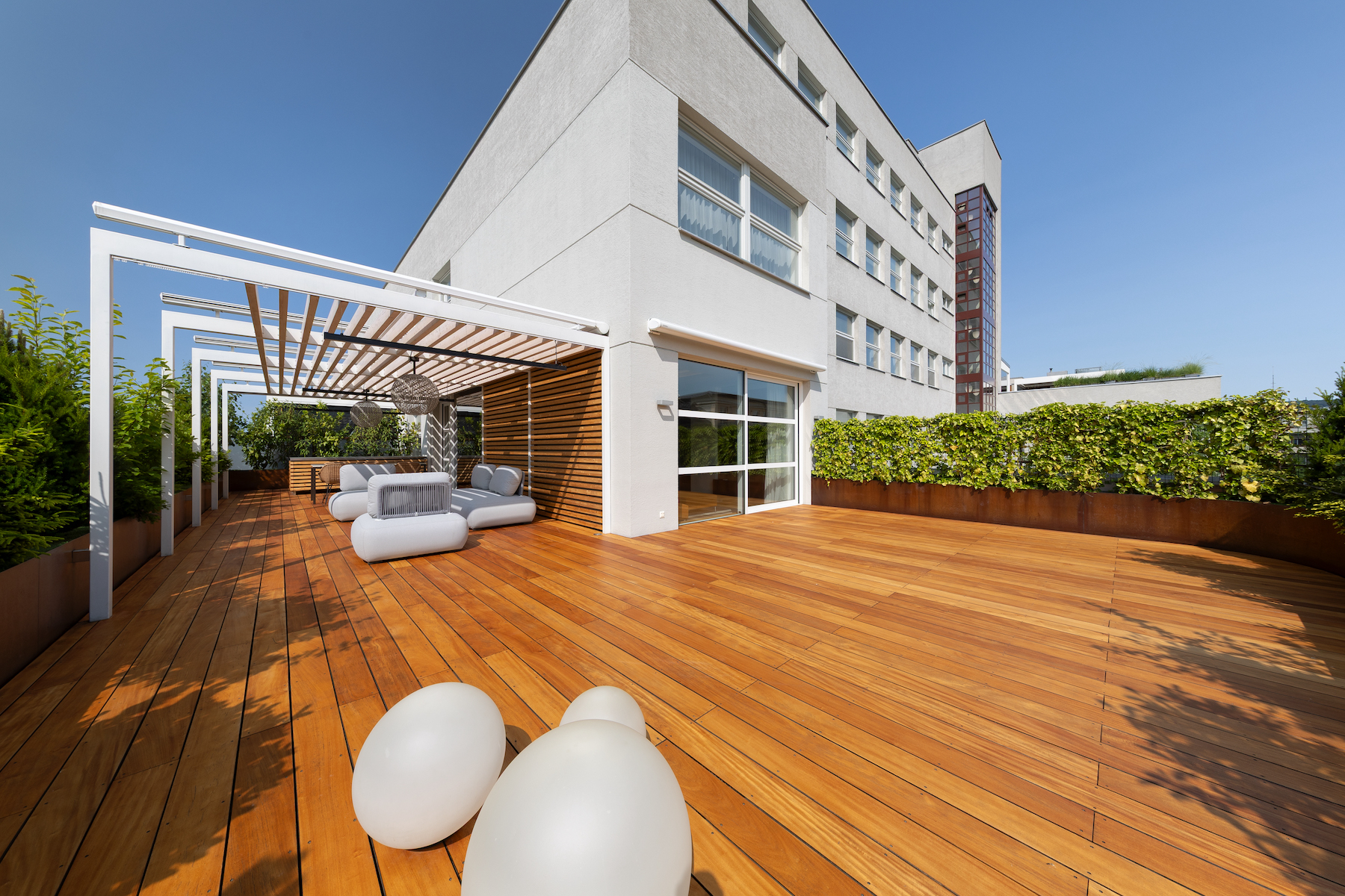 - 130 m² terrace with multiple zones, exotic Garapa wood decking