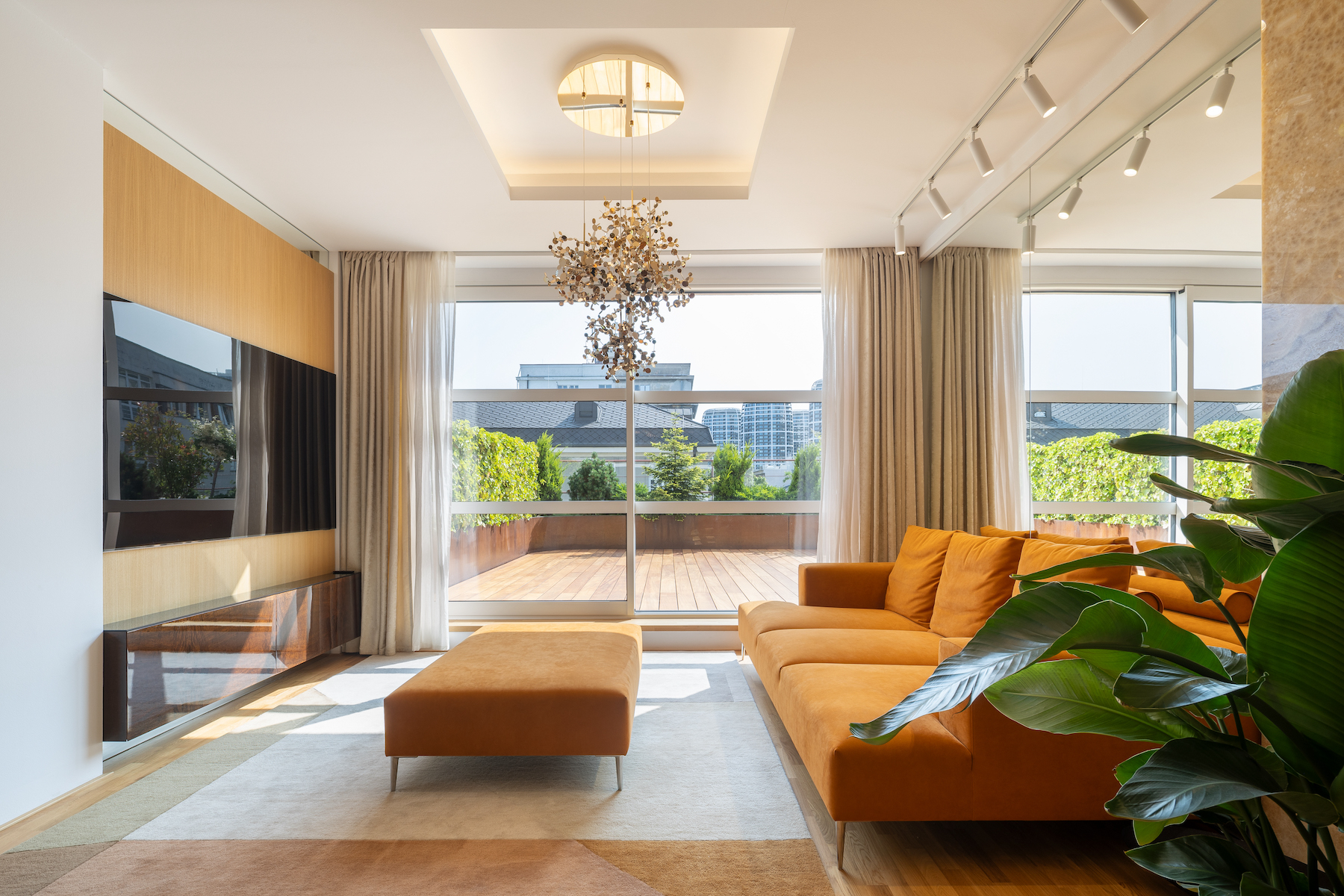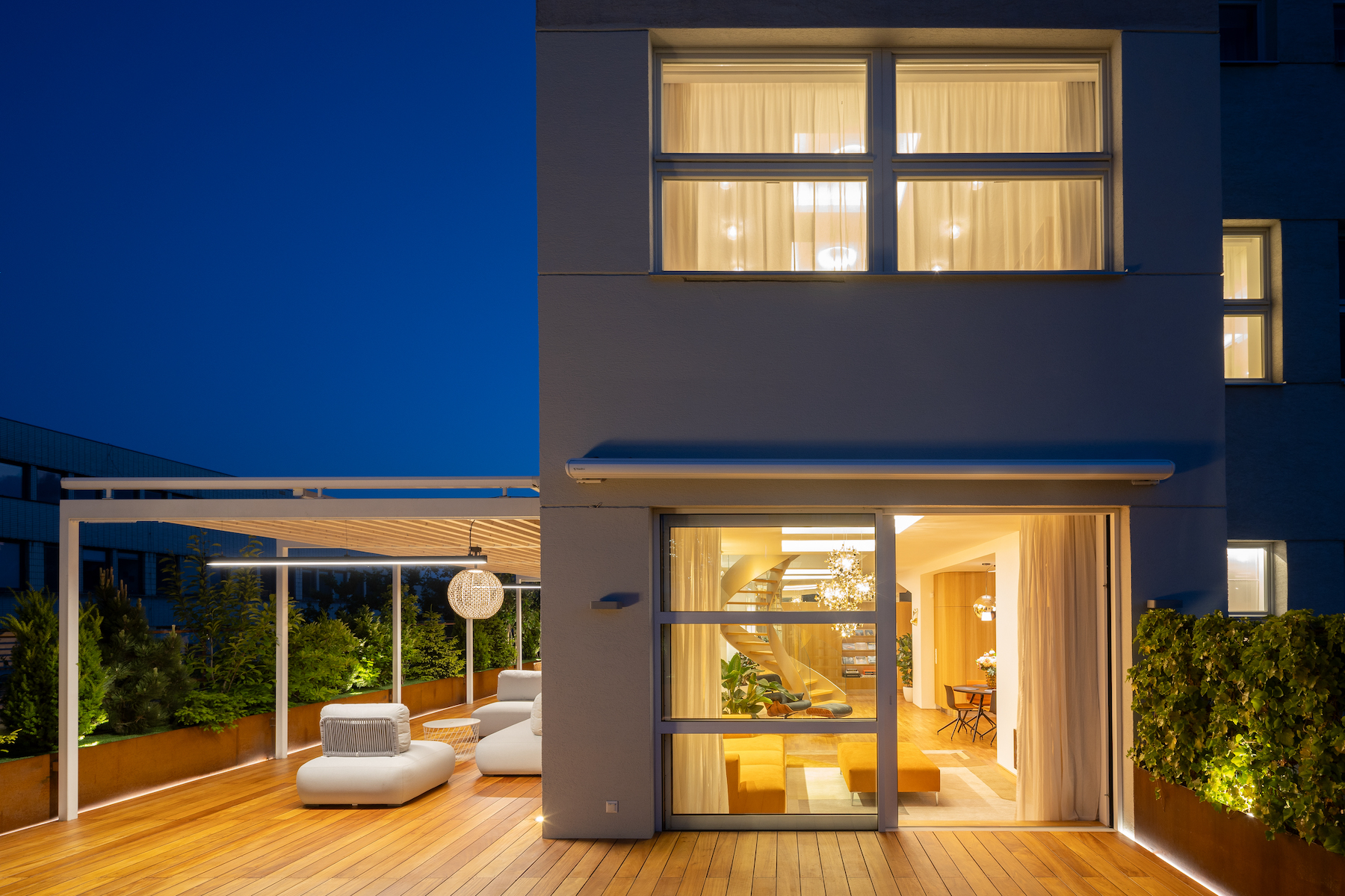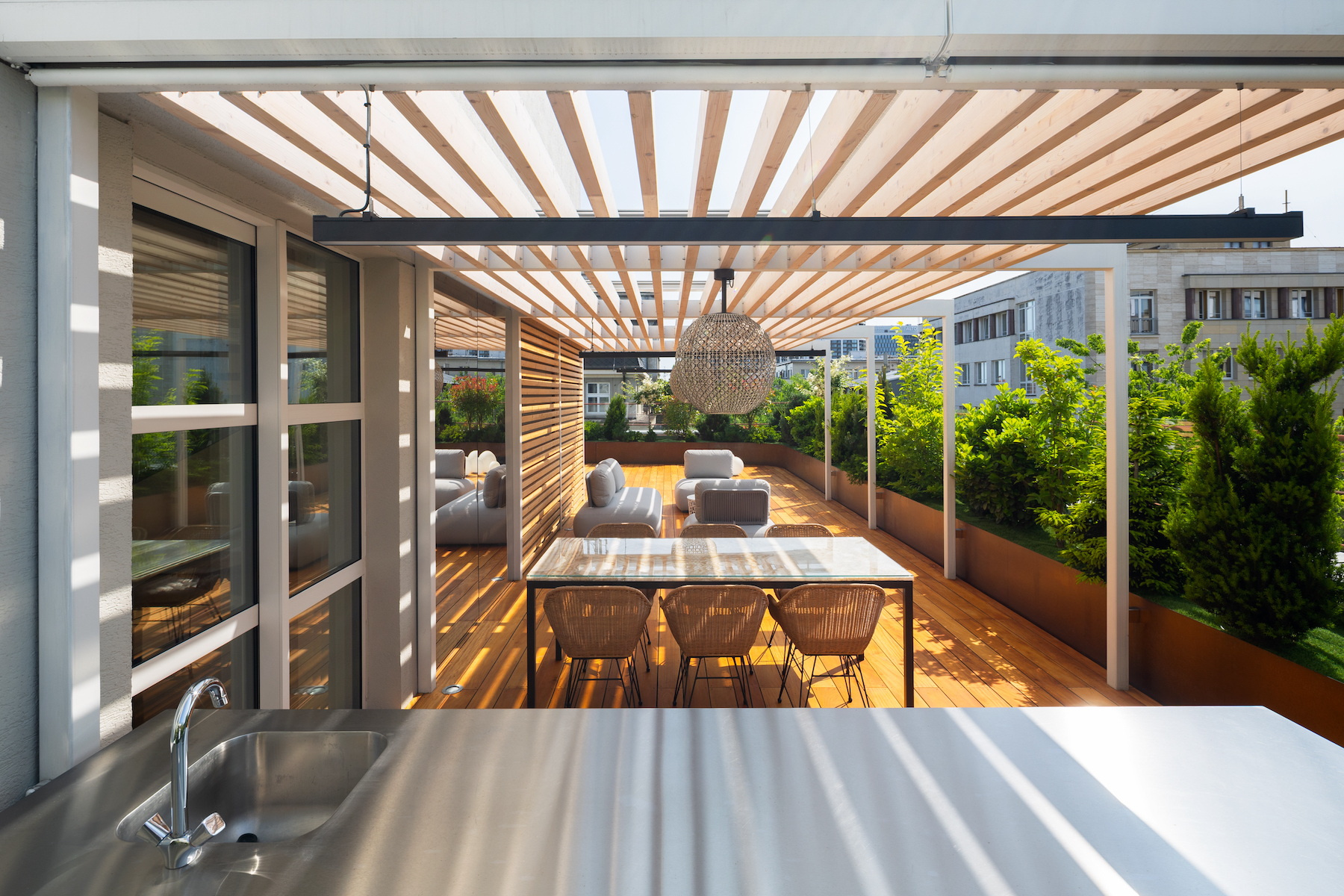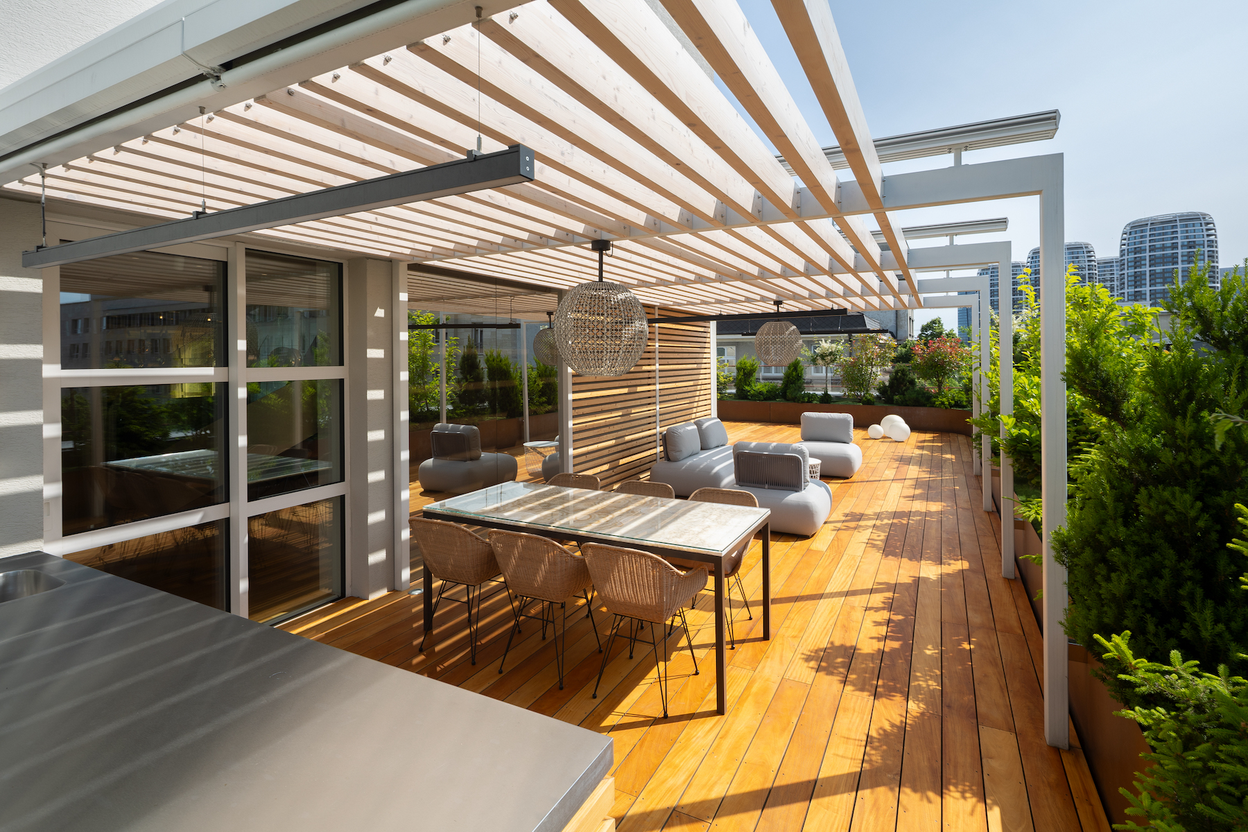 - 130 m² terrace with multiple zones, exotic Garapa wood decking