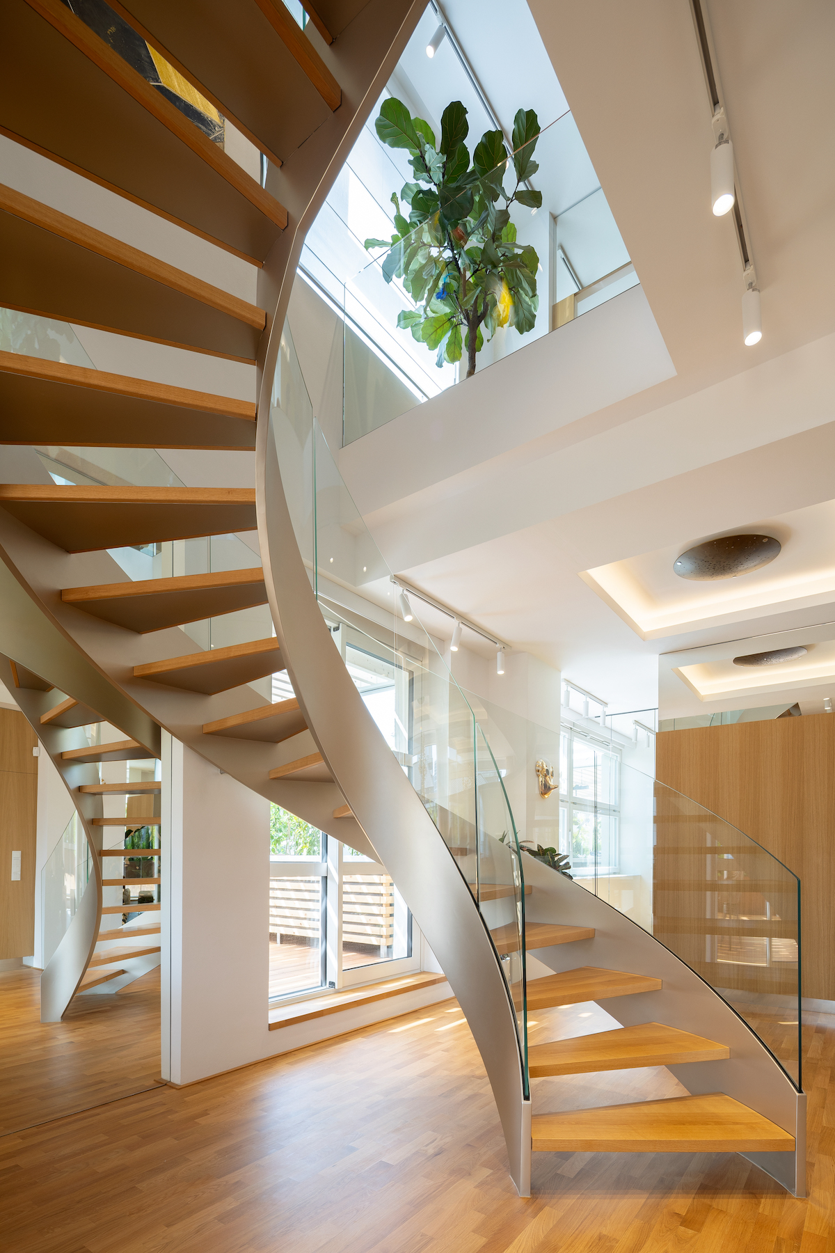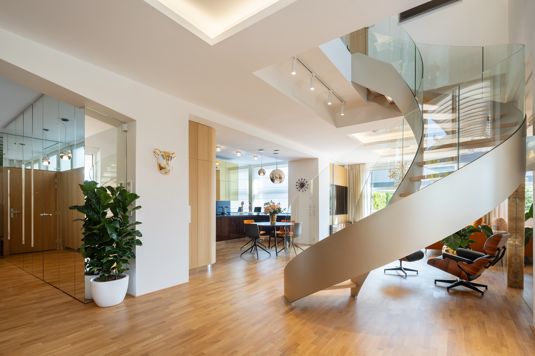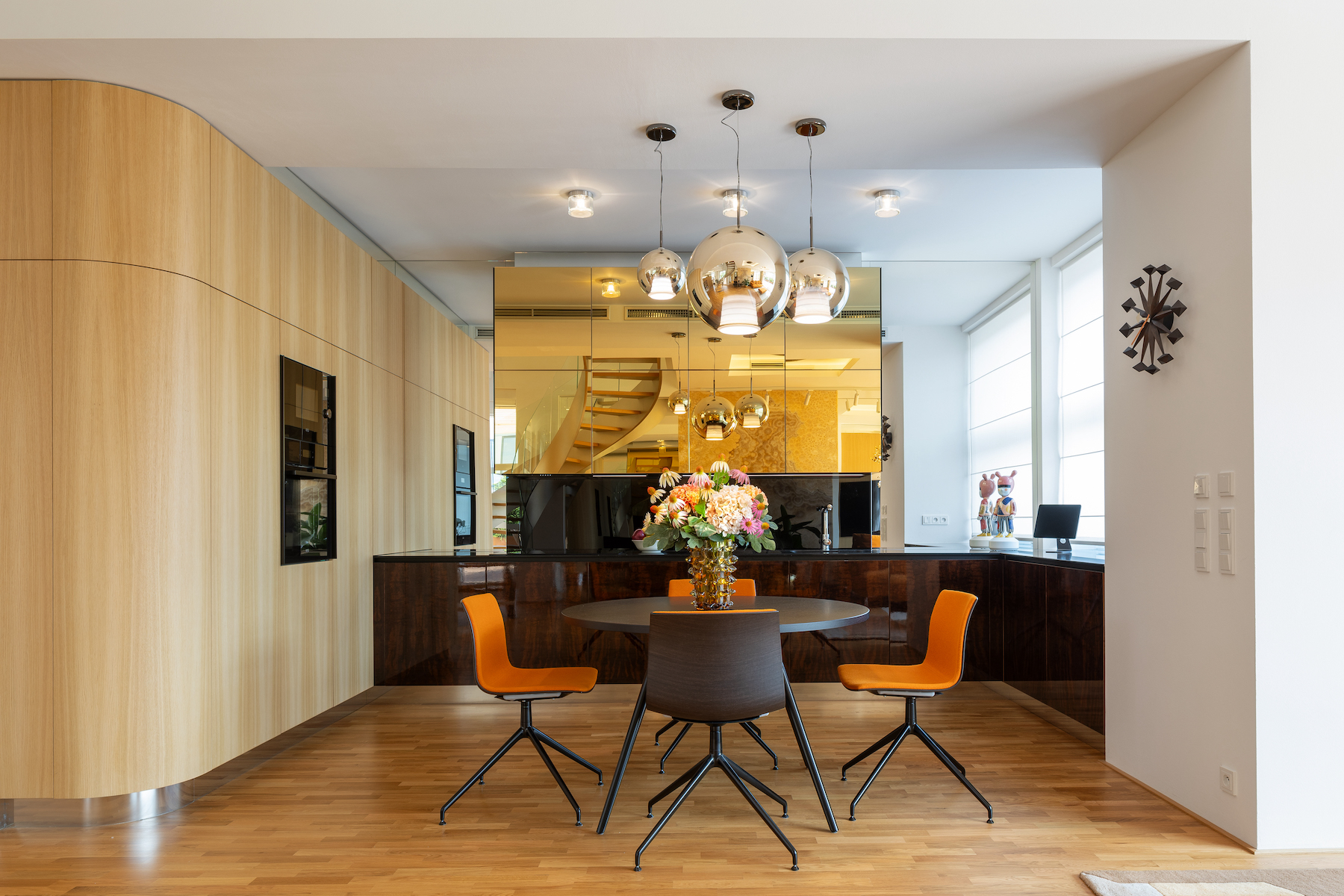 The penthouse stands out with its open composition and striking vertical layout. Ceiling heights reach 3 metres, while a gallery and a custom spiral staircase extend to an impressive 7 metres, creating a stunning visual experience. The staircase, made of solid oak, glass, and steel, acts as a sculptural centrepiece, defining the atmosphere of the main living area. The ground floor features a social zone with kitchen, dining and living space with access to the terrace, while the upper level comprises three bedrooms, one of which currently serves as a private fitness room or office.