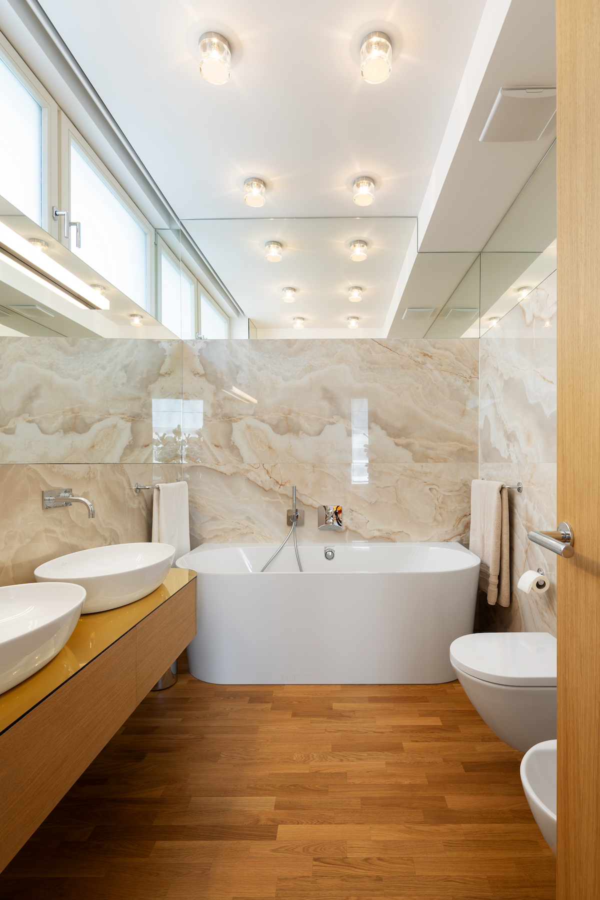 - Villeroy & Boch bathrooms with large-format onyx tiles