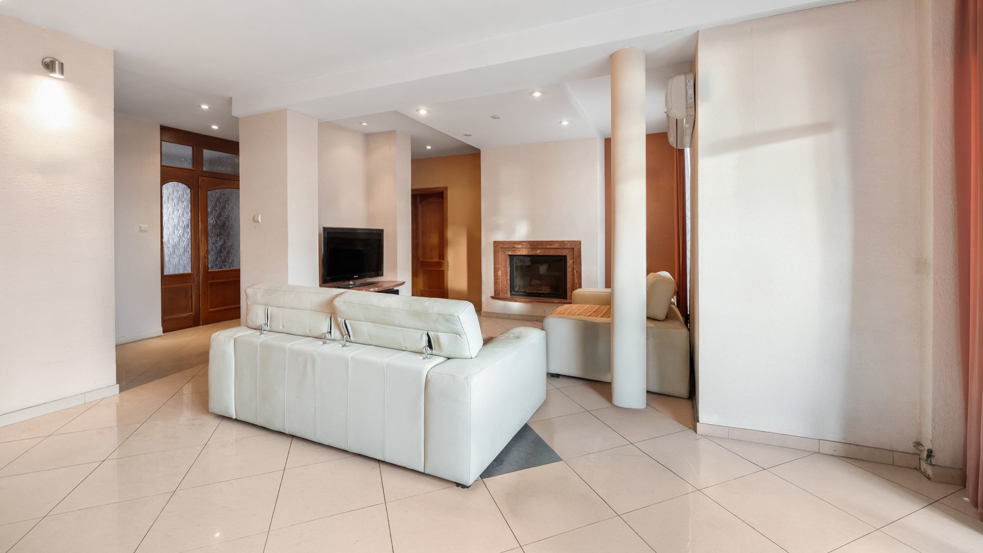 The lower residential unit (basement + ground floor) comprises five rooms. The main living area features a living room with a fireplace, seamlessly connected to a fully equipped kitchen and dining area. Additional amenities include two bathrooms, three toilets, a technical room, a walk-in closet, and an entrance hall with storage space.