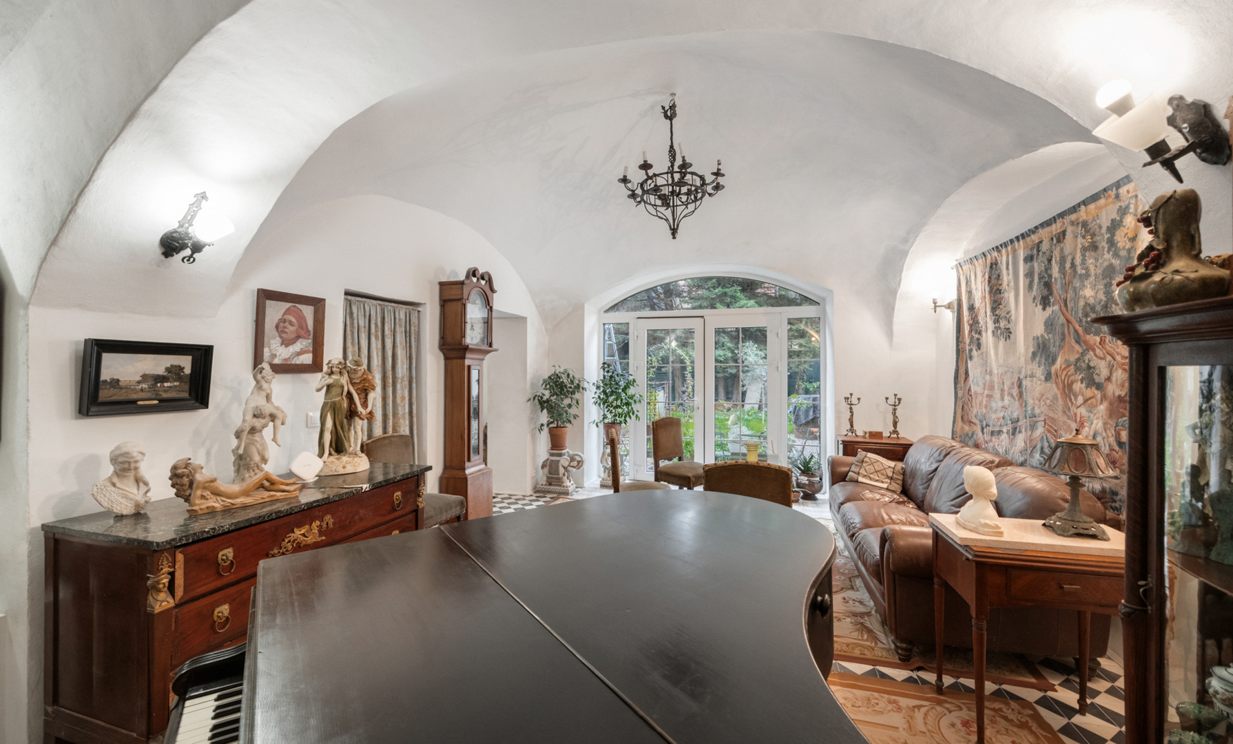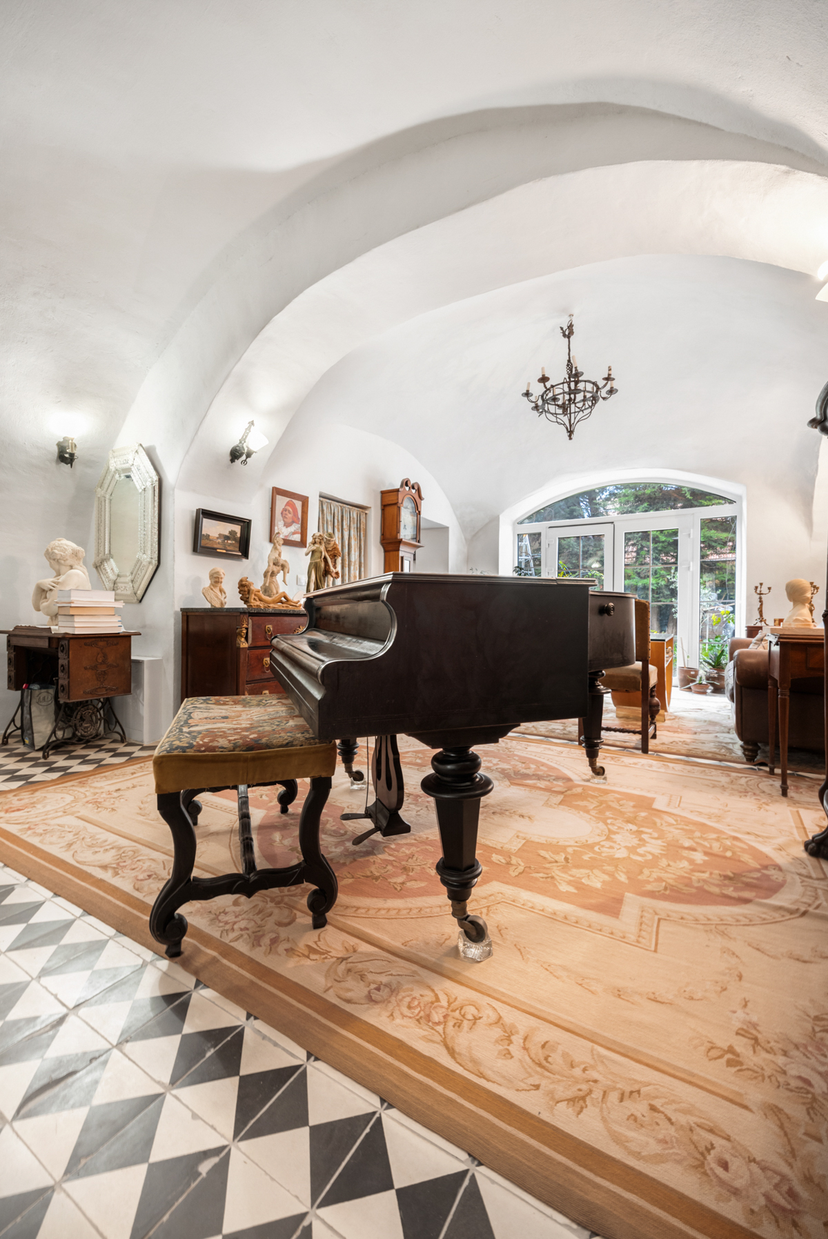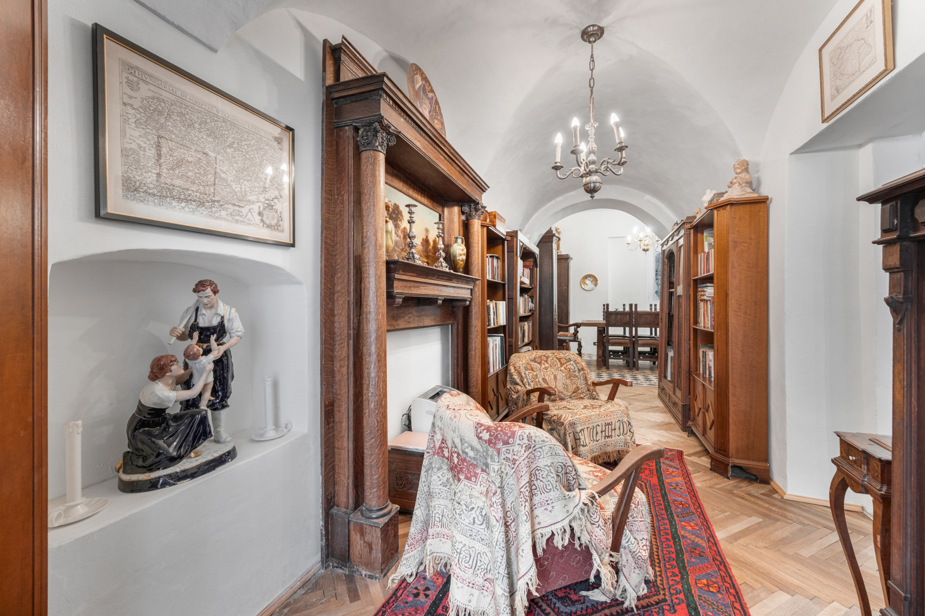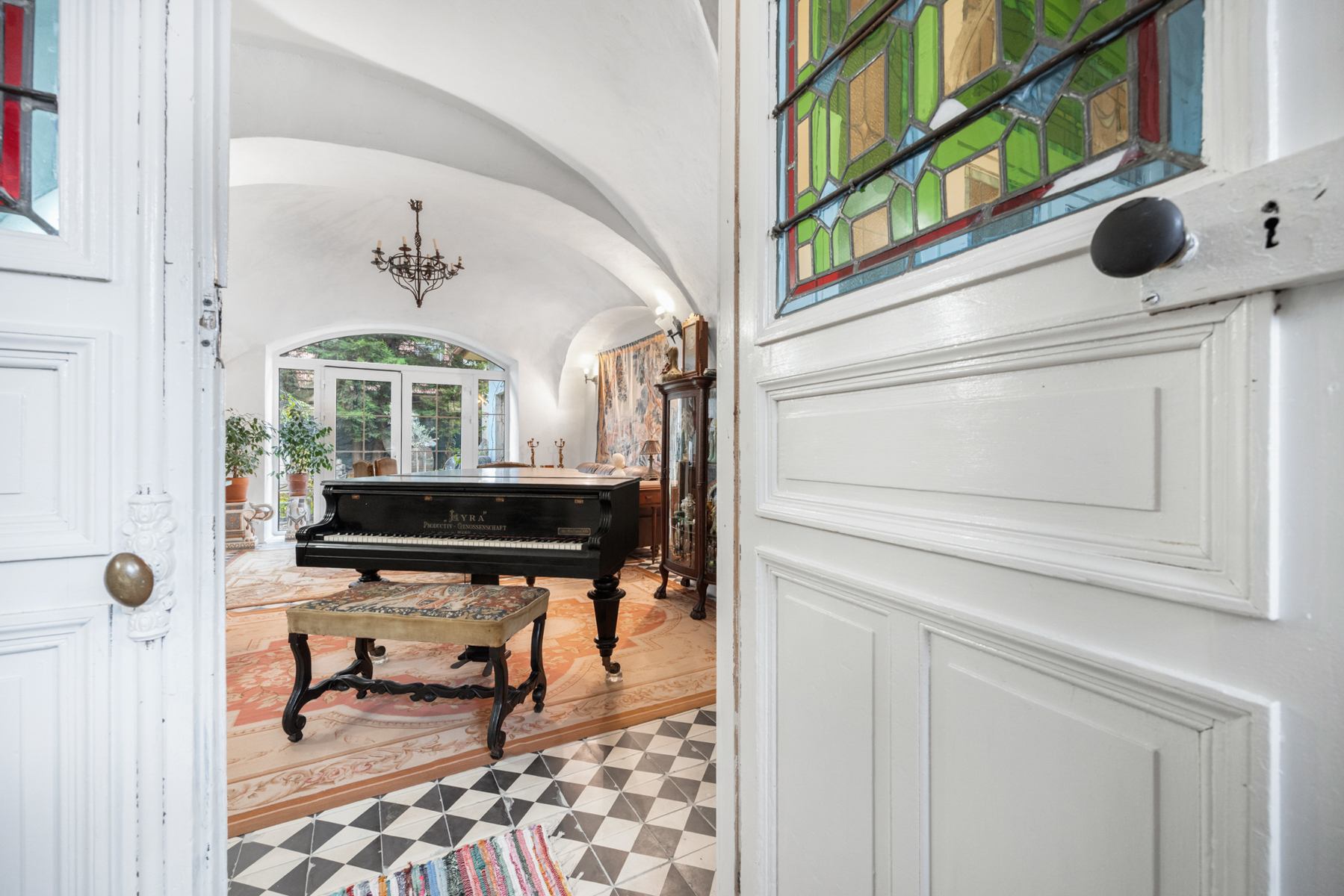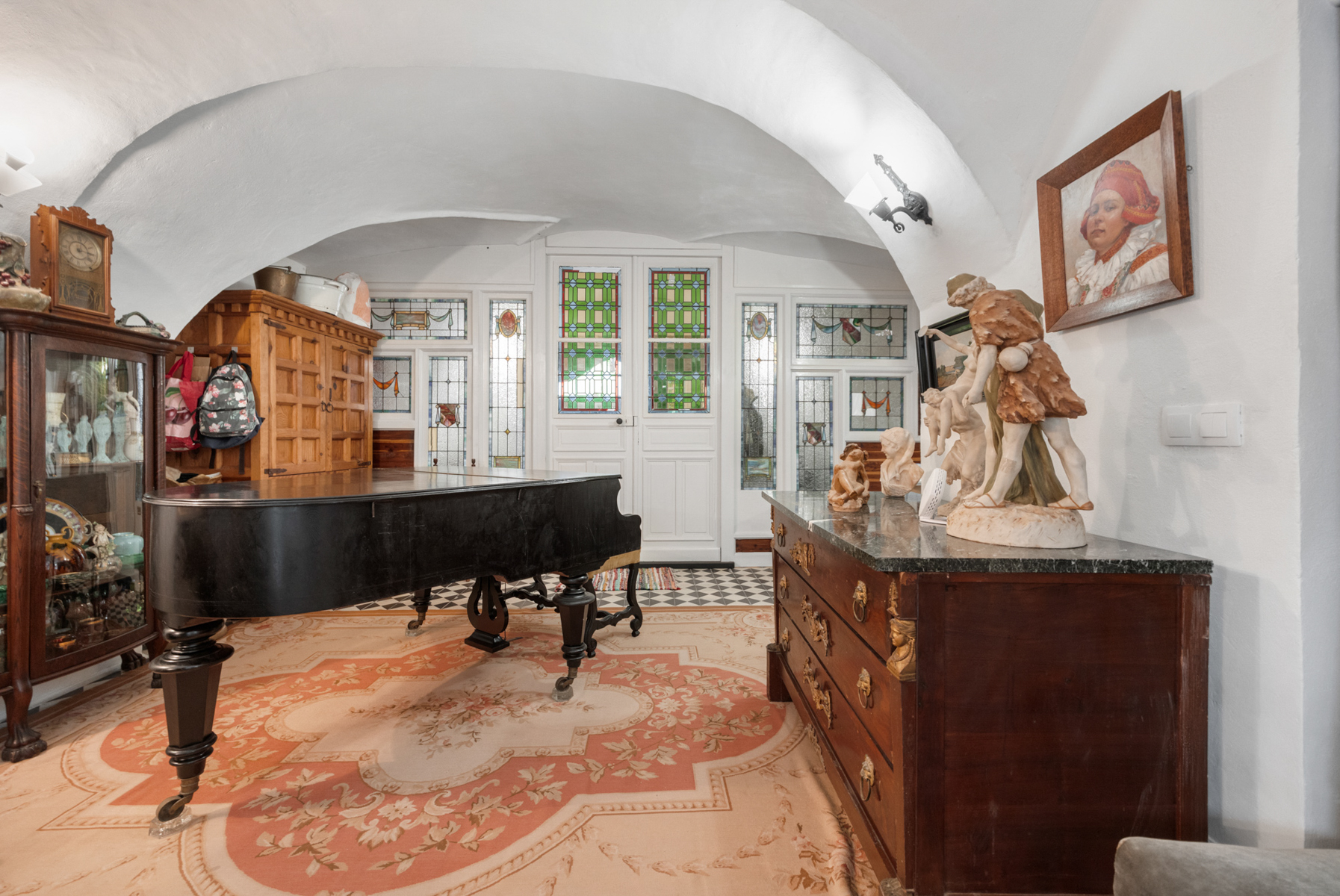 The ground floor features three vaulted rooms with preserved architectural details and original 19th-century floor tiles sourced from a historic church in Bratislava. The living area with grand piano is separated from the entrance hall by an antique stained-glass partition. The custom-made kitchen is fitted with marble worktops and a fully operational cast-iron stove. A charming adjoining library flows seamlessly into the dining area.