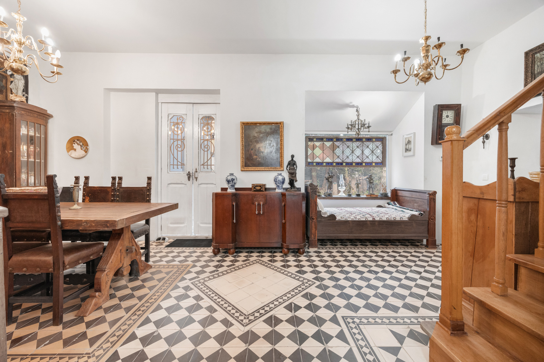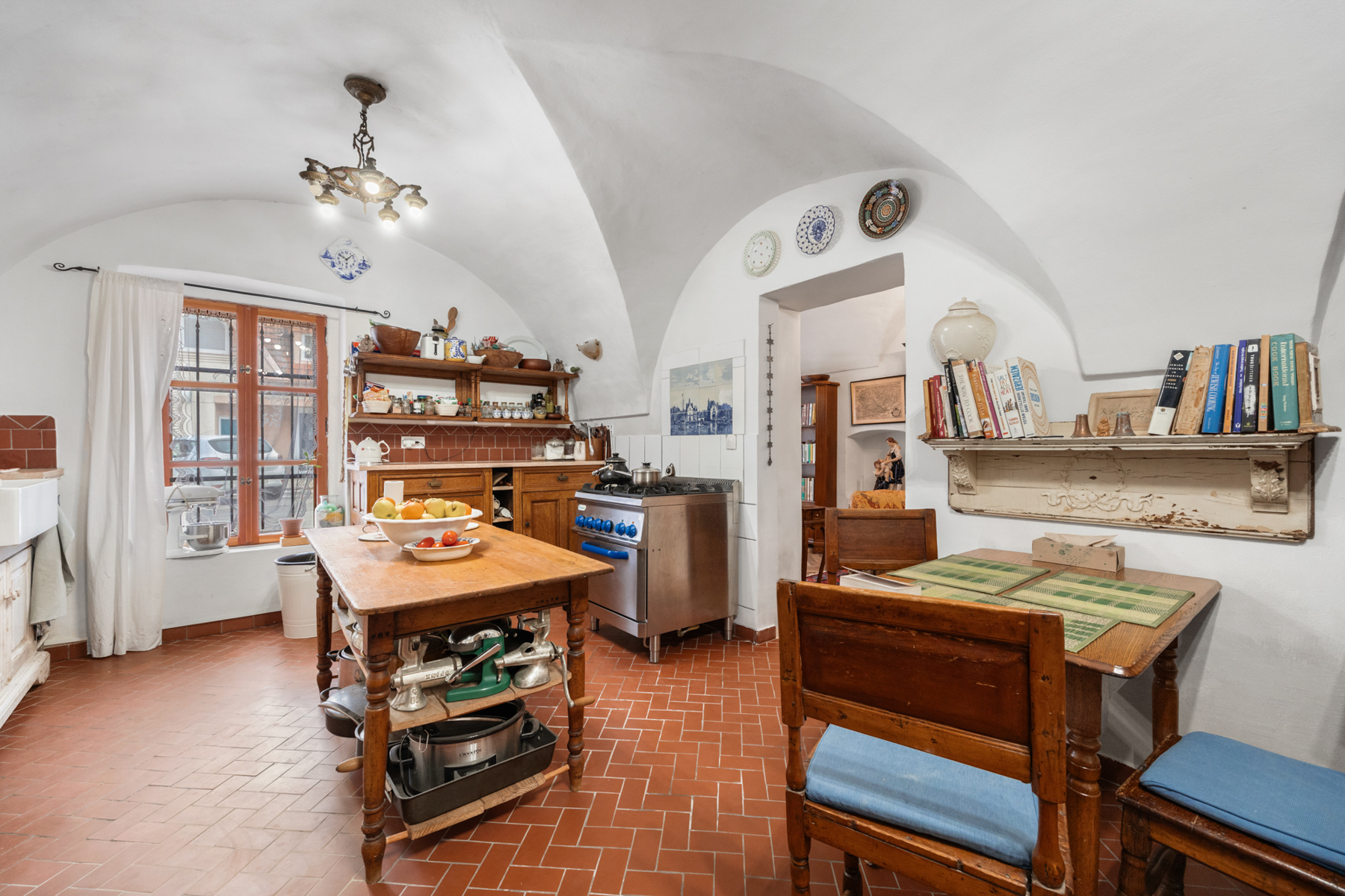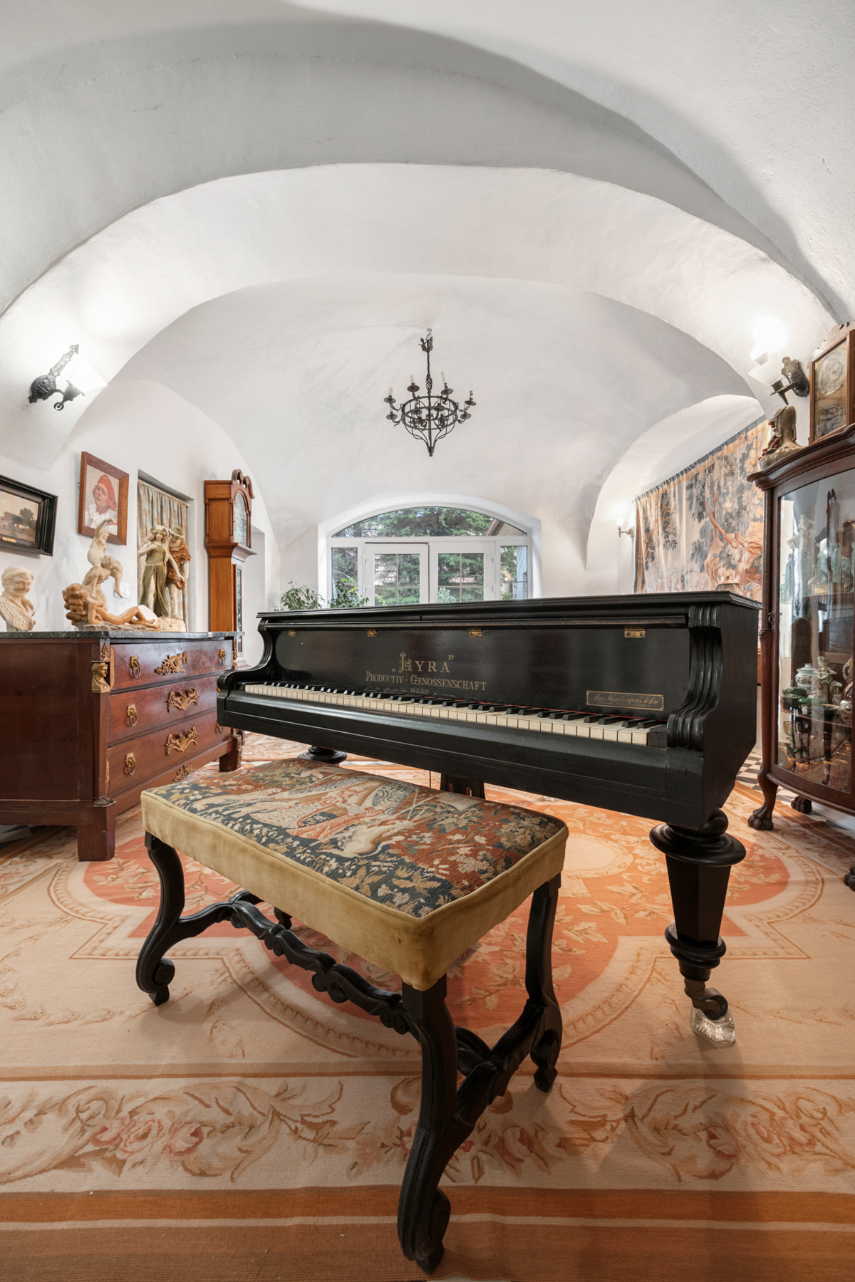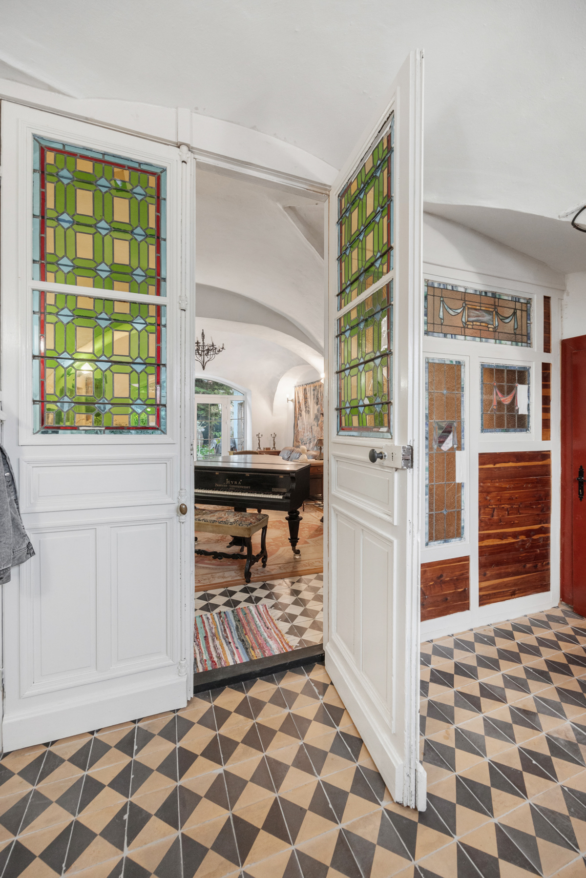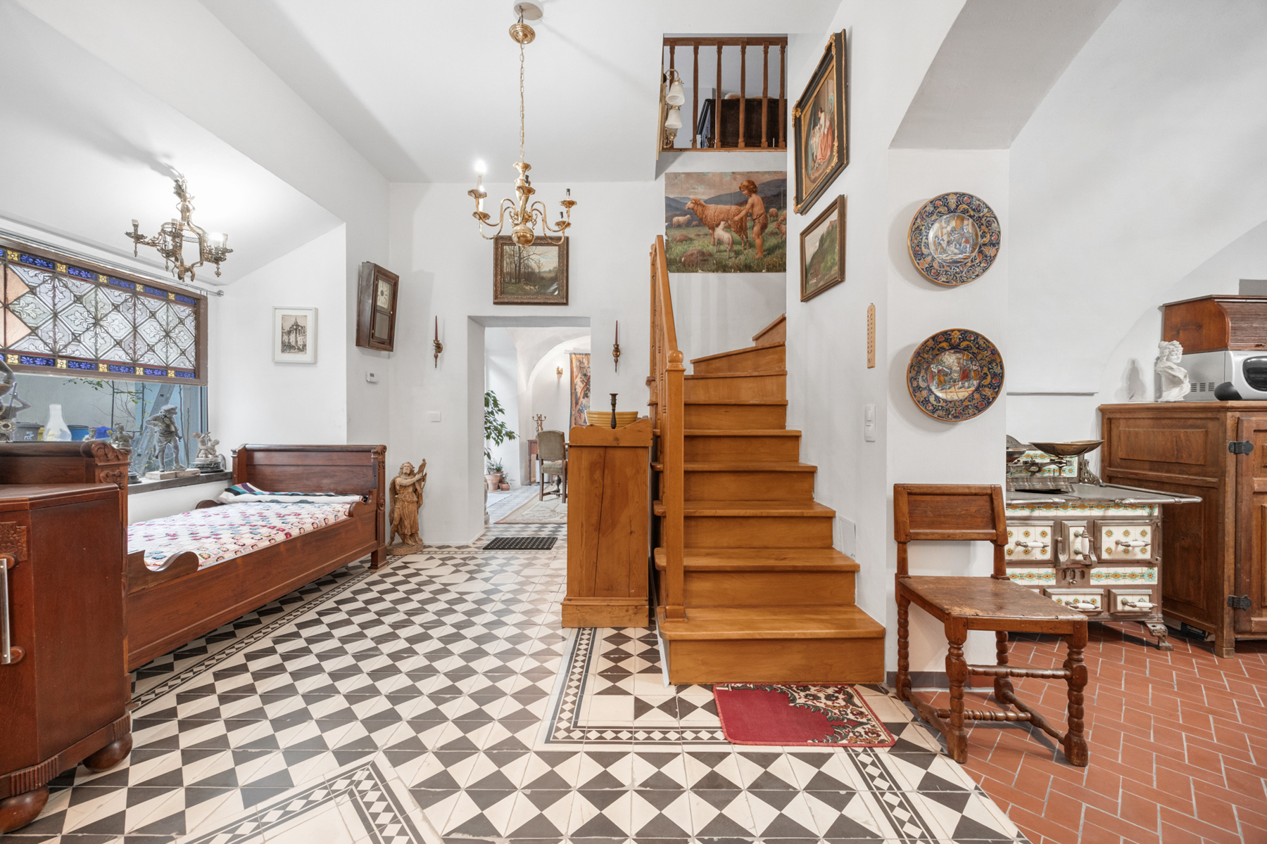 The ground floor features three vaulted rooms with preserved architectural details and original 19th-century floor tiles sourced from a historic church in Bratislava. The living area with grand piano is separated from the entrance hall by an antique stained-glass partition. The custom-made kitchen is fitted with marble worktops and a fully operational cast-iron stove. A charming adjoining library flows seamlessly into the dining area.