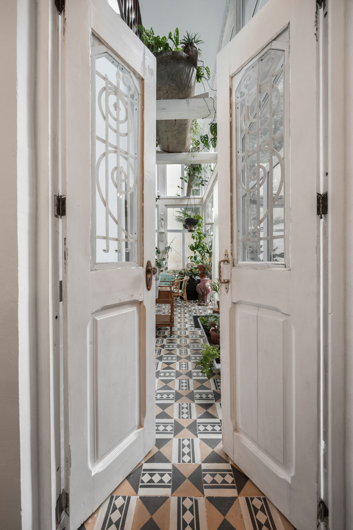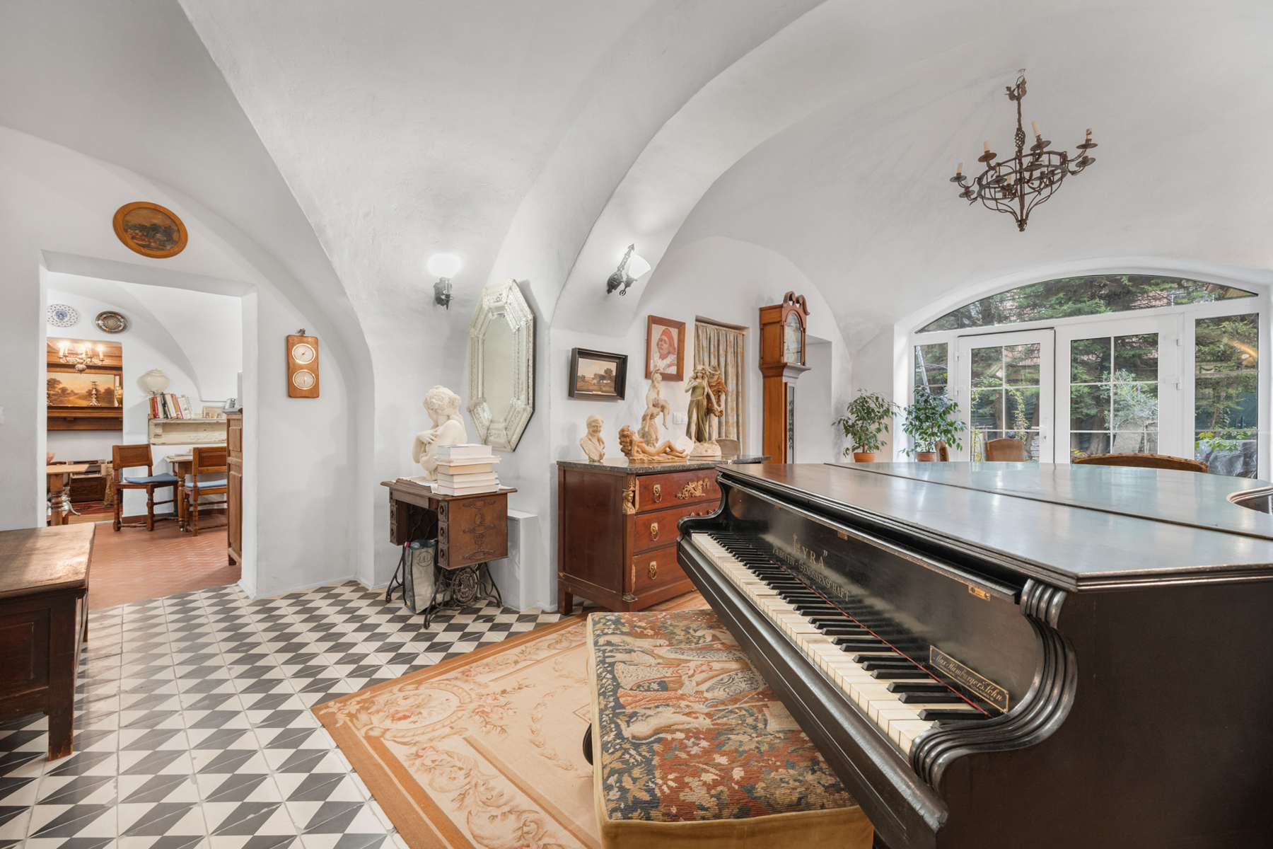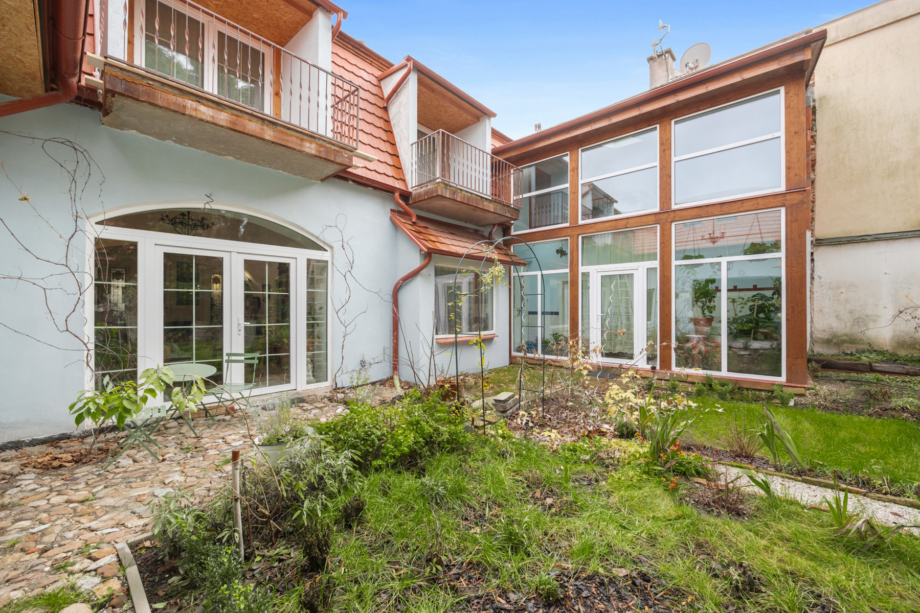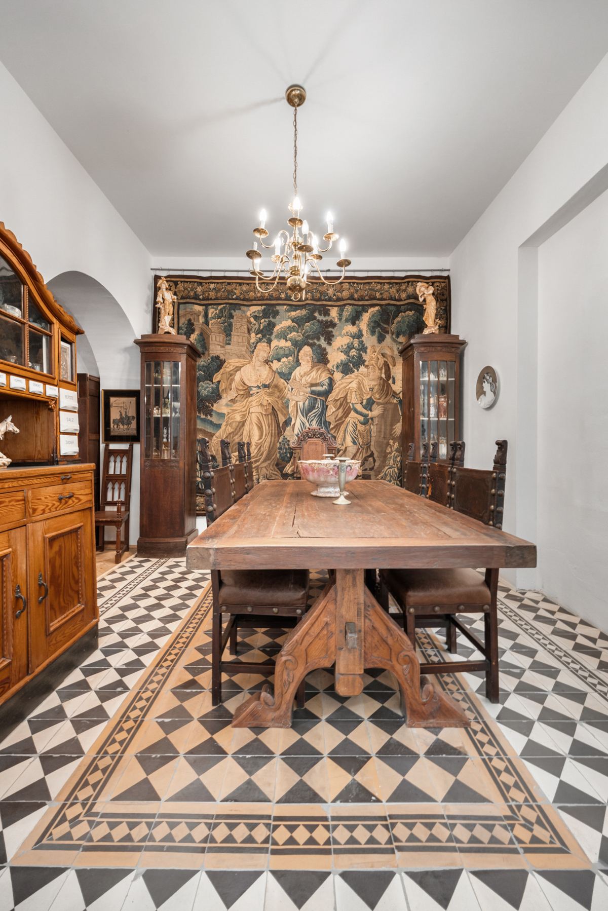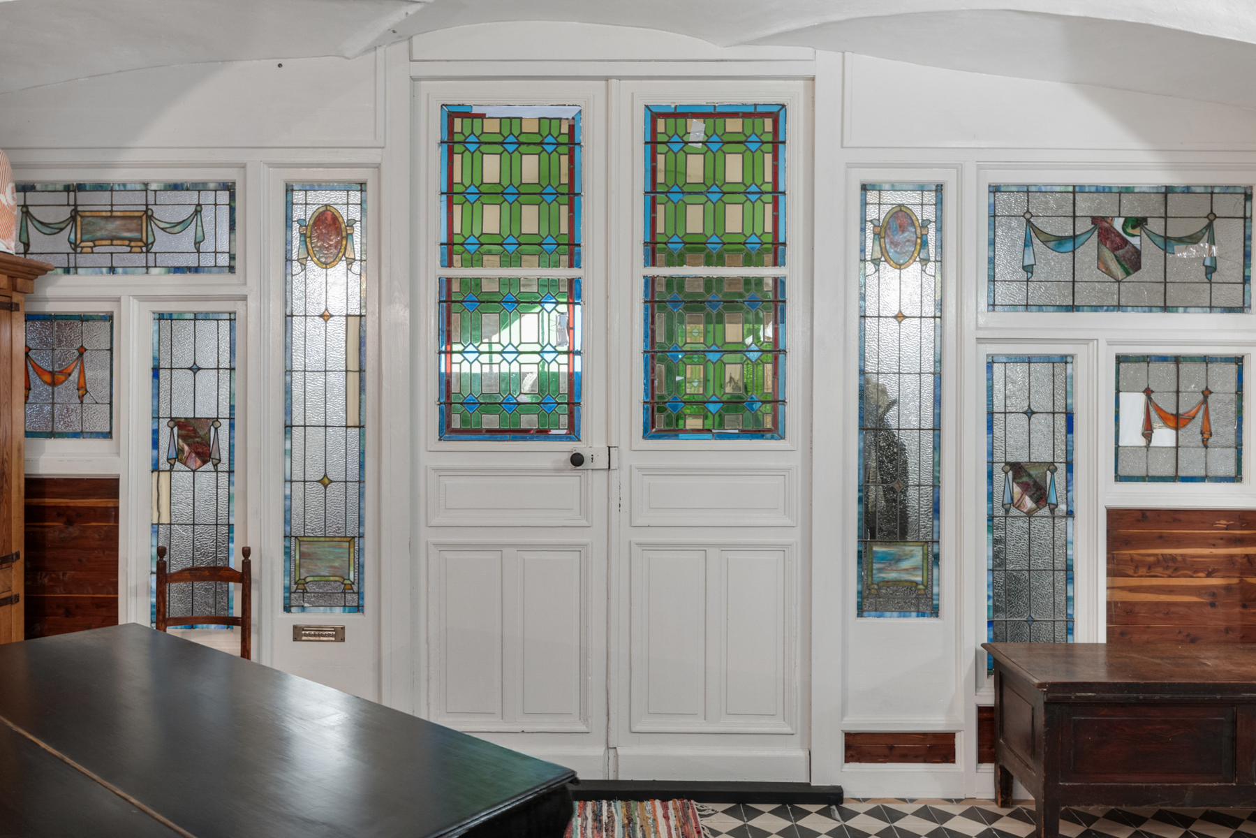 The ground floor features three vaulted rooms with preserved architectural details and original 19th-century floor tiles sourced from a historic church in Bratislava. The living area with grand piano is separated from the entrance hall by an antique stained-glass partition. The custom-made kitchen is fitted with marble worktops and a fully operational cast-iron stove. A charming adjoining library flows seamlessly into the dining area.