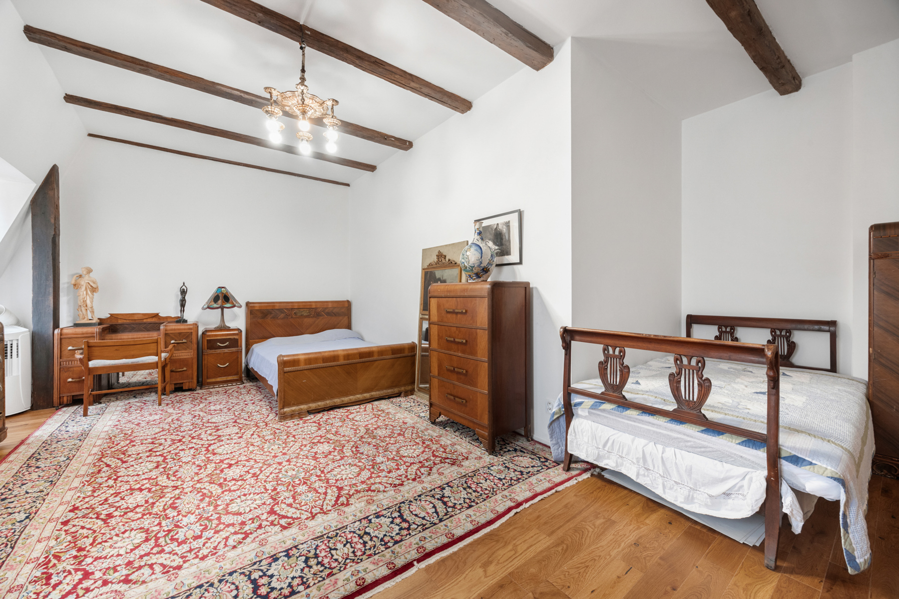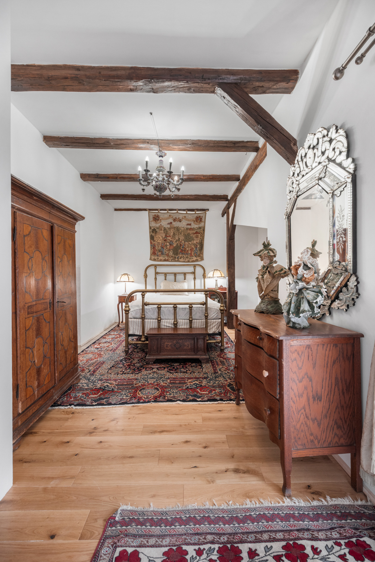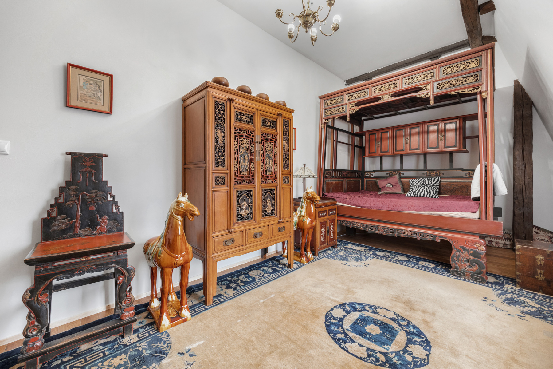 The upper floor comprises five bedrooms and two bathrooms. The ceilings are adorned with exposed wooden beams and dormer windows, and one of the rooms is styled in an oriental theme. The interior is tastefully furnished in a manner that respects and complements the home’s historical character.
