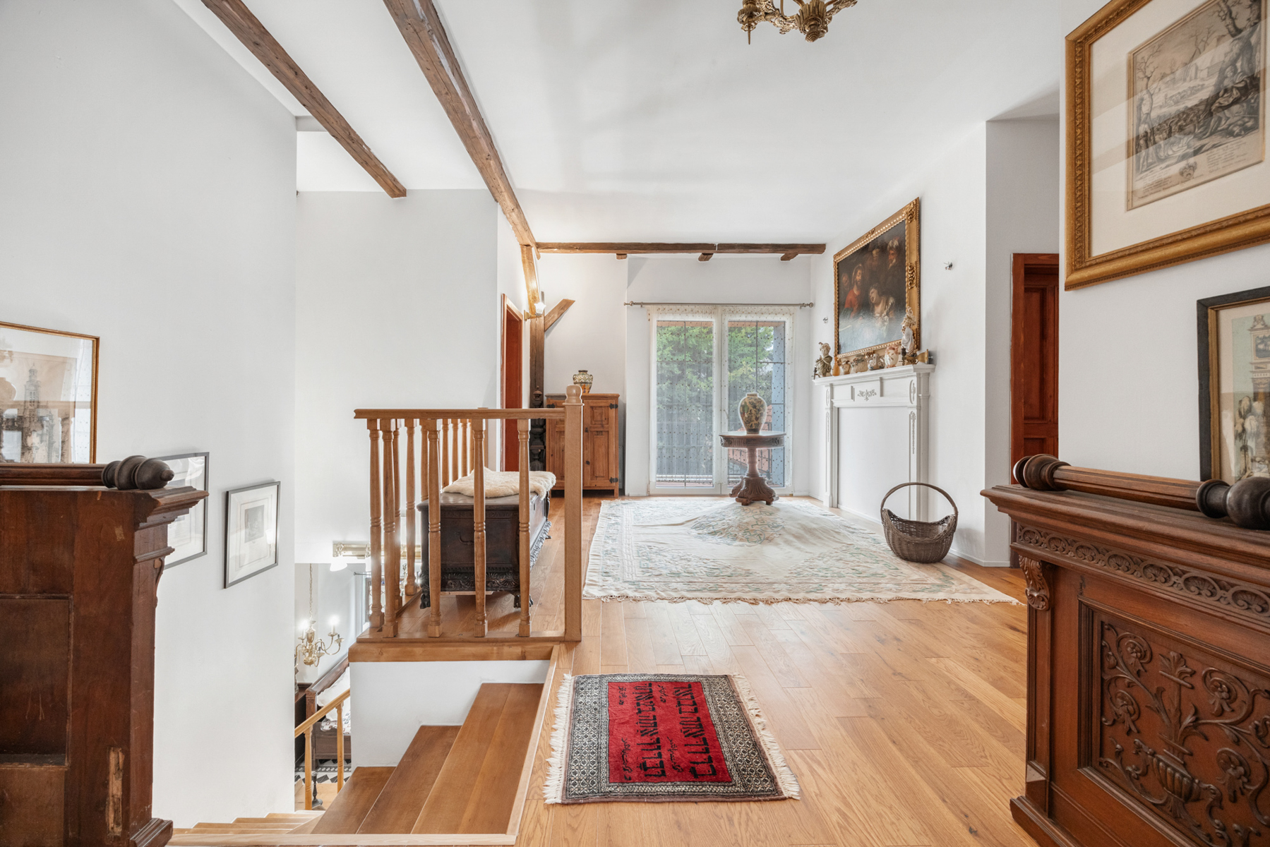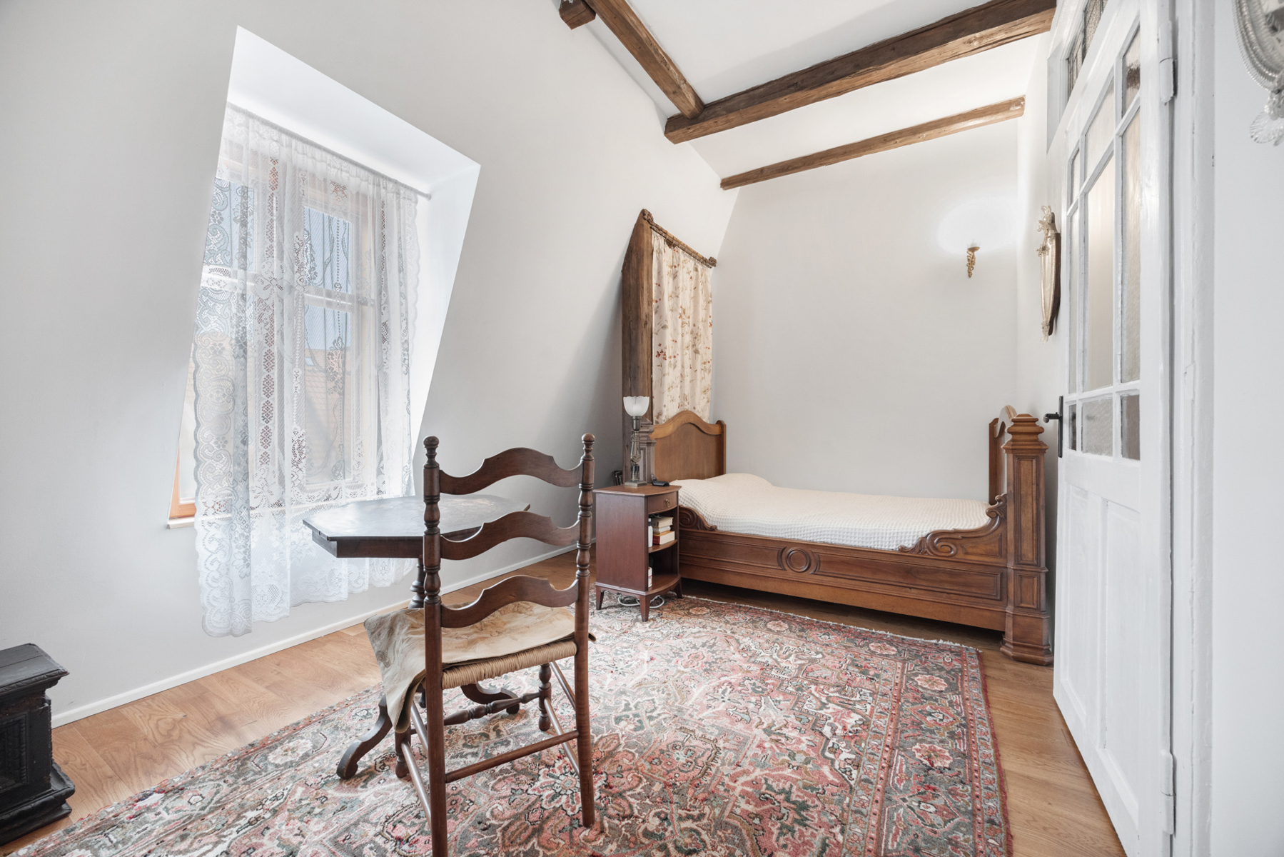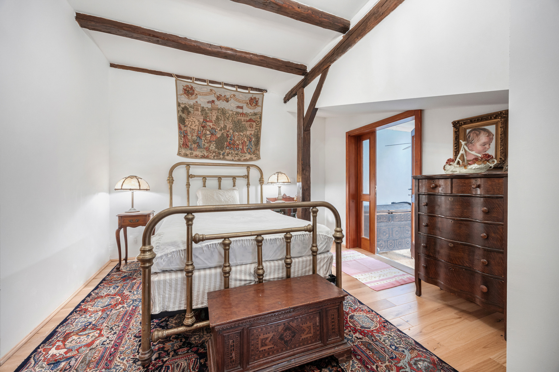 The upper floor comprises five bedrooms and two bathrooms. The ceilings are adorned with exposed wooden beams and dormer windows, and one of the rooms is styled in an oriental theme. The interior is tastefully furnished in a manner that respects and complements the home’s historical character.