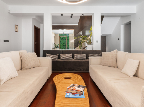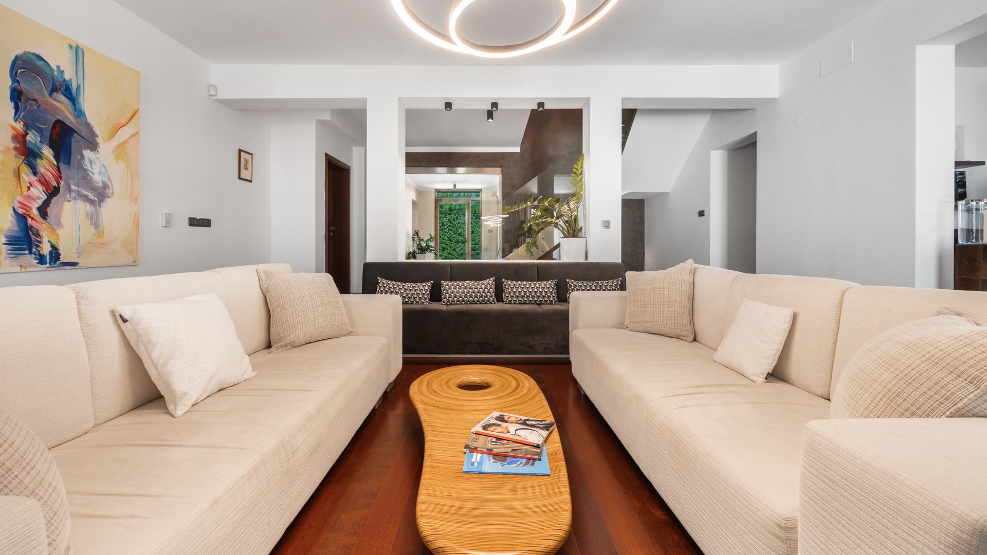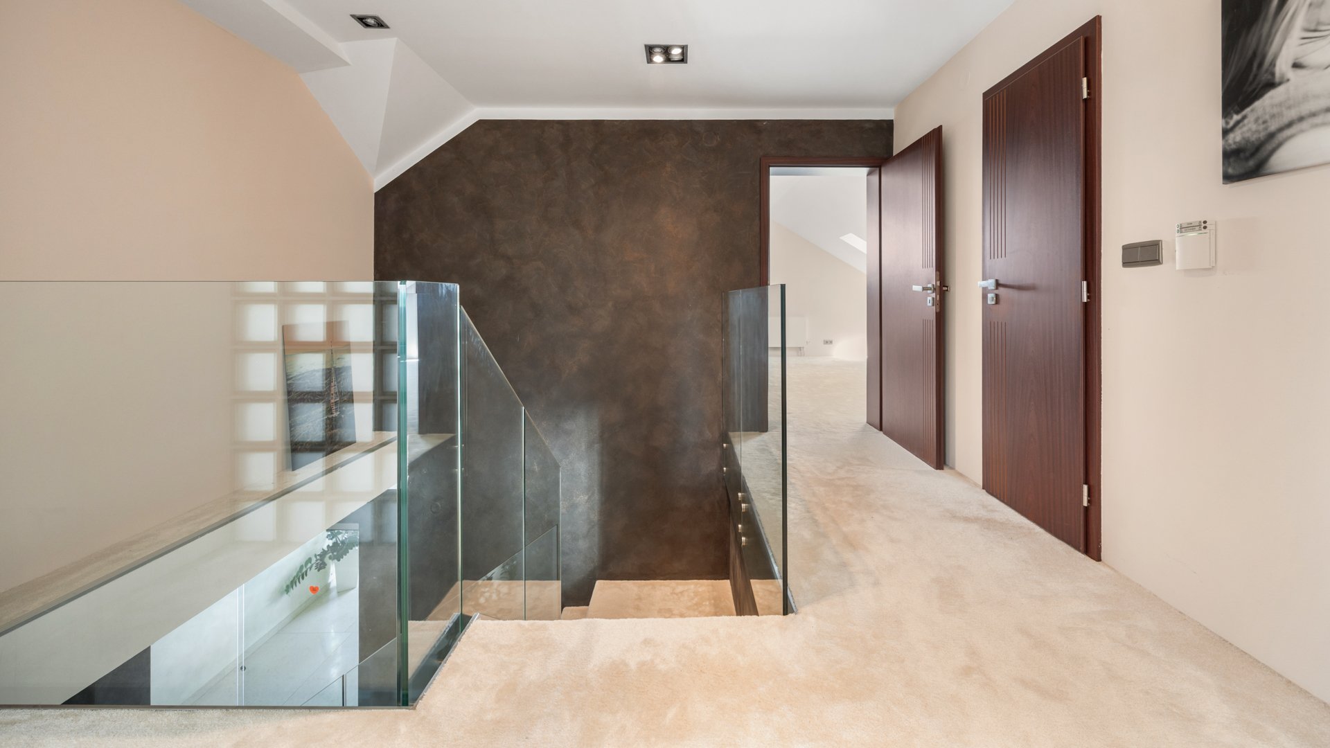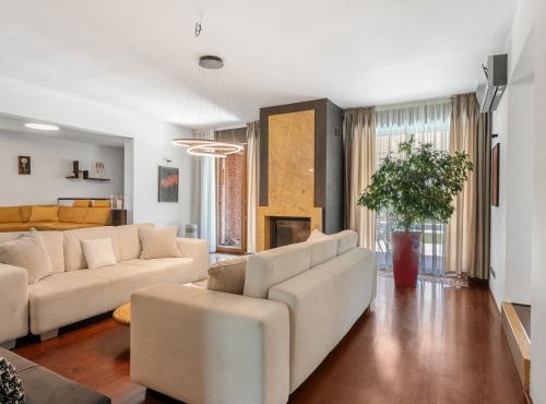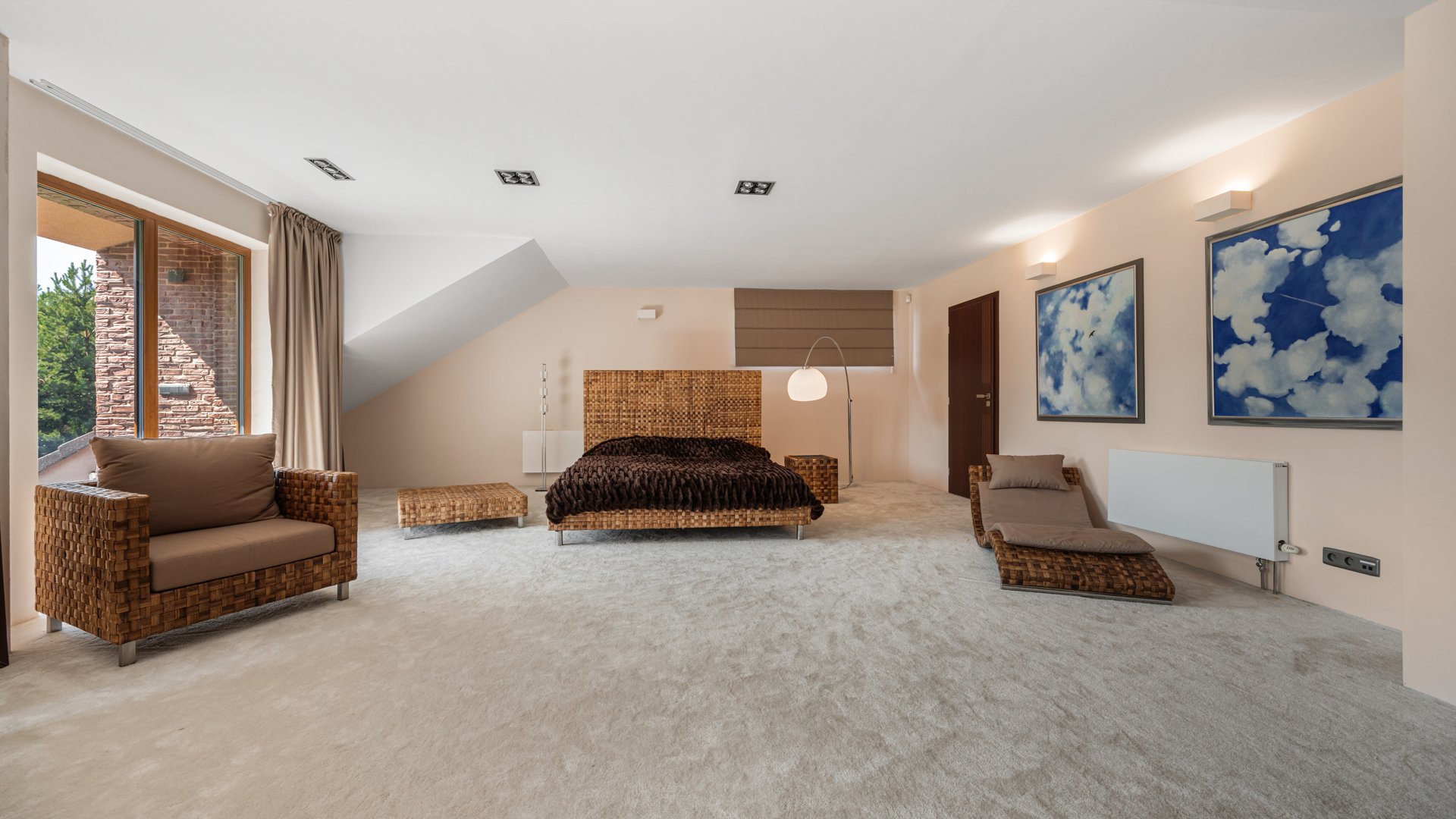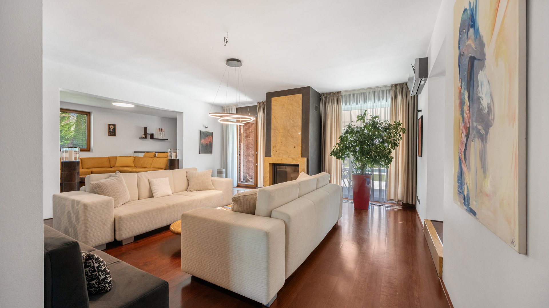 Nehnuteľnosť disponuje šiestimi izbami, z toho štyrmi spálňami a tromi kúpeľňami. Dispozícia domu spája praktickosť s komfortom a vytvára funkčne oddelené obytné, spoločenské aj oddychové zóny. Prízemie plynulo nadväzuje na exteriér a ponúka priestrannú obývaciu časť, lounge posedenie s krbom, zimnú záhradu a kompletne vybavenú kuchyňu so zabudovanými spotrebičmi. Suterén (80 m²) bol rozšírený o wellness zónu s fitness a saunou, technické priestory a sklad.