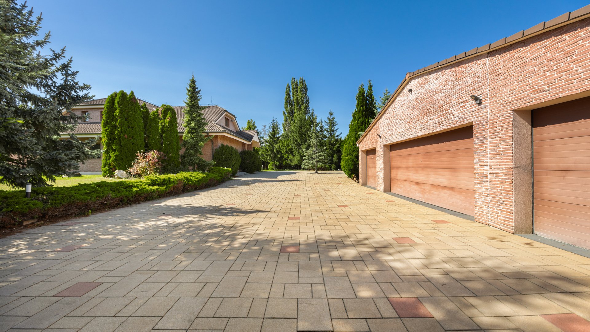 Súčasťou nehnuteľnosti je garáž pre štyri vozidlá, doplnená o vonkajšie parkovanie pre ďalších päť áut. Prístupová komunikácia je asfaltová, spevnené plochy sú vydláždené.