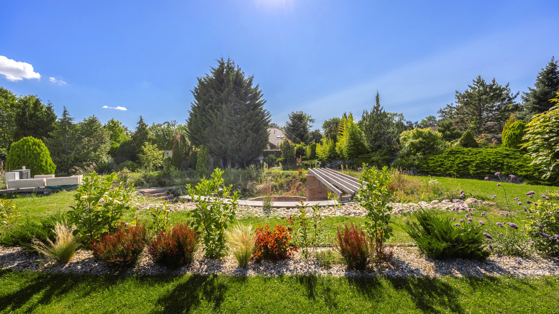 Záhrada, orientovaná na juhozápad, poskytuje maximálne súkromie a priestor pre oddych aj funkčné využitie. Dominantou exteriéru je 15-metrový bazén so slanou vodou, vyhrievaný tepelným čerpadlom, podsvietený a vybavený samočistiacim systémom a automatickou roletou. V exteriéri sa ďalej nachádza letná kuchynka, detské ihrisko, starostlivo udržiavané okrasné dreviny a ovocné stromy. Vstup na pozemok je orientovaný na severovýchod a je riešený dvomi samostatnými elektricky ovládanými bránami.