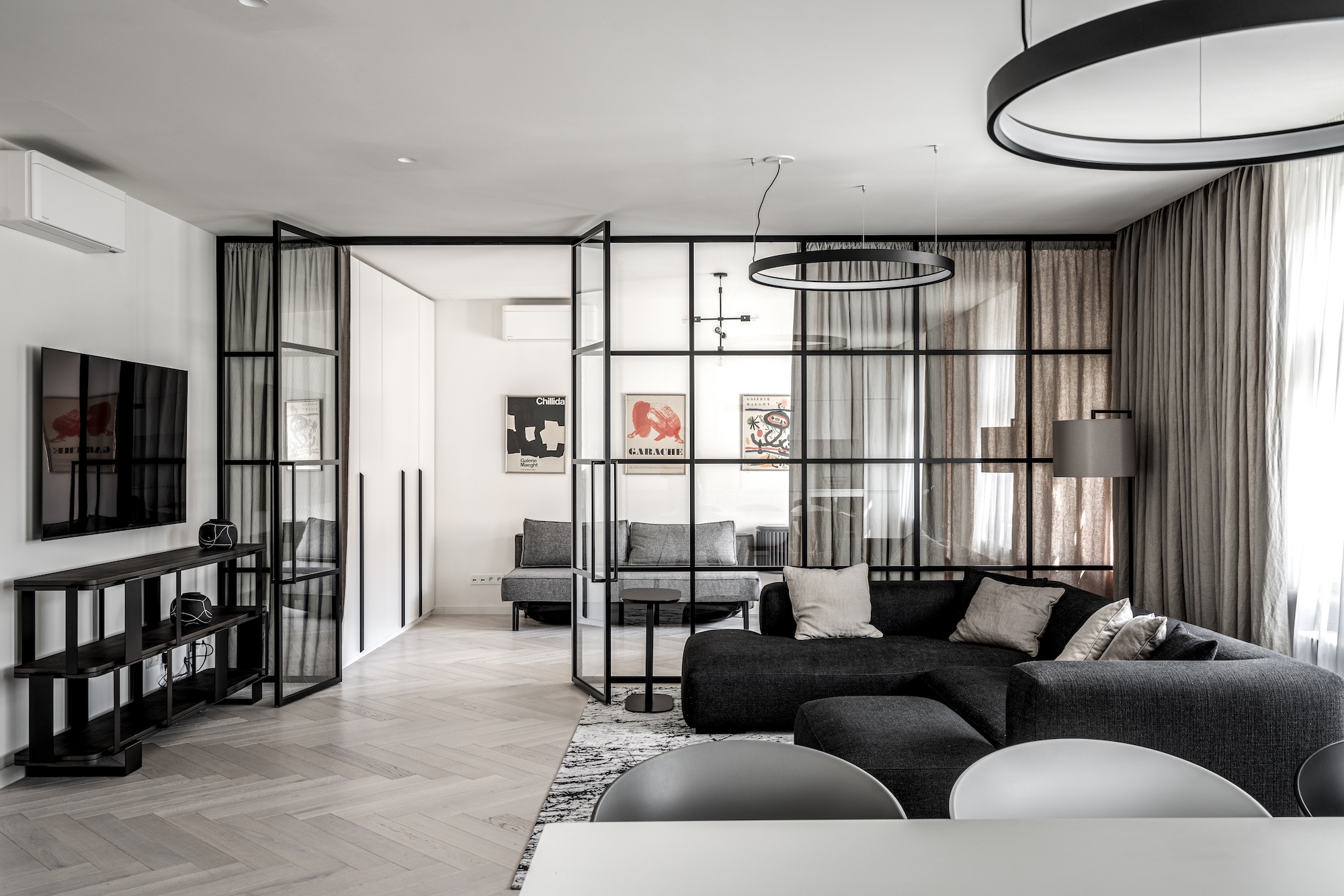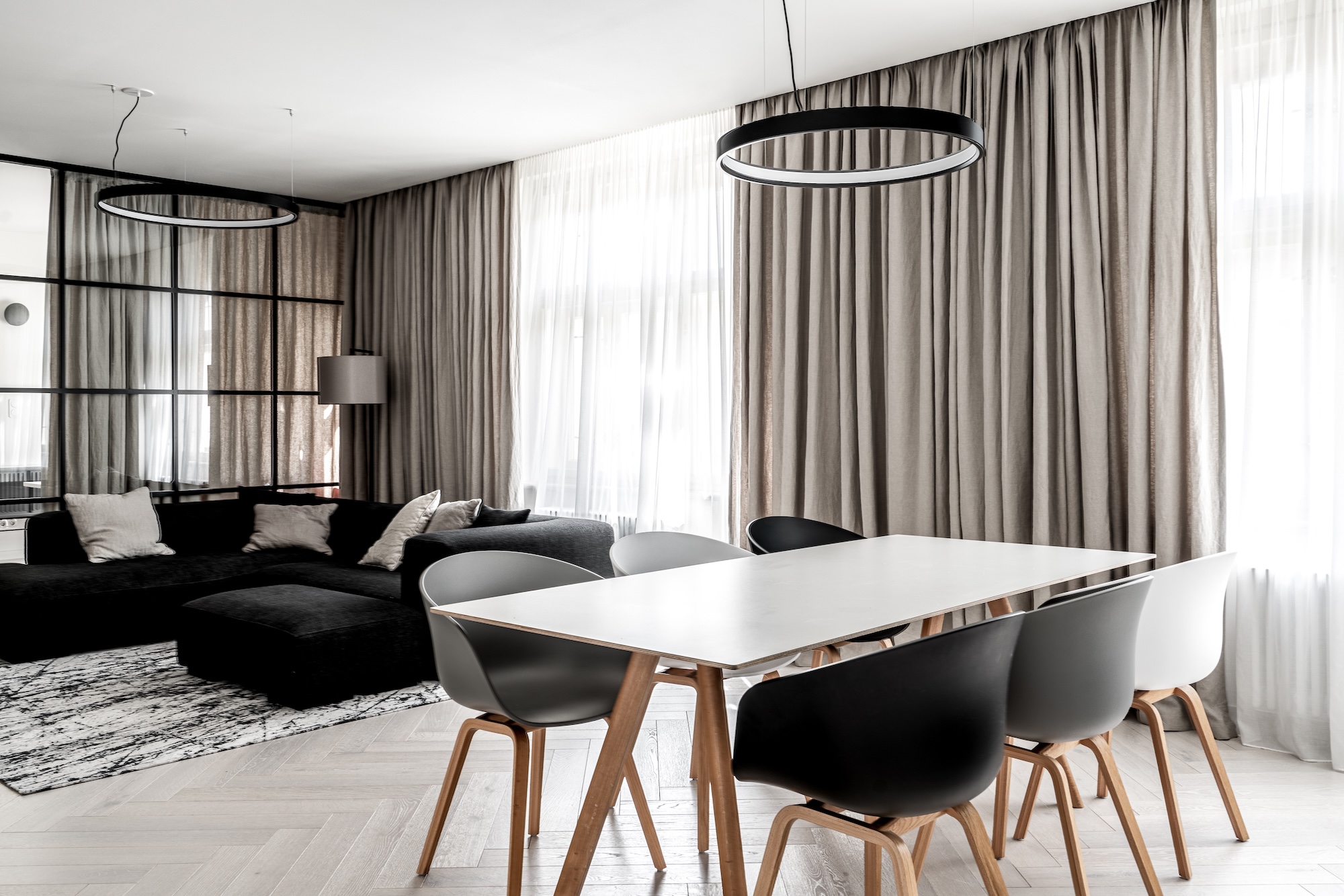 Byt s výmerou 155,5 m² zaujme svojou premyslenou dispozíciou a priestranným charakterom. Dominantou je hlavná obývacia zóna s rozlohou takmer 47 m², ktorá spája kuchyňu, jedáleň a obývaciu časť do harmonického celku. Príjemnú atmosféru dopĺňajú vysoké stropy, kvalitné dubové podlahy a elegantné sklenené priečky, ktoré vnášajú do interiéru svetlo a vzdušnosť.
