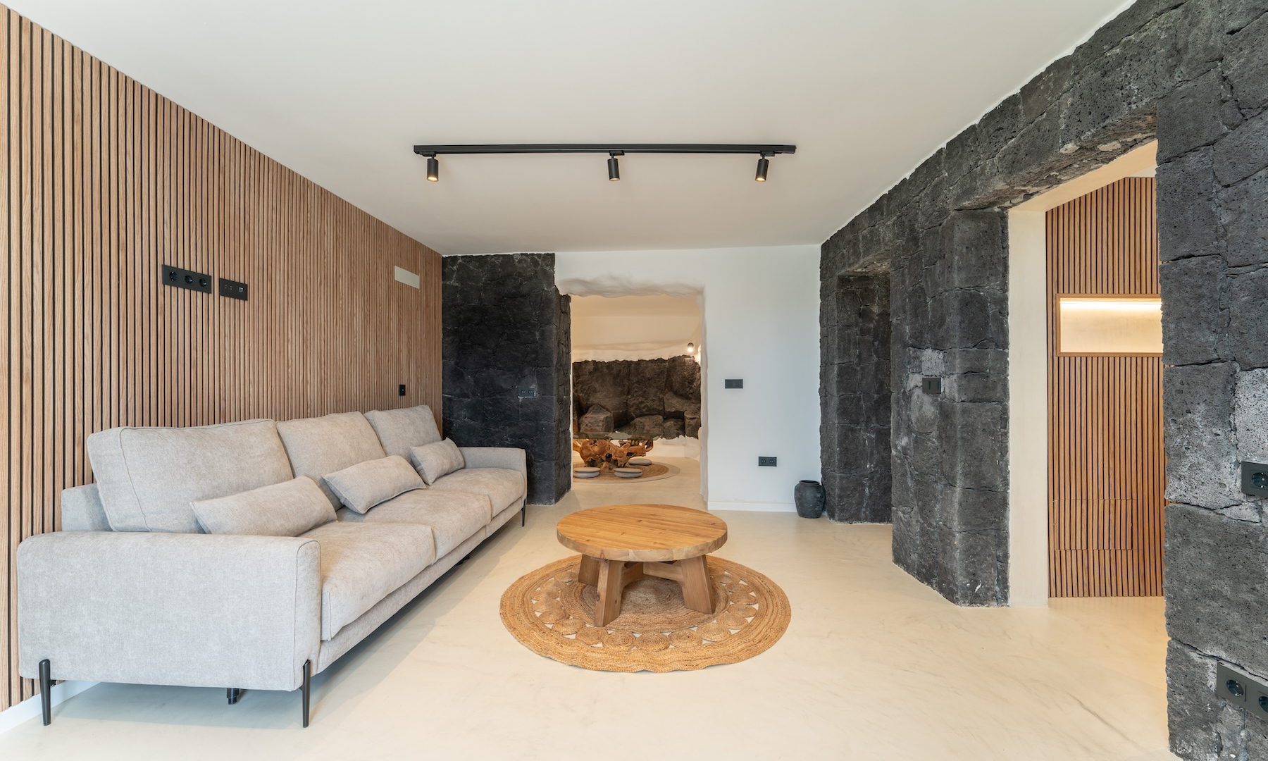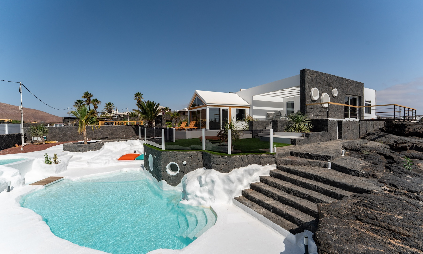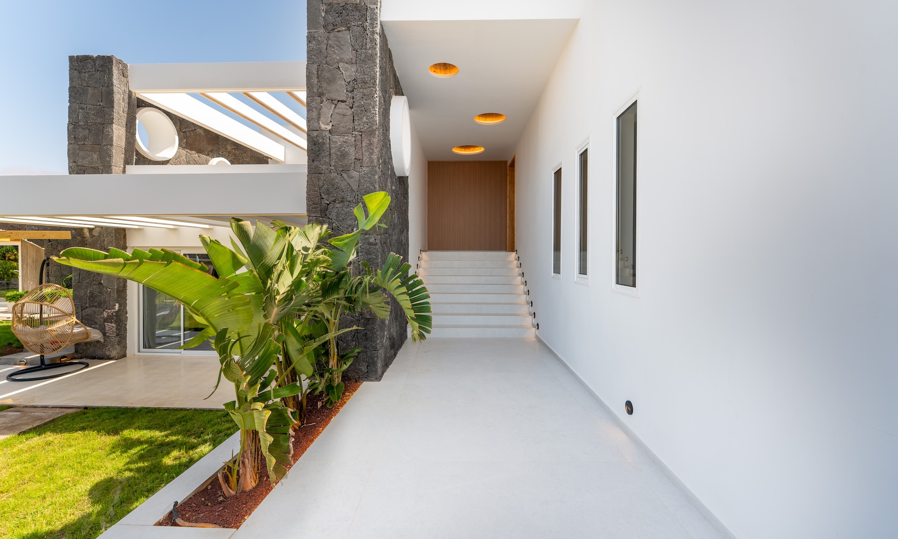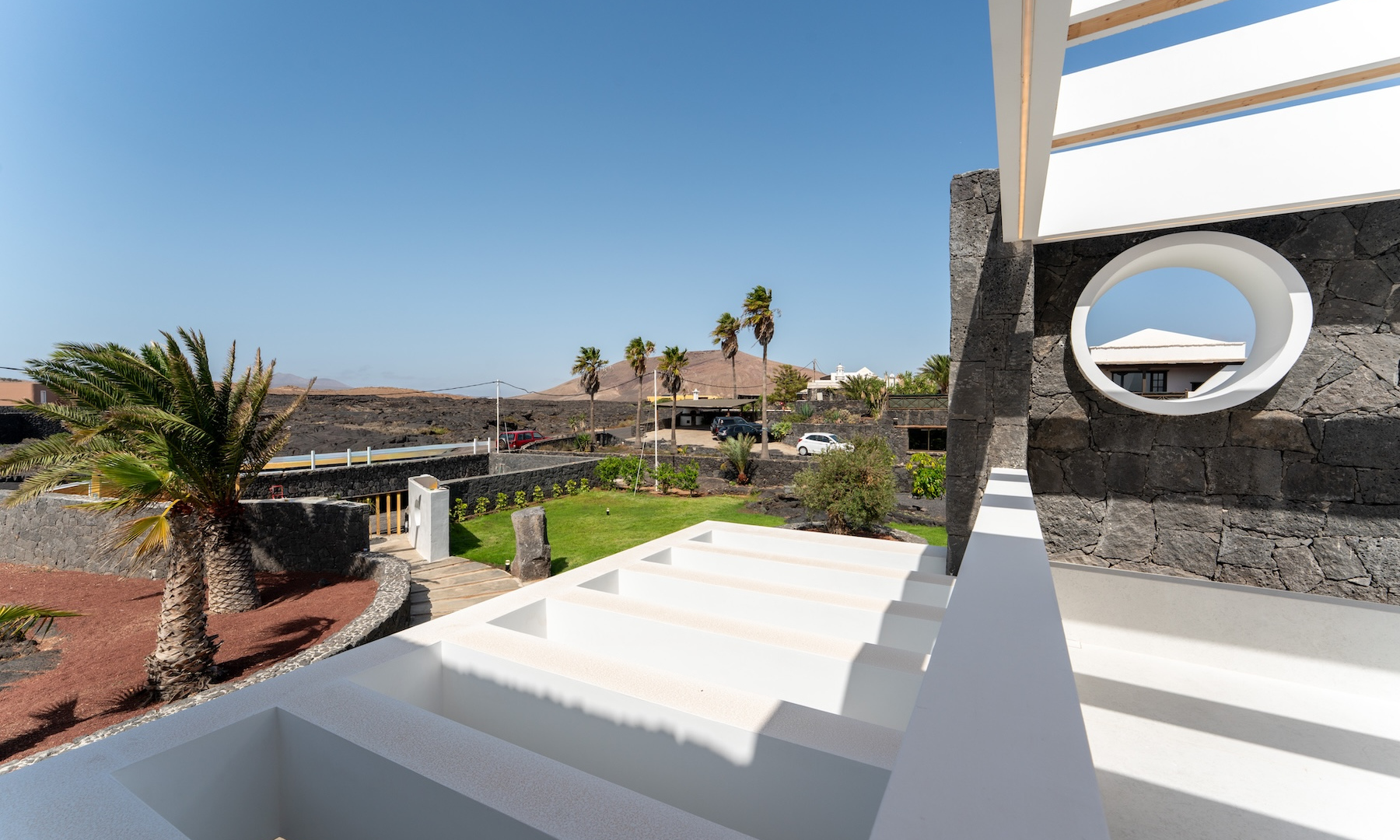 Tmavý čadič a žiarivo biela farba spoločne rámujú priestranné interiéry, ktoré sa otvárajú do tichých átrií, na slnečnú terasu a do záhrady. Dominantou exteriéru je bazén inšpirovaný obľúbenou turistickou atrakciou Jameos del Agua, doplnený o fínsku saunu z nórskeho smreku, ktoré spoločne vytvárajú dokonalé miesto na relax. Energetická efektivita, moderné technológie a ambientné LED osvetlenie sú citlivo integrované a podčiarkujú filozofiu udržateľného, no pritom sofistikovaného bývania.