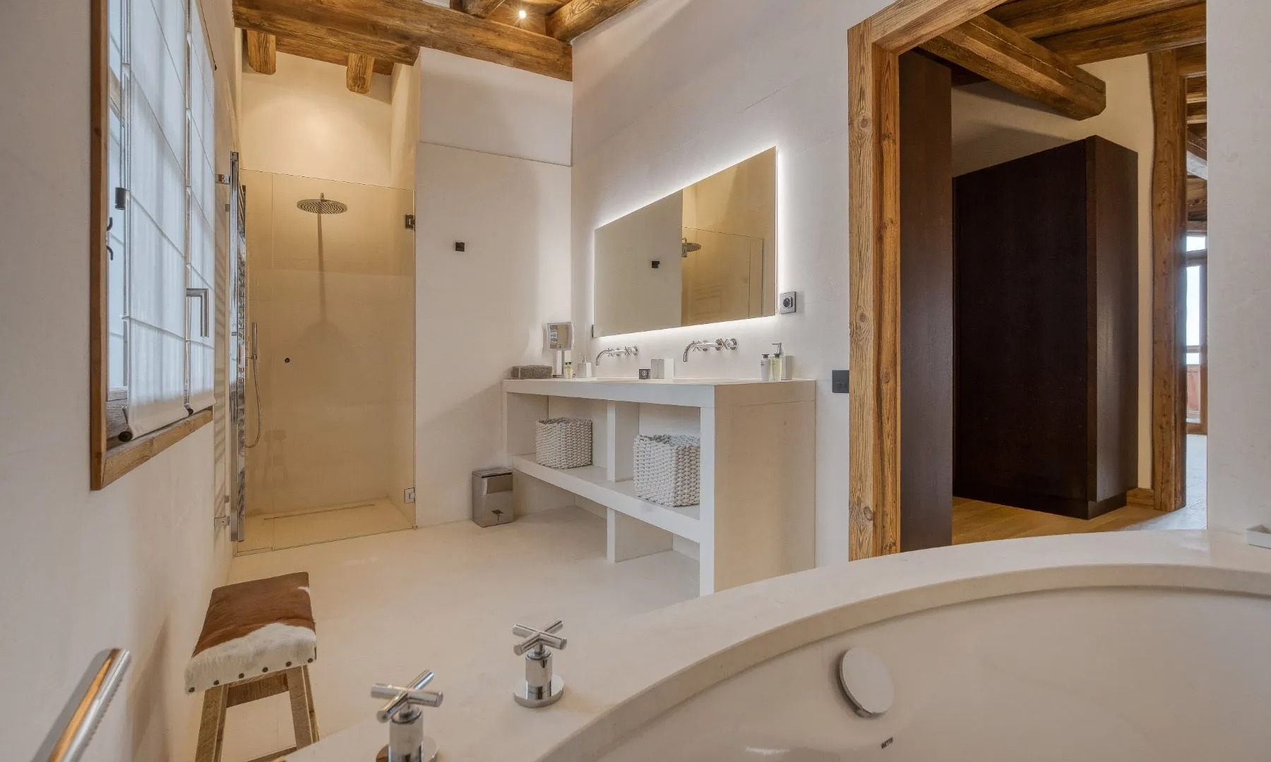 Najvyššie podlažie tvorí luxusný master bedroom trakt pod priznanými trámami, ktorého súčasťou je en-suite kúpeľňa, walk-in šatník a súkromná terasa.