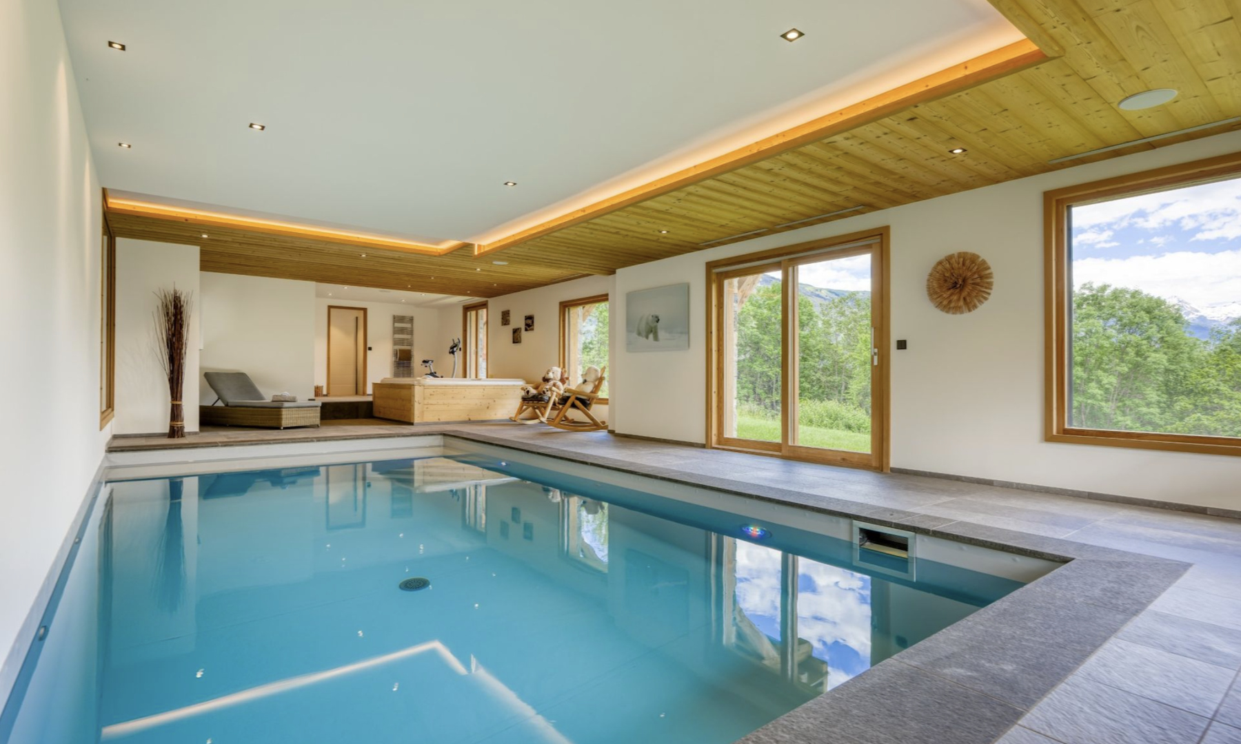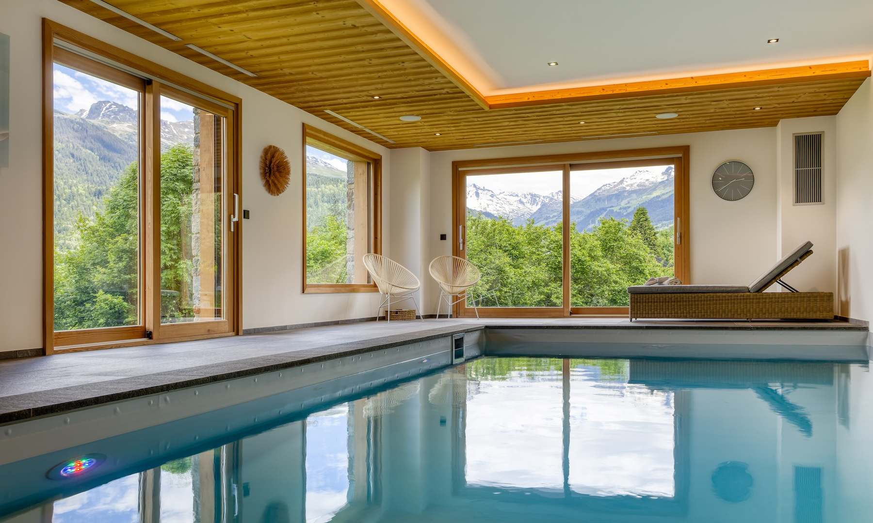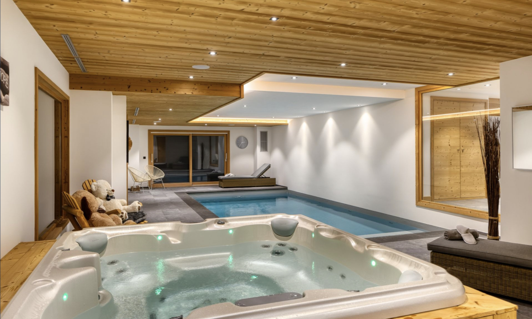 Chalet s úžitkovou plochou 450 m² je navrhnutý s dôrazom na veľkorysosť priestoru, funkčné rozloženie a relax. Vstupné podlažie tvorí wellness zóna s krytým bazénom a jacuzzi, doplnená o fitnescentrum a samostatný apartmán s vlastnou kuchyňou, obývacou izbou, spálňou a kúpeľňou. Súčasťou podlažia je tiež práčovňa a priamy výstup do upravenej záhrady.