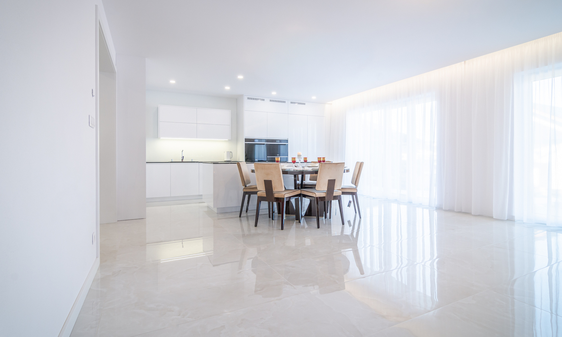 A notable advantage of the residence is its highly versatile layout. Designed as a two-story home with identical floorplans, each level offers a spacious living room seamlessly connected to a fully equipped kitchen with dining area, as well as three private bedrooms, each with its own en-suite bathroom. The ground-floor bedrooms enjoy direct access to a terrace, while those on the upper level benefit from balconies.
