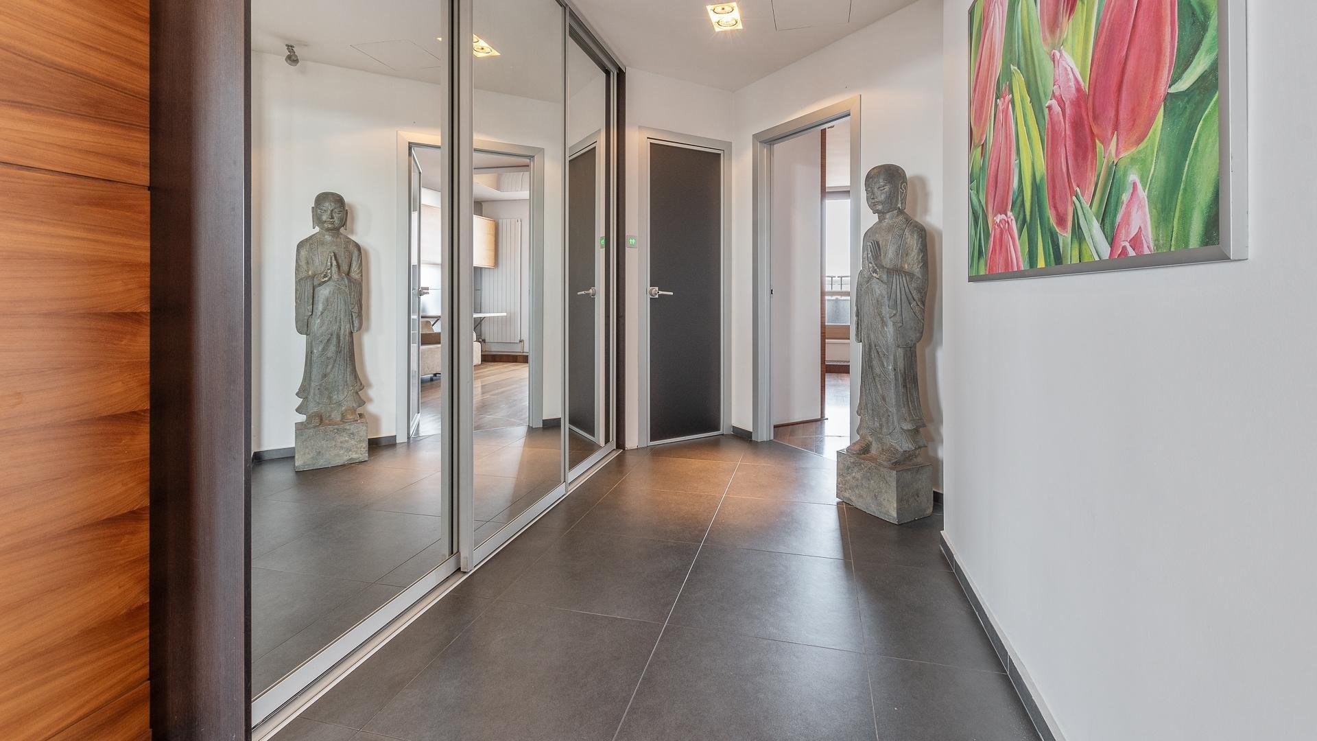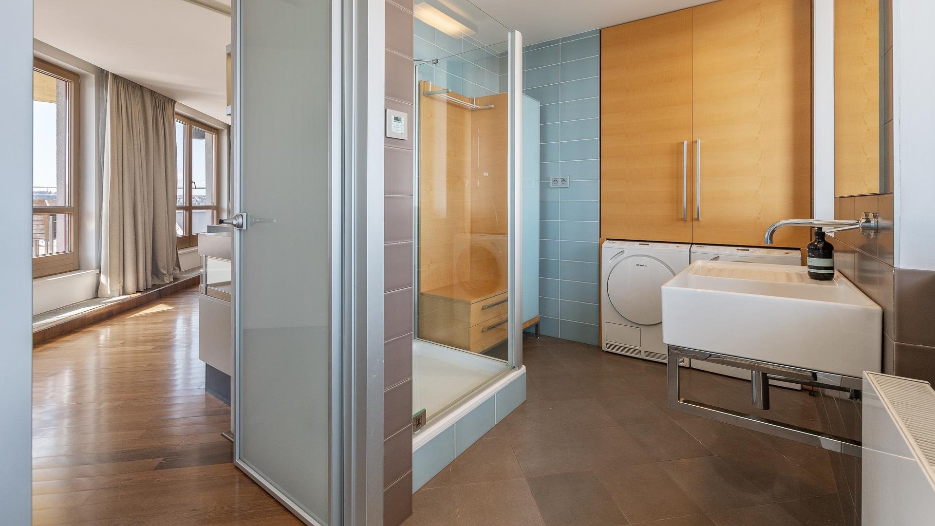 The upper floor (27th) forms the night zone with three bedrooms, each with its own access to a private terrace. The master bedroom impresses with its exceptional space, designer bathroom featuring a solitaire bathtub, hydromassage shower, and an elegant walk-in wardrobe with a glass entrance. The two additional bedrooms are perfect as children’s rooms or home offices and each has its own en-suite bathroom.