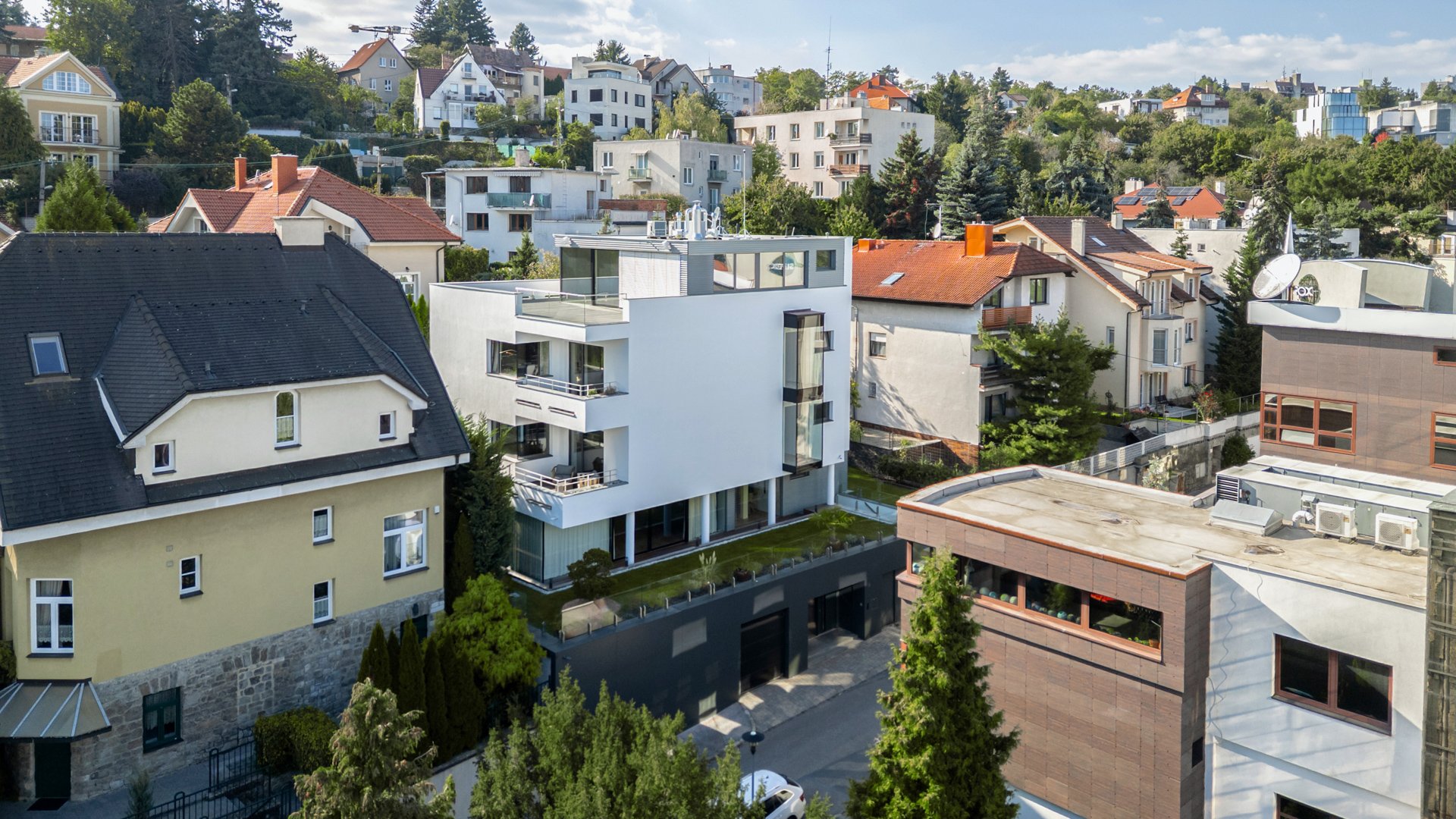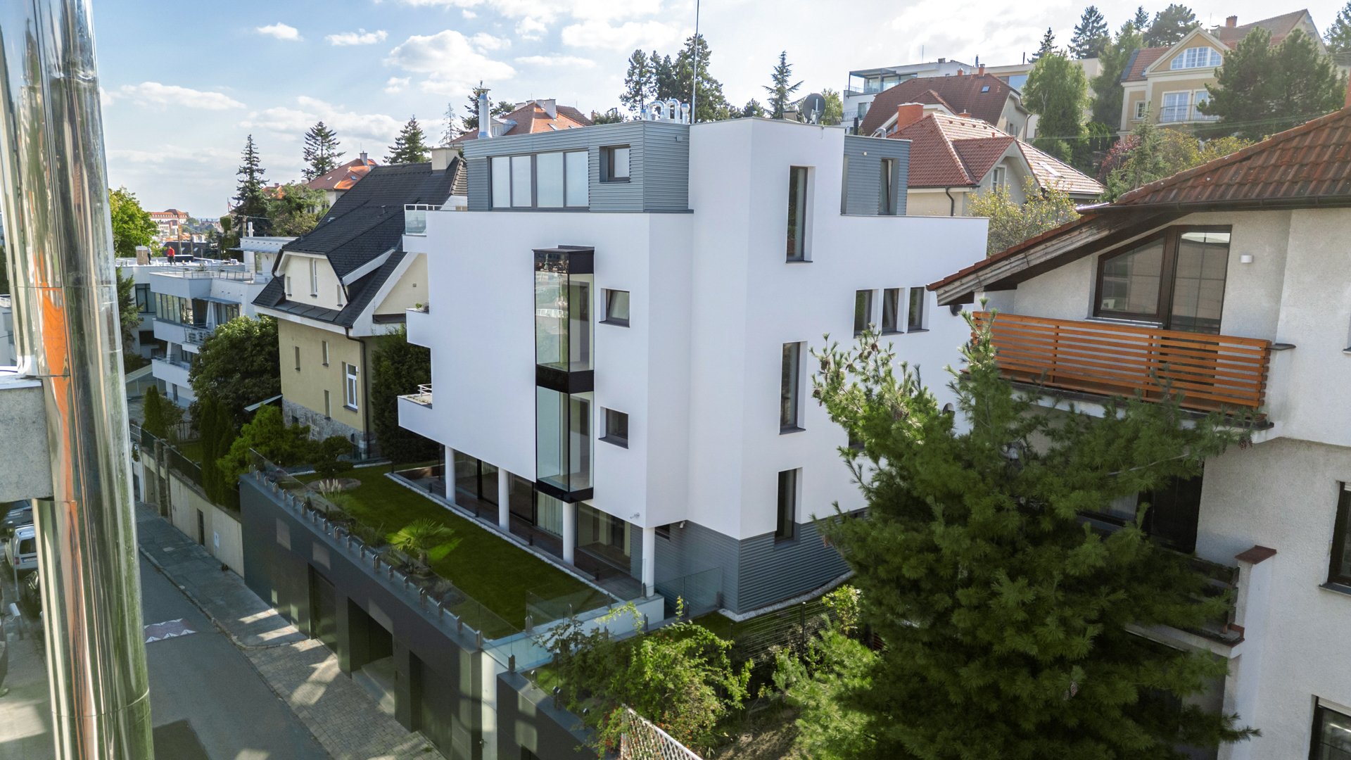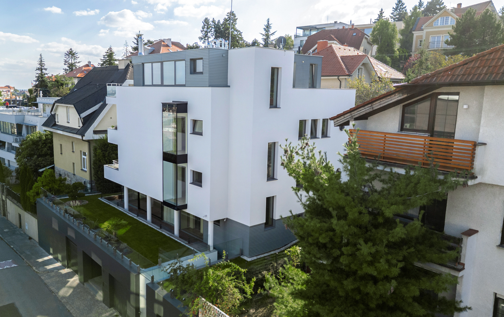 The interior corresponds to a renovated functionalist town villa. The main urban and architectural concept as well as the material solution is based on the use of similar quality materials such as wood, stone, Josko windows or the new insulated aluminium garage doors from Hörmann. For maximum safety and security, the villa is armed with a security system and an intelligent villa solution.
