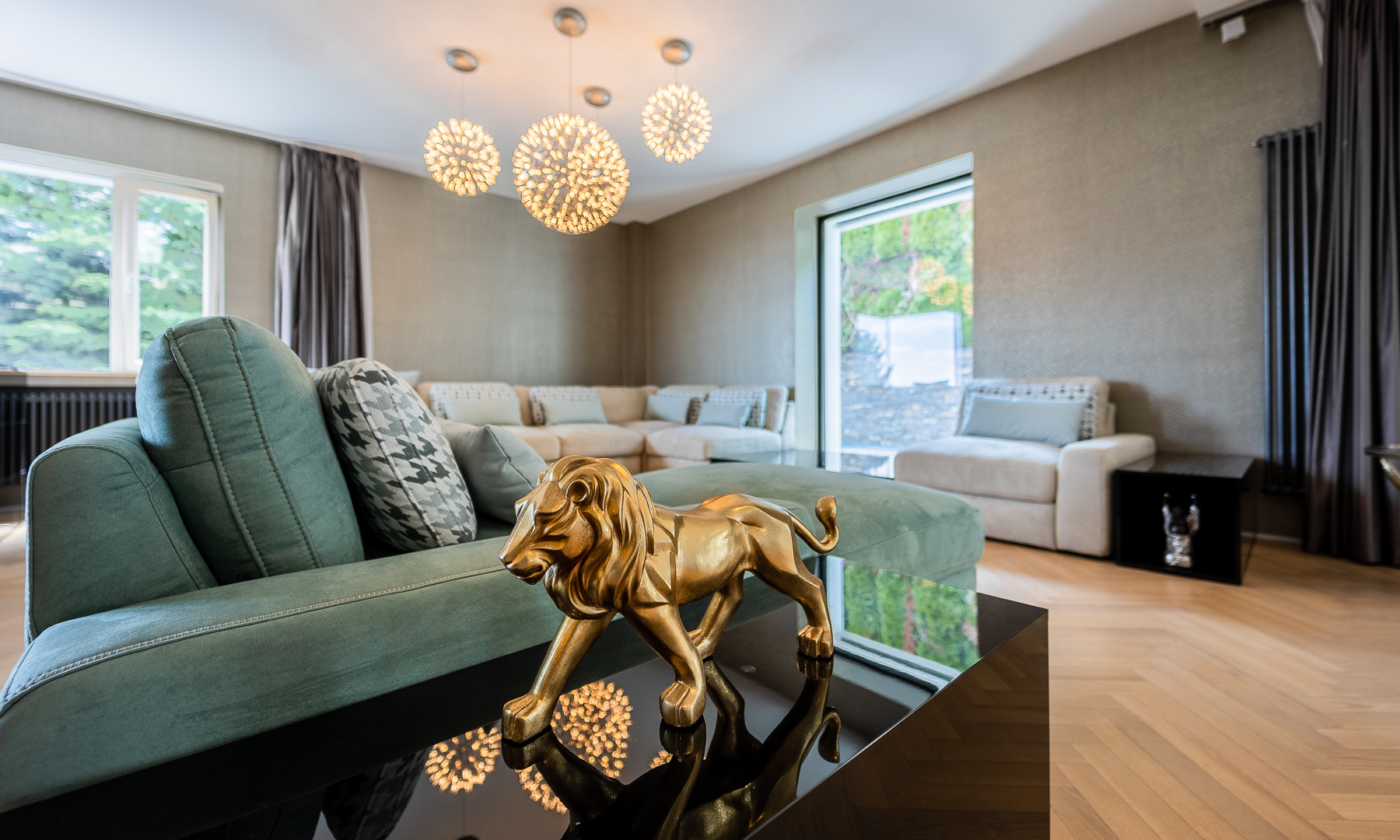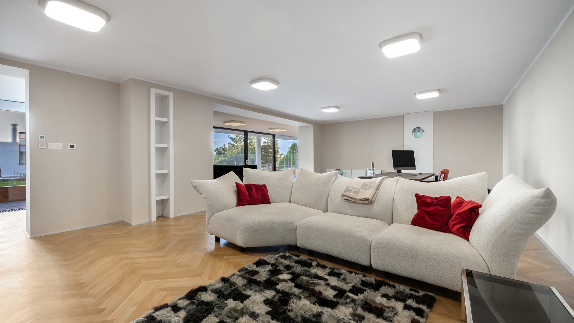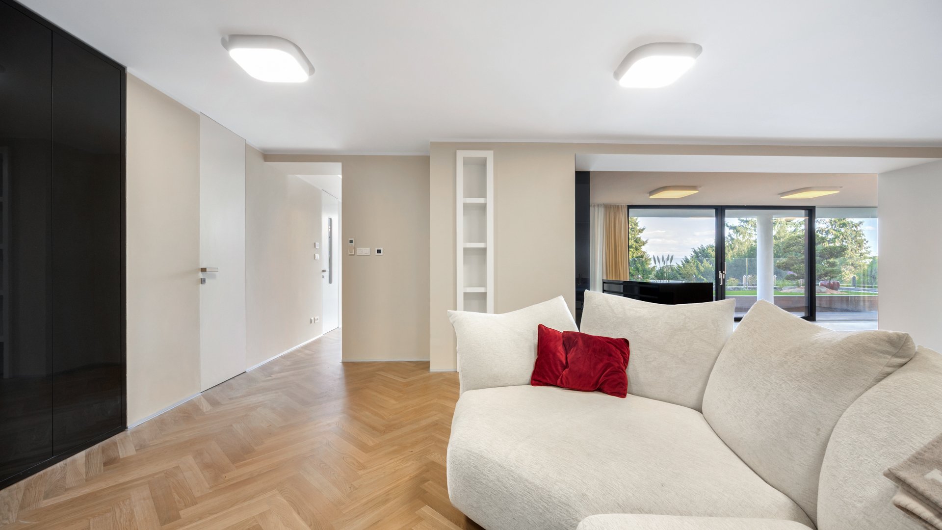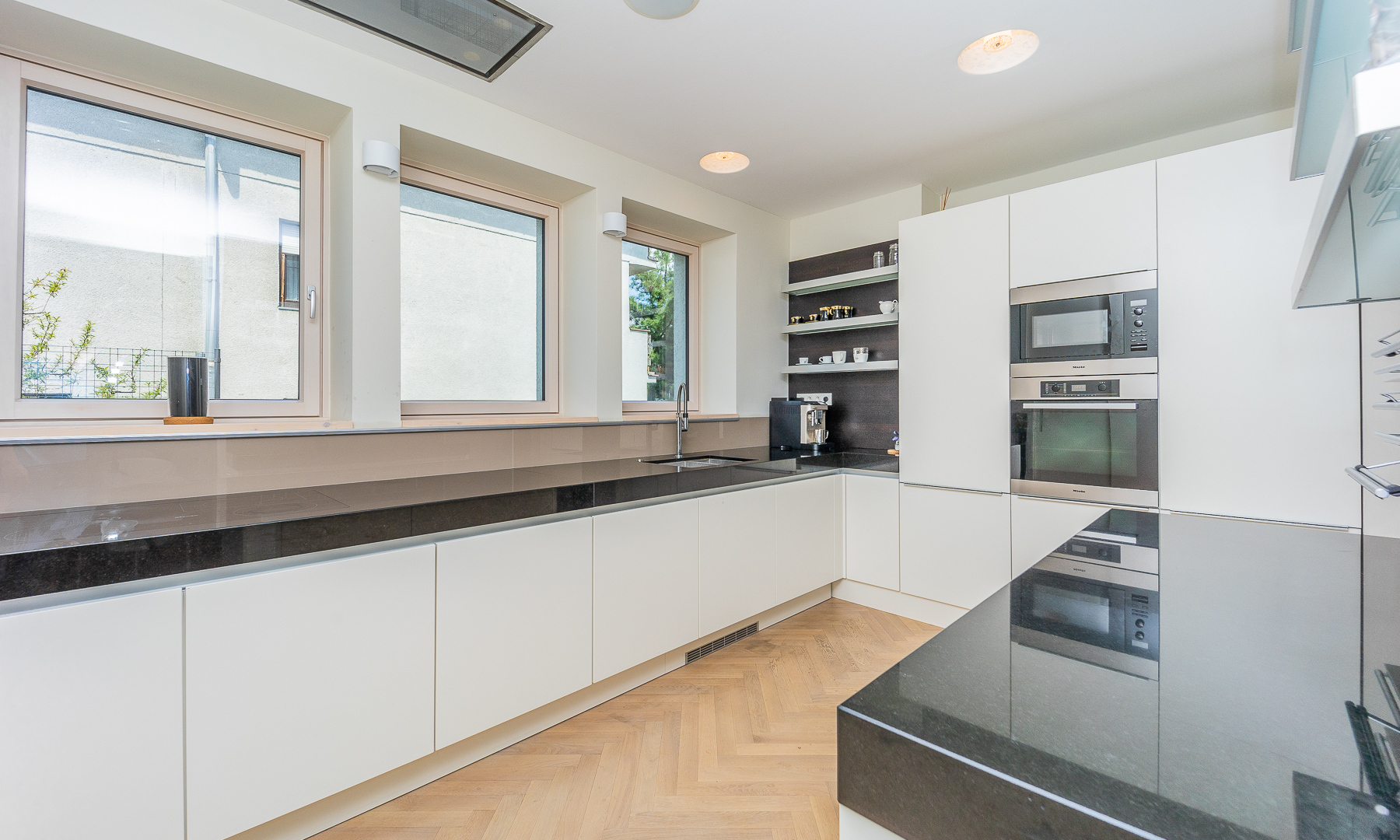 The interior corresponds to a renovated functionalist town villa. The main urban and architectural concept as well as the material solution is based on the use of similar quality materials such as wood, stone, Josko windows or the new insulated aluminium garage doors from Hörmann. For maximum safety and security, the villa is armed with a security system and an intelligent villa solution.