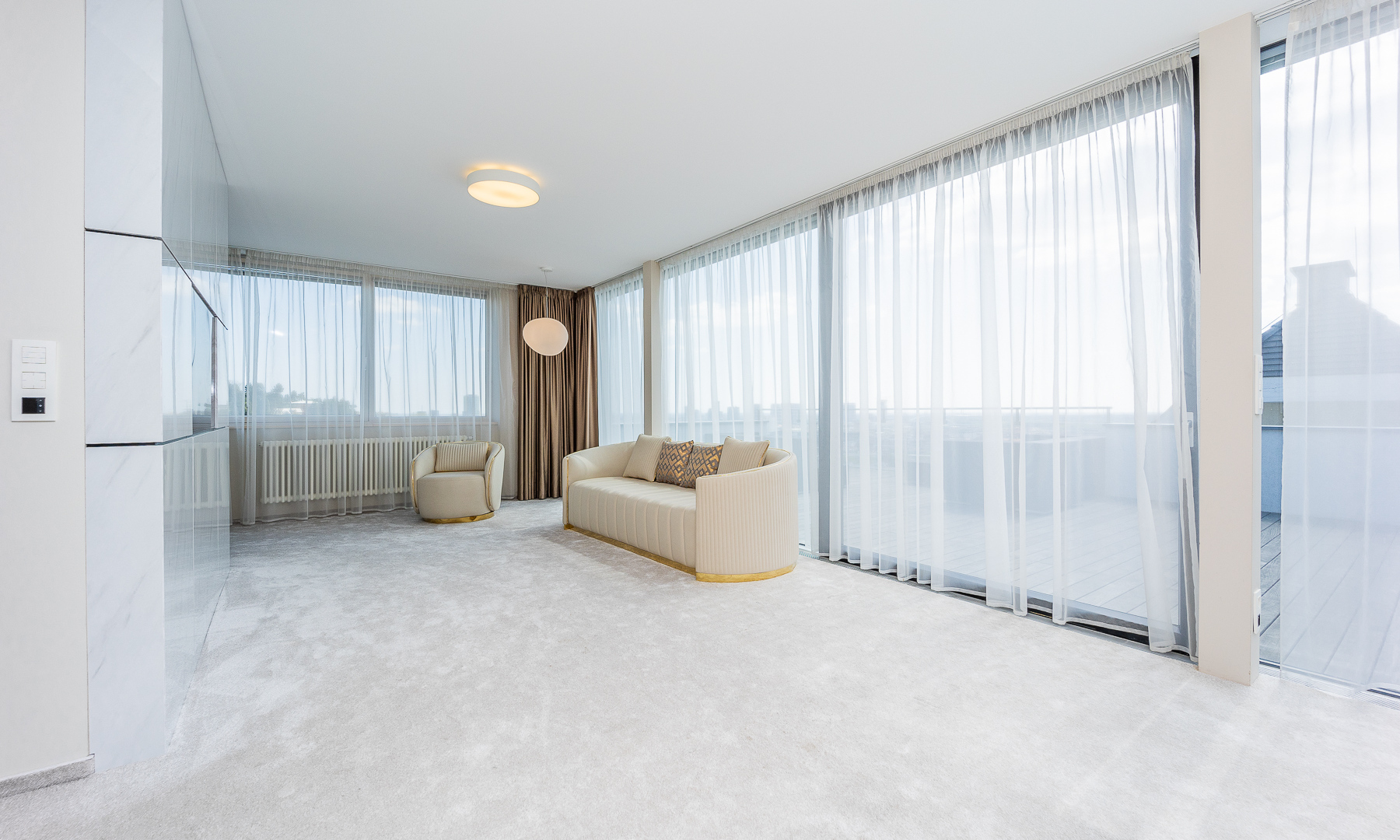 On the third floor there is a spacious living room which has a pleasant relaxation area with a fireplace, a library and comfortable seating in pastel tones. The social area also has a dining room with a passage to the kitchen with pantry. The kitchen is fully equipped with Miele appliances. It benefits with direct access to the sun terrace with swimming pool, which despite the fact that the property is located in the Old Town, offers plenty of privacy. The truly generous space of the social area with an area of 70 sqm offers a timeless combination of modern design in combination with a touch of old town housing underlined by for example wooden parquet in the shape of “herringbone”.