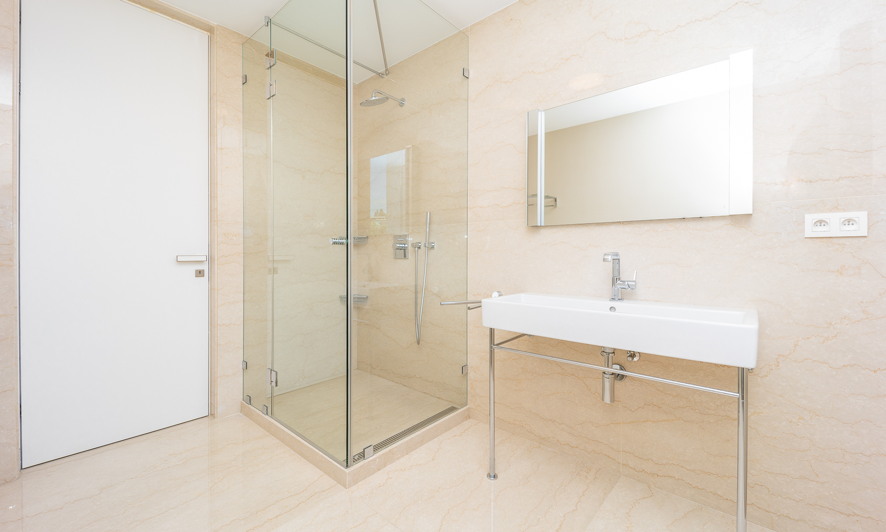 The second floor is dedicated to the relaxation and work area which includes a home cinema, a Finnish sauna with facilities, a bar area and a study with direct access to the terrace which seamlessly connects the interior with the exterior. There is also a technical background of the villa (technical room, laundry). The whole space is built with largewindows, thanks to them the whole space seems airy, with plenty of daylight.