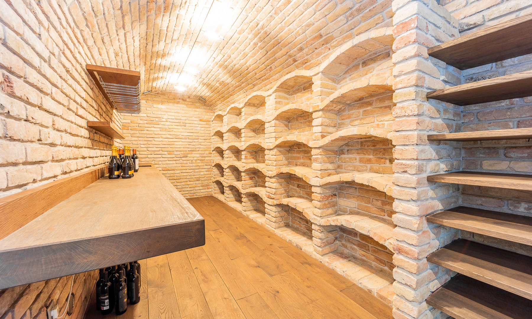 The first floor serves as a spacious elegant entrance hall, but also has a double garage, one separate garage, toilet and an authentic wine cellar, whose vaults and brick base create an exceptional atmosphere.